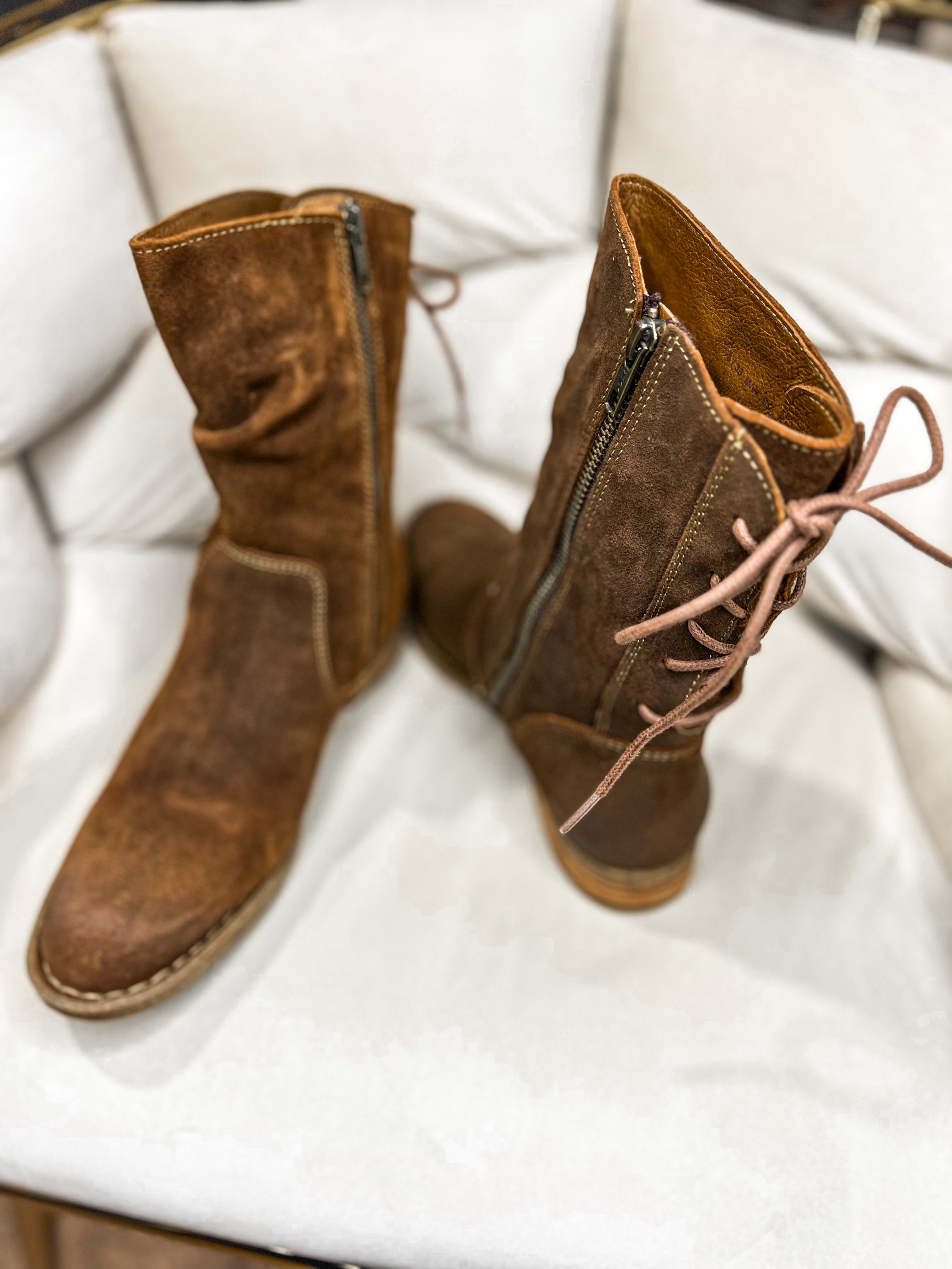 Step into cozy luxury with our Shasta boots in rich brown suede! These mid-calf beauties feature playful back laces for a custom fit and an easy-access inner zipper. Crafted from soft, hand-distressed suede and lined with breathable suede-leather blend, they pamper your feet with a removable cushy footbed packed with extra foam. The lightweight cork-infused rubber sole offers traction and flexibility, all brought together with charming Opanka handcrafting. Ready to make every step feel effortlessly cool and comfy?
