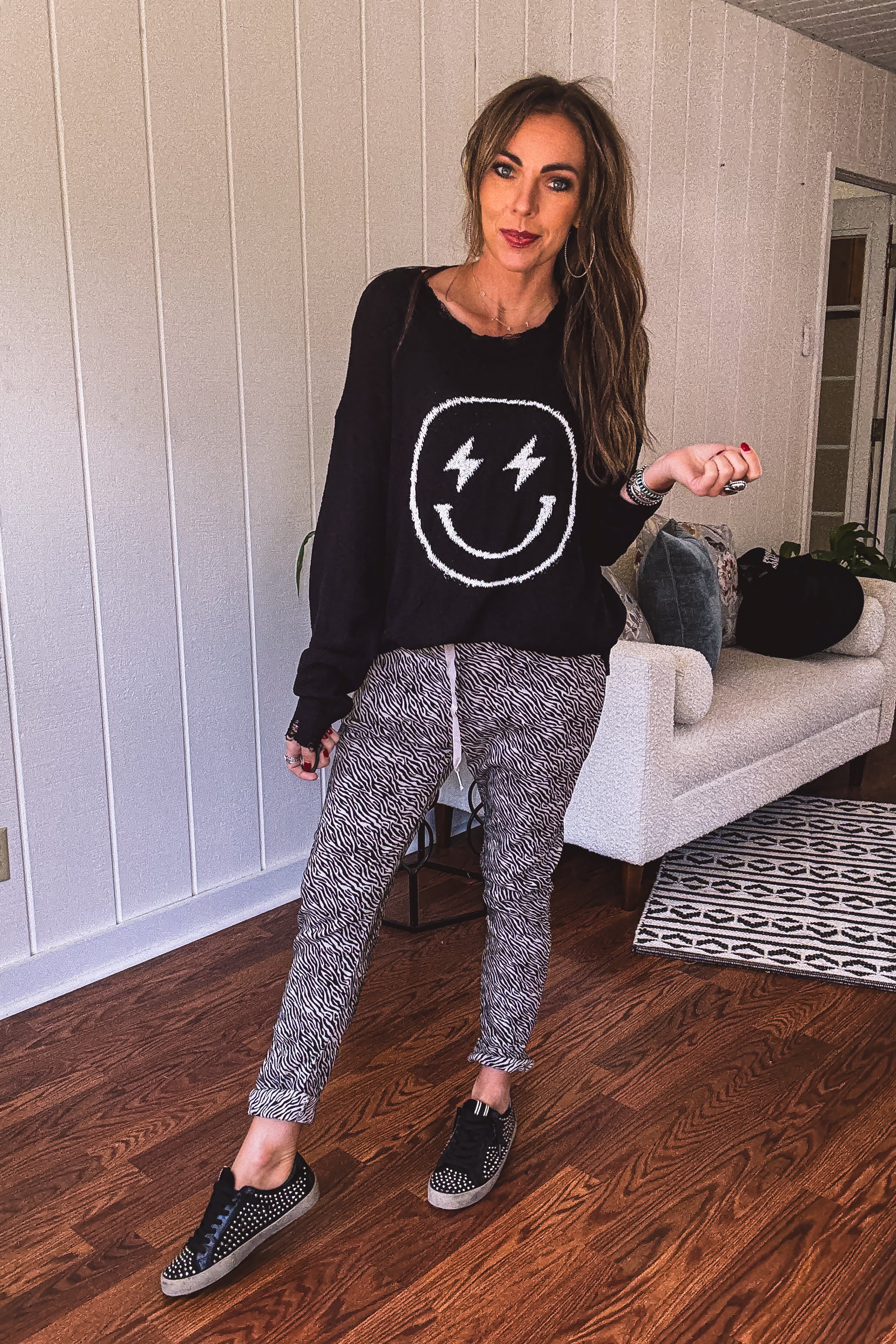 A little wild, a lot of style, these jeggings from Italy Moda, our customer favorite Italian line, are a classic tapered jogger with an elastic, drawstring waist, functional side and back pockets and a stretchy fit for body hugging comfort. The zebra print in black and taupe makes a fashion statement that is both classy and sassy. Pair with  your favorite black tunic, sweater or cardigan and make a statement.