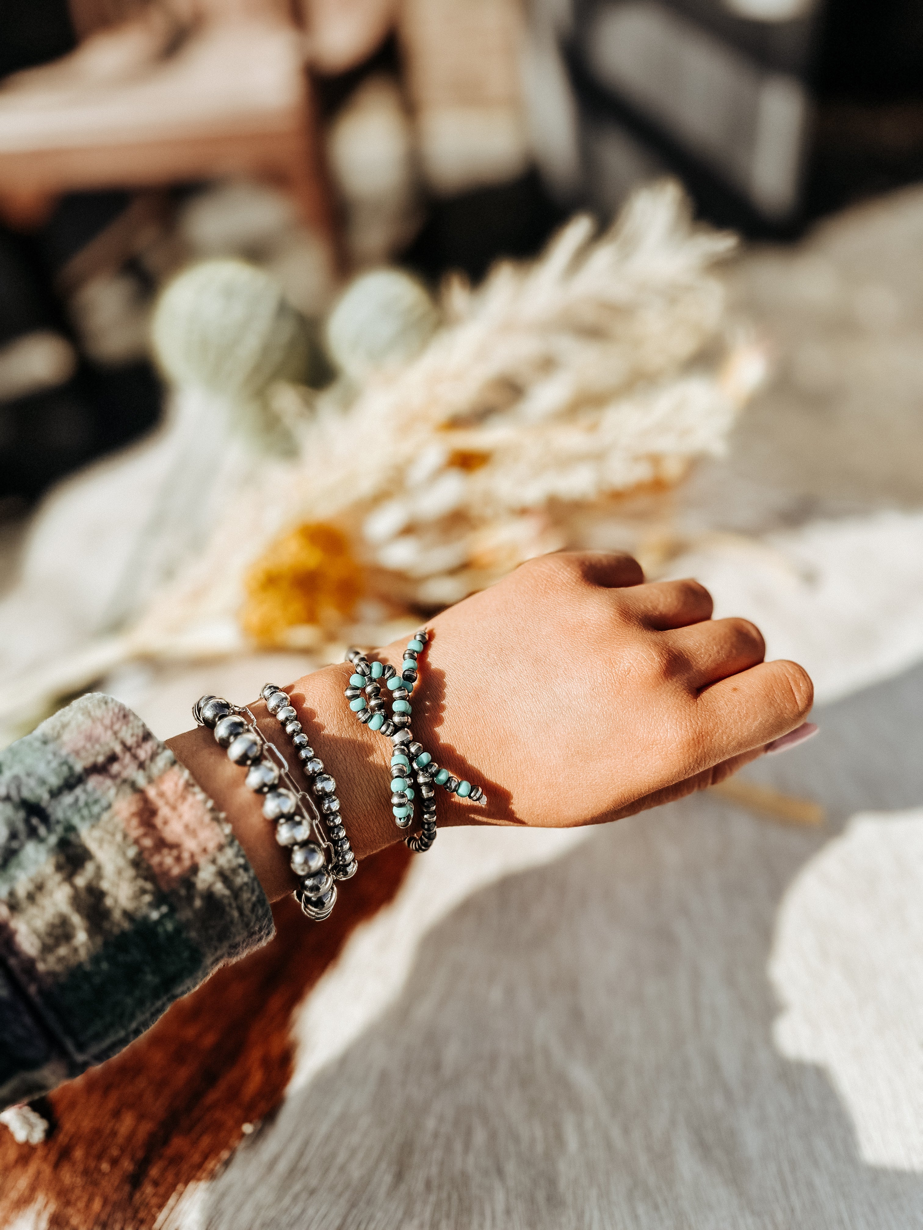 A sweet and unique twist on the already classic Navajo Pearl stretch bracelet. This 7" Sterling Silver Navajo Pearl bracelet features a bow with alternating Navajo Pearl and authentic Turquoise beads for a delightful and eye catching addition to your collection!