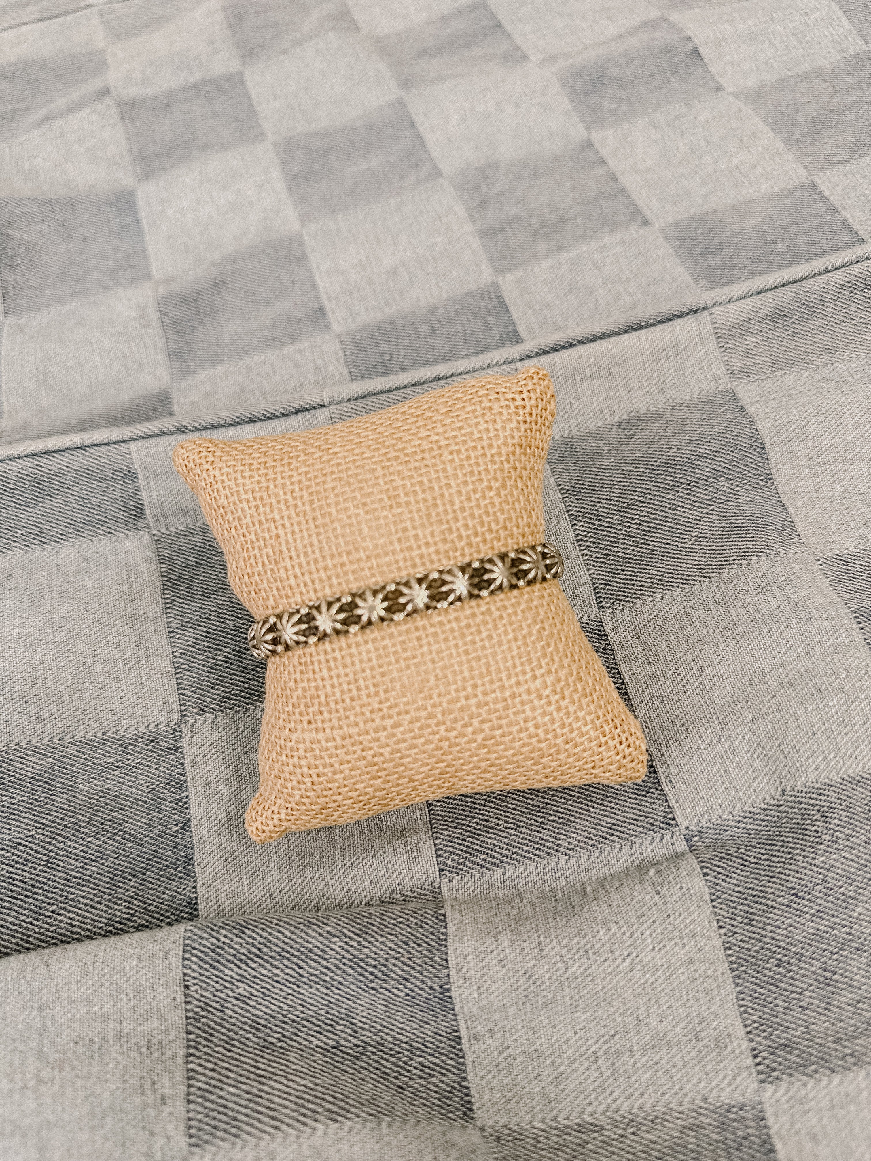 Crafted from authentic Sterling Silver, this cuff boasts intricate hand crafted concho details for a western vibe for any outfit. The oxidized background adds an edgy touch to this versatile cuff that can be worn with any 'fit. Wear it alone as a statement piece or stack it with Navajo Pearls or Turquoise pieces for a unique and gorgeous vibe. Elevate your style and embrace your inner risk-taker with this ranchy piece.