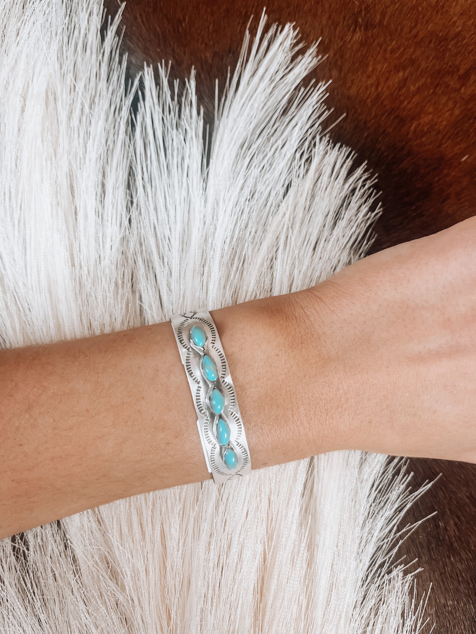 Crafted from genuine Sterling Silver, this stunning cuff boasts a striking Western etching design and 5 Authentic Kingman Turquoise stones in diamond shapes. Its slim and lightweight construction makes it perfect as a bold accessory on its own, or it can be paired with our Navajo Pearl bracelets or Sterling Silver bangles for a strikingly edgy and stacked look.
