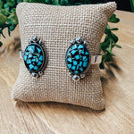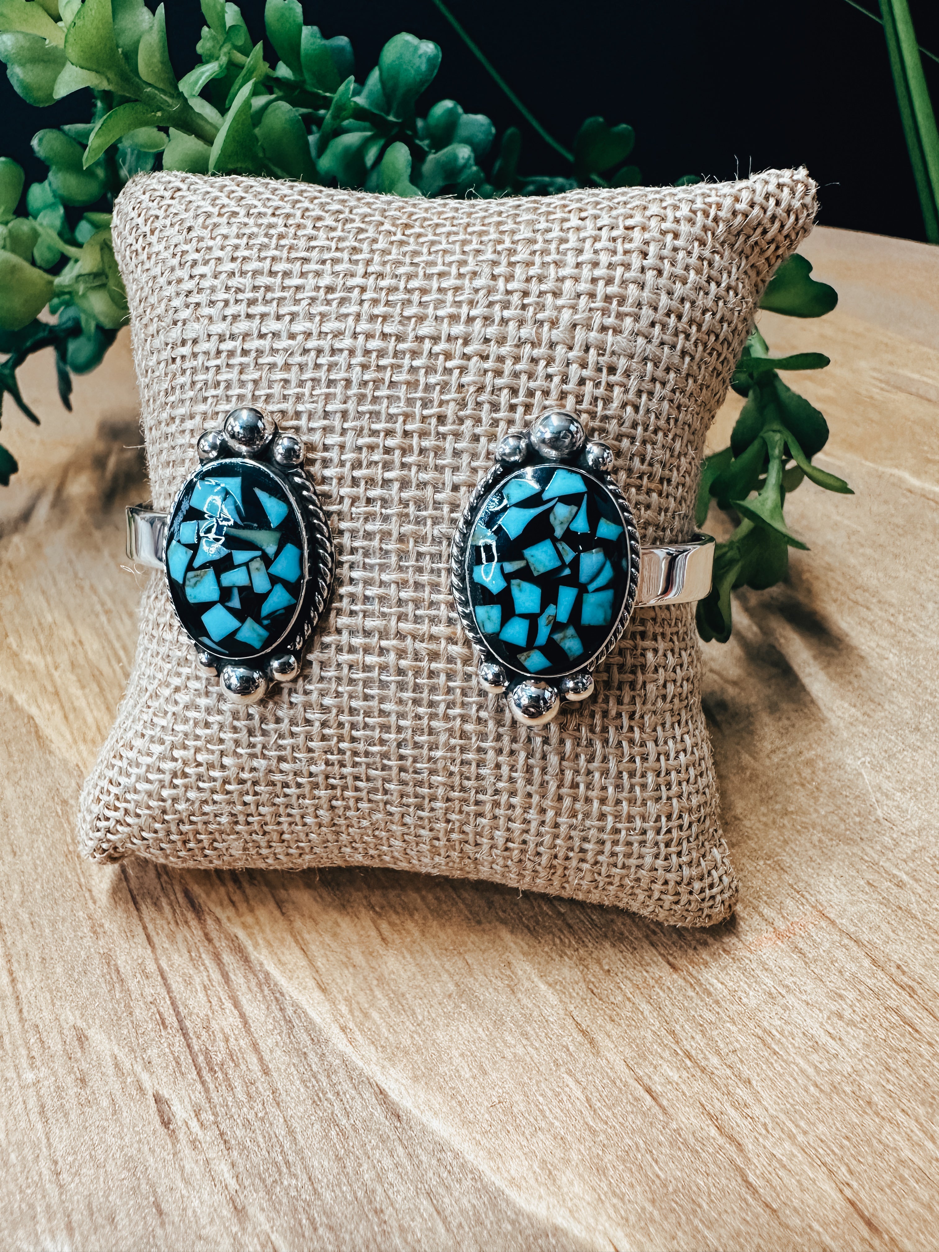 Discover the one-of-a-kind beauty of this Mosaic Onyx Turq Chip Cuff, featuring a band of Authentic Sterling Silver ending in two handcrafted inlay ovals of authentic Kingman Turquoise and Onyx in a unique mosaic pattern. Wrapped in a sterling silver mount showcasing a rope pattern and a crown of three silver dots, this bangle exudes a romantic and vintage vibe.