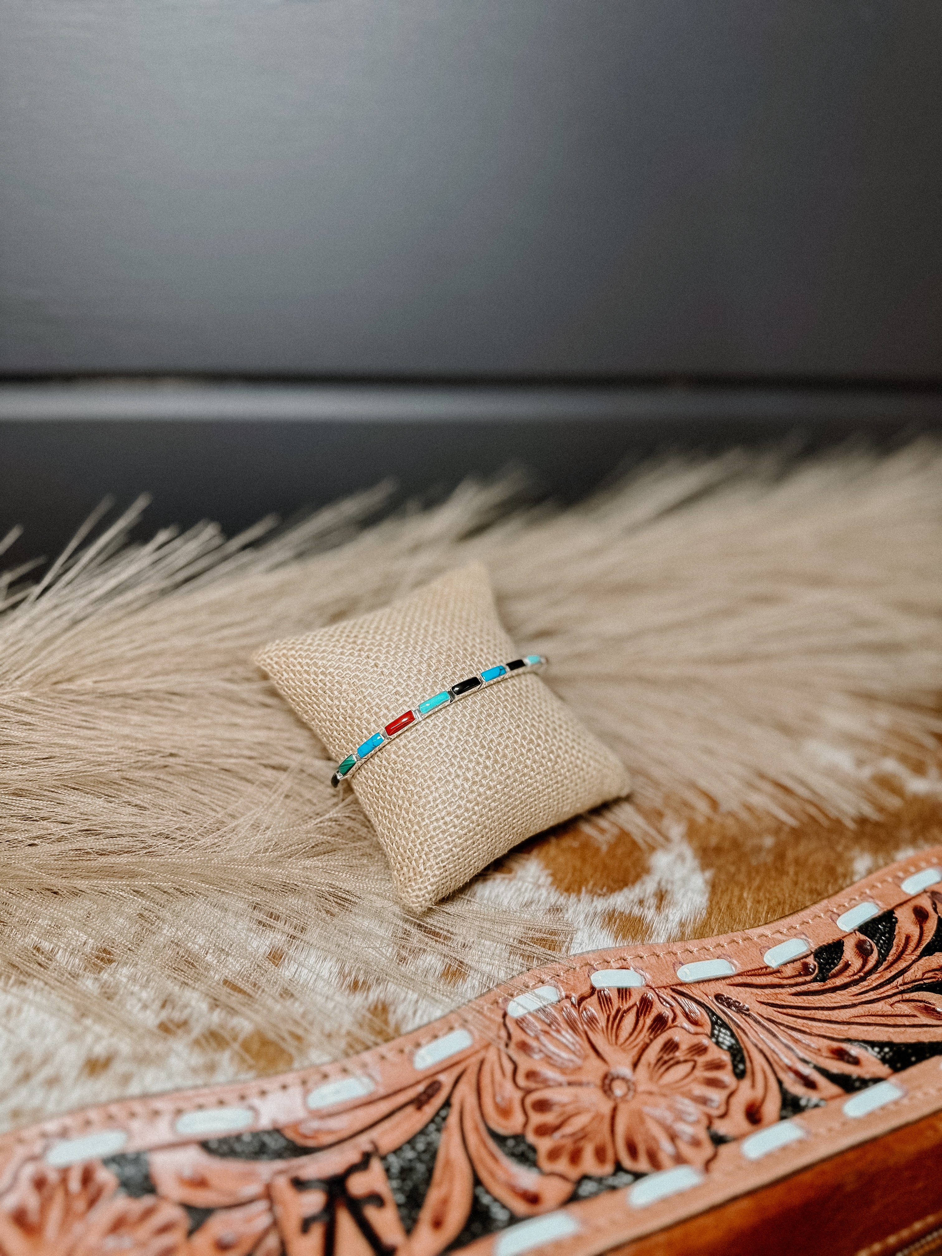 Experience the unique beauty of the Multi Chicklet Inlay SS Cuff, featuring 15 stunning stones such as Kingman Turquoise, Red Jasper, and Onyx set in authentic Sterling Silver with a sleek chrome finish. It's a must-have accessory for any outfit, with its lightweight and flexible design that fits any wrist perfectly. Don't miss out on this one-of-a-kind stunner!