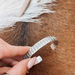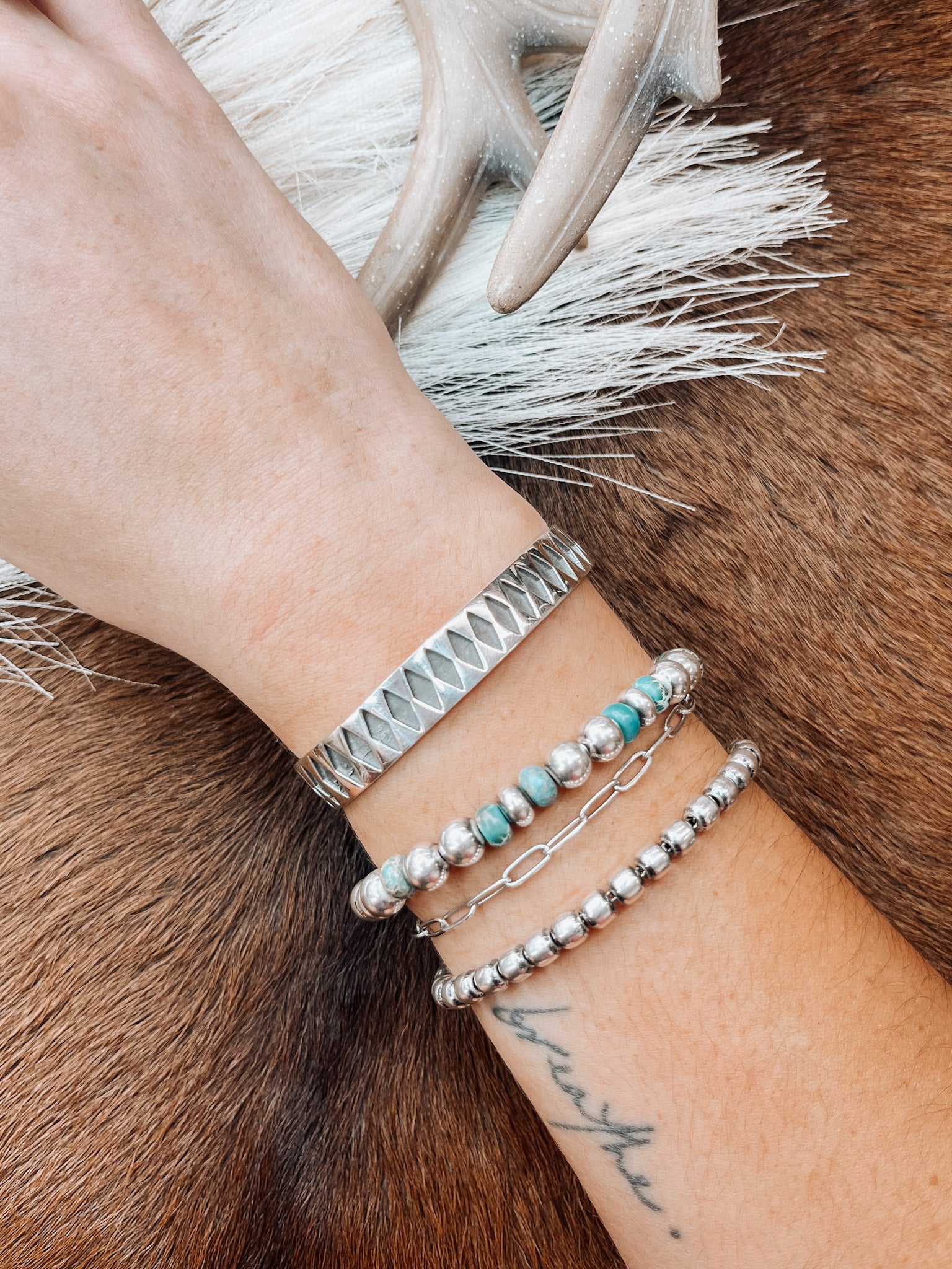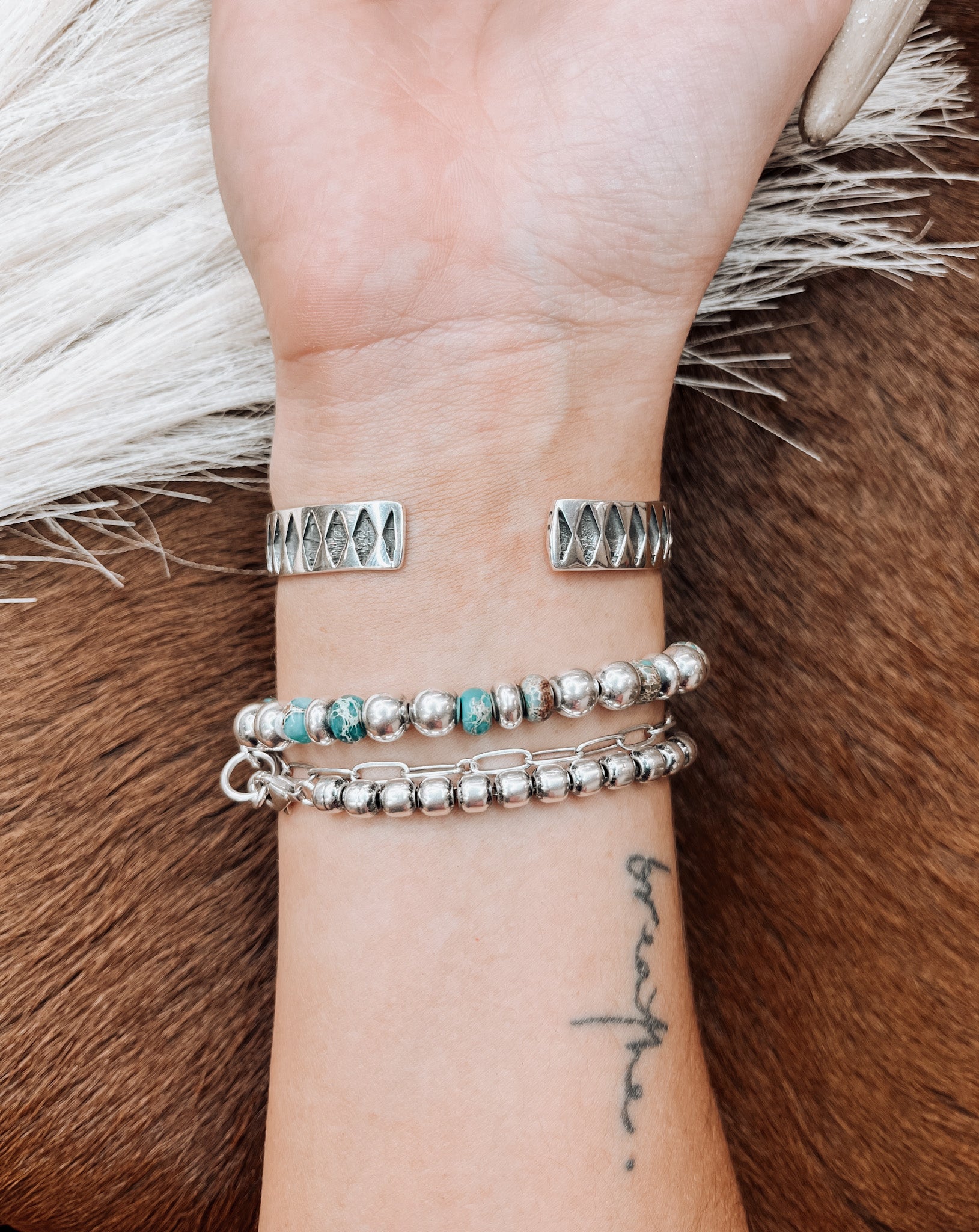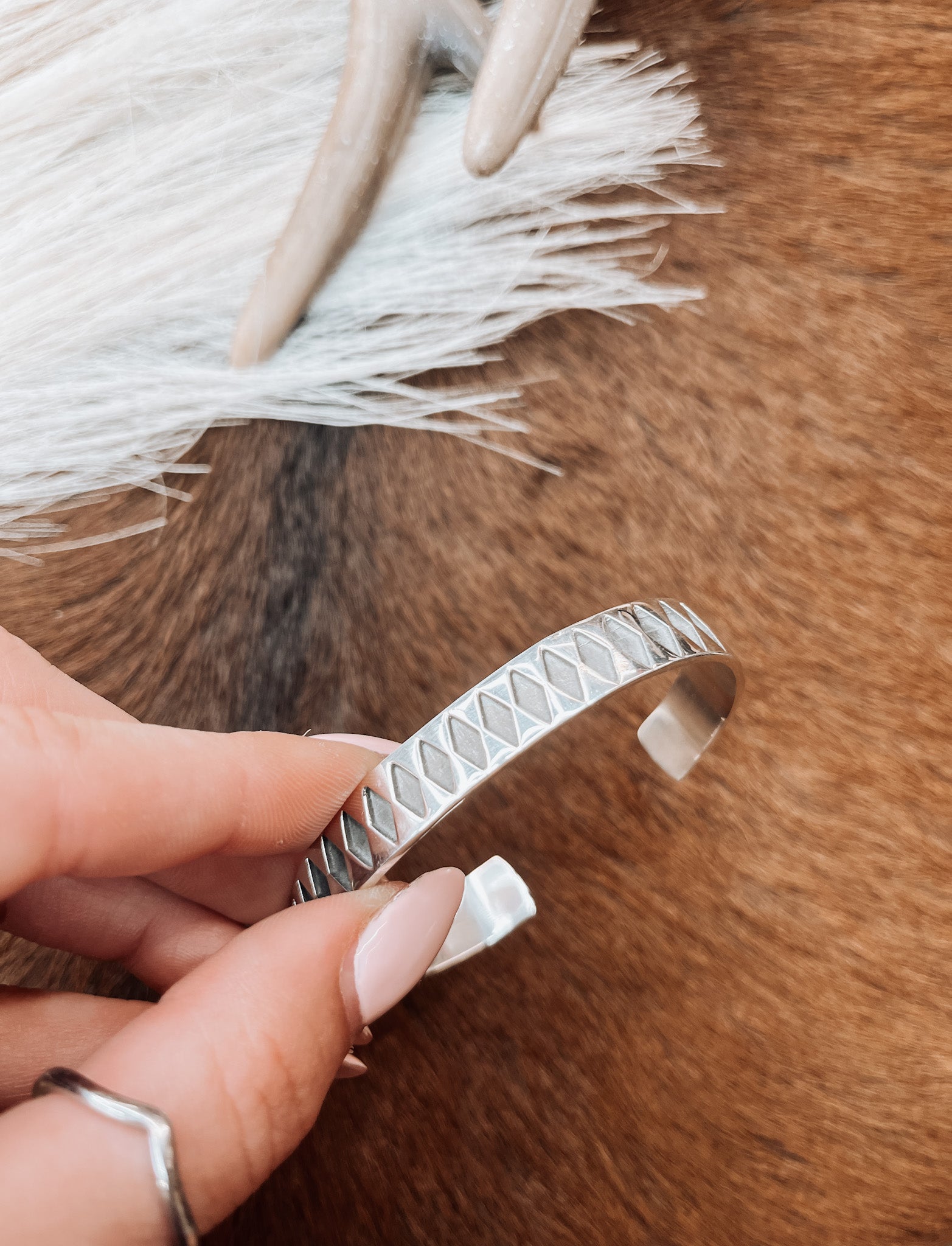 This stunning Oxidized Diamond Cuff is hand-crafted from genuine Sterling Silver and features an inlaid diamond design. Versatile and stylish, it pairs perfectly with other Sterling Silver or Turquoise bangles and cuffs. Embodying sleek simplicity and chic beauty.
