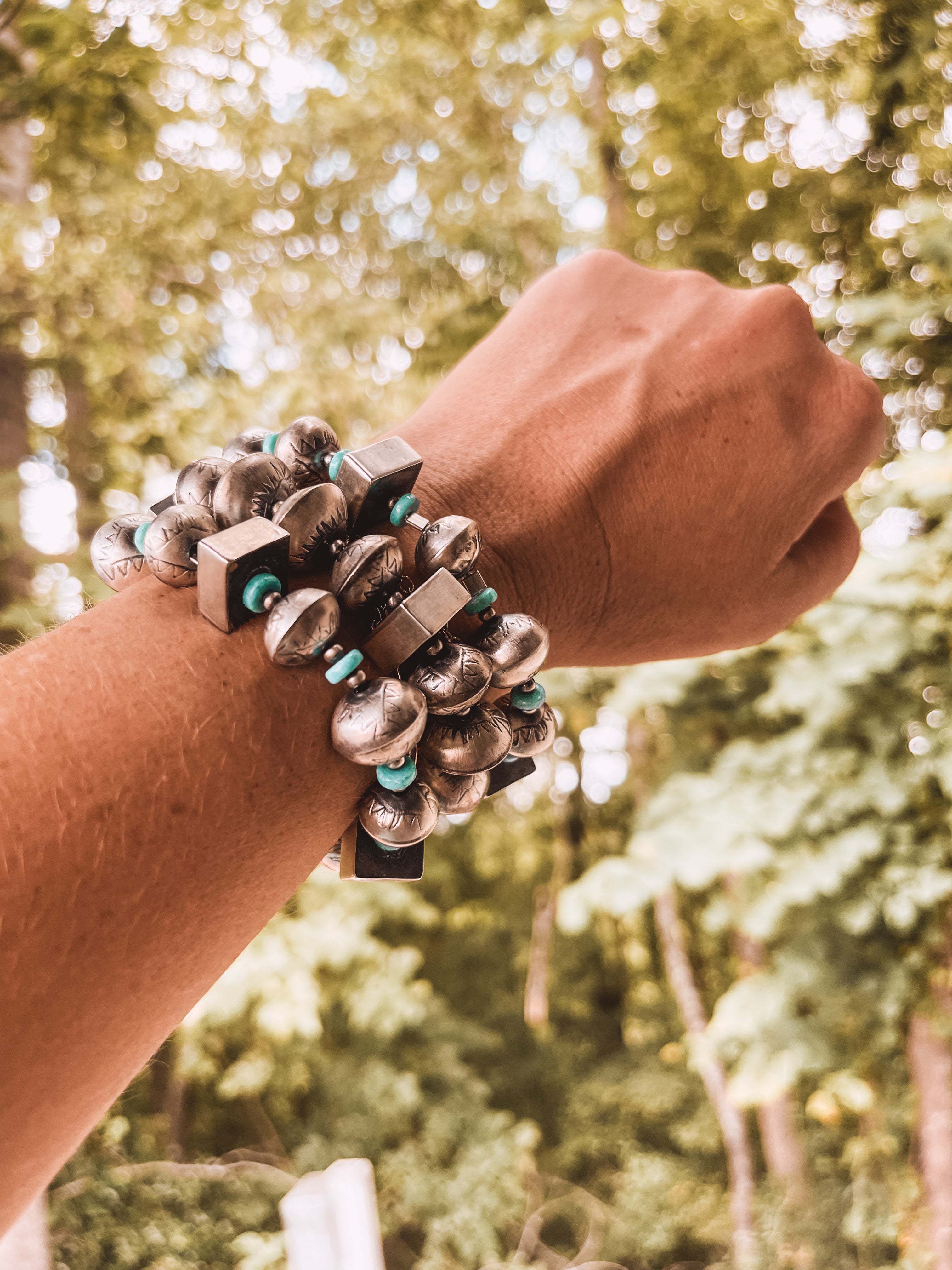 This stunning Saucer Square SS Stretch Bracelet is a must-have accessory for any jewelry lover. Its unique design features etched square and mix cylinder beads, all crafted from authentic Sterling Silver alternated with authentic Kingman Turquoise stones. With its stretchy design, it is comfortable to wear and makes a bold statement. Elevate any outfit with this beautiful bracelet!