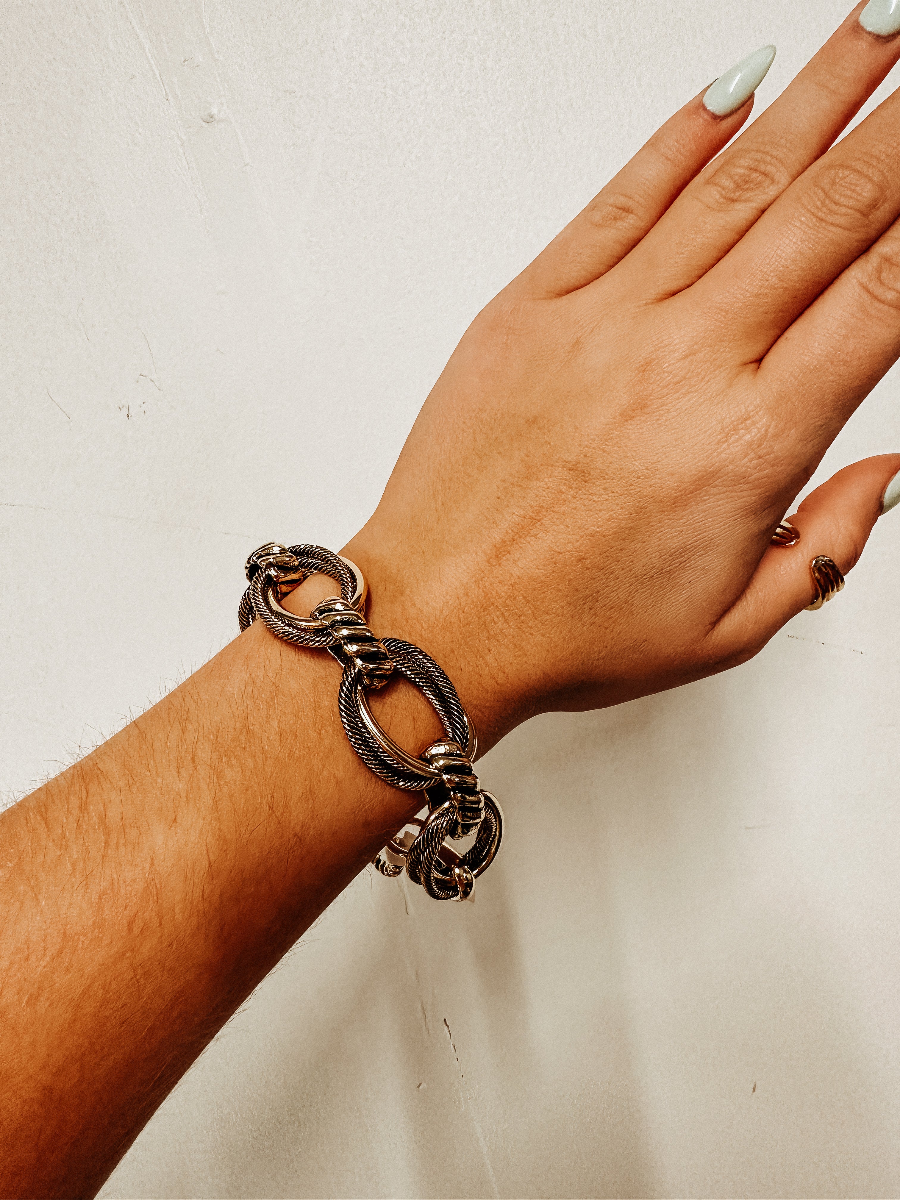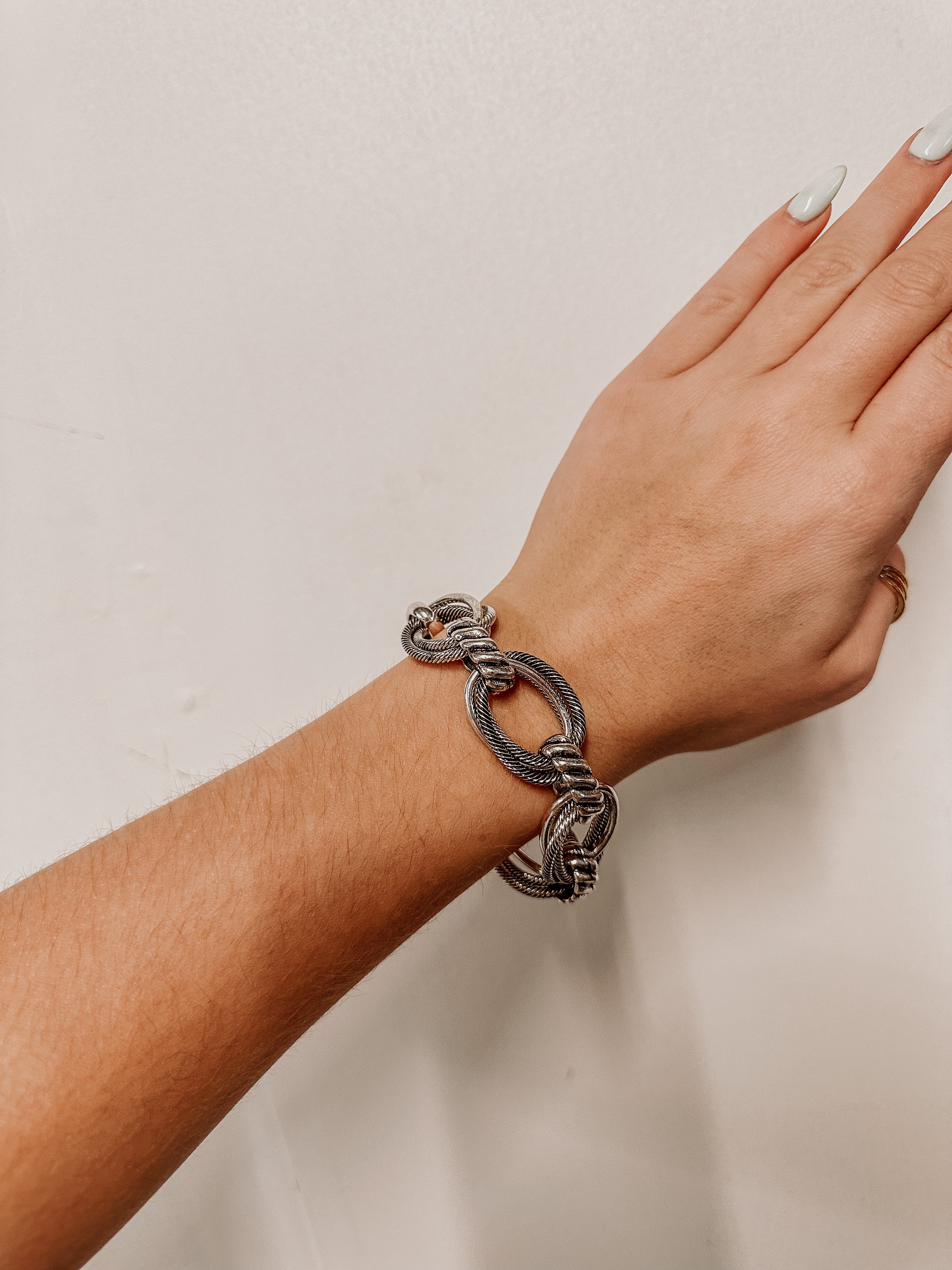 Make a statement with the Triple Oval Toggle Bracelet—a bold, chunky piece that draws all eyes. Oversized oval ropes linked by elegant twists create a striking design, secured with a classic toggle closure for easy wear. Choose from dazzling faux gold or sleek faux silver to match your mood or outfit. Perfect as a standout accessory on its own or layered with your favorite bracelets, it adds a playful touch of glam to any look. Whether dressing up or keeping it casual, this bracelet brings fun and flair to your jewelry collection.