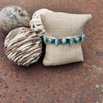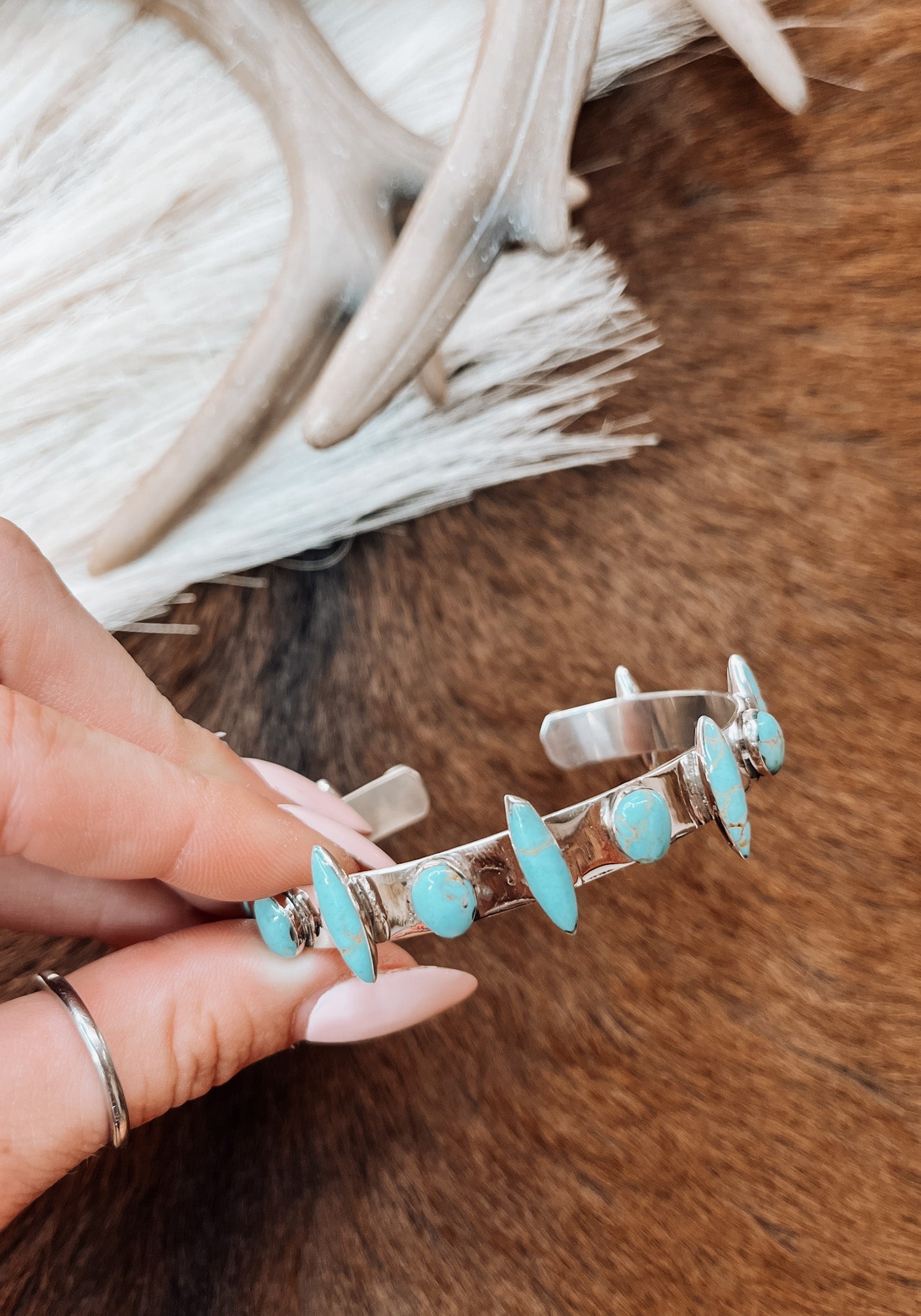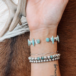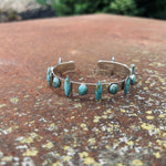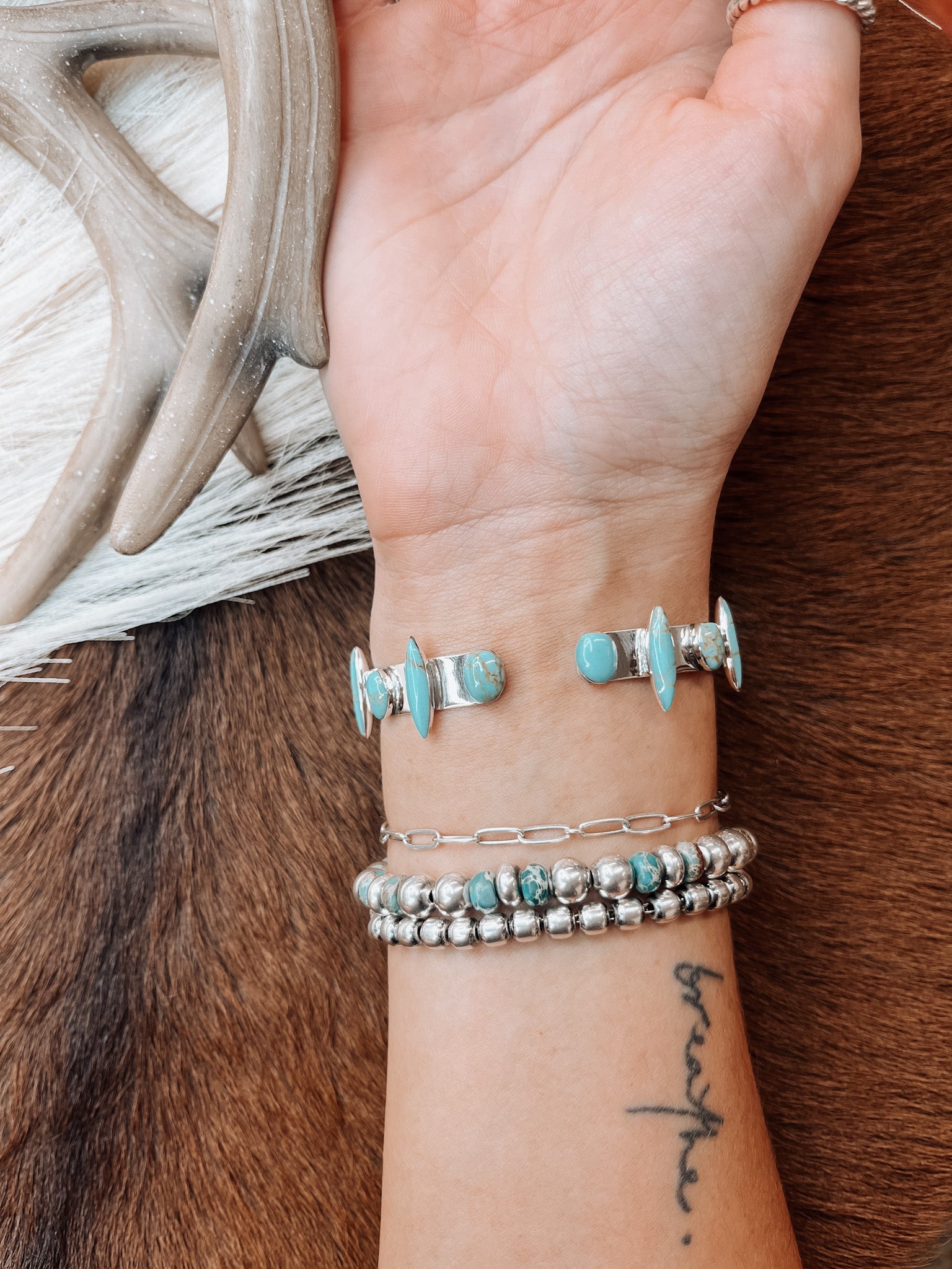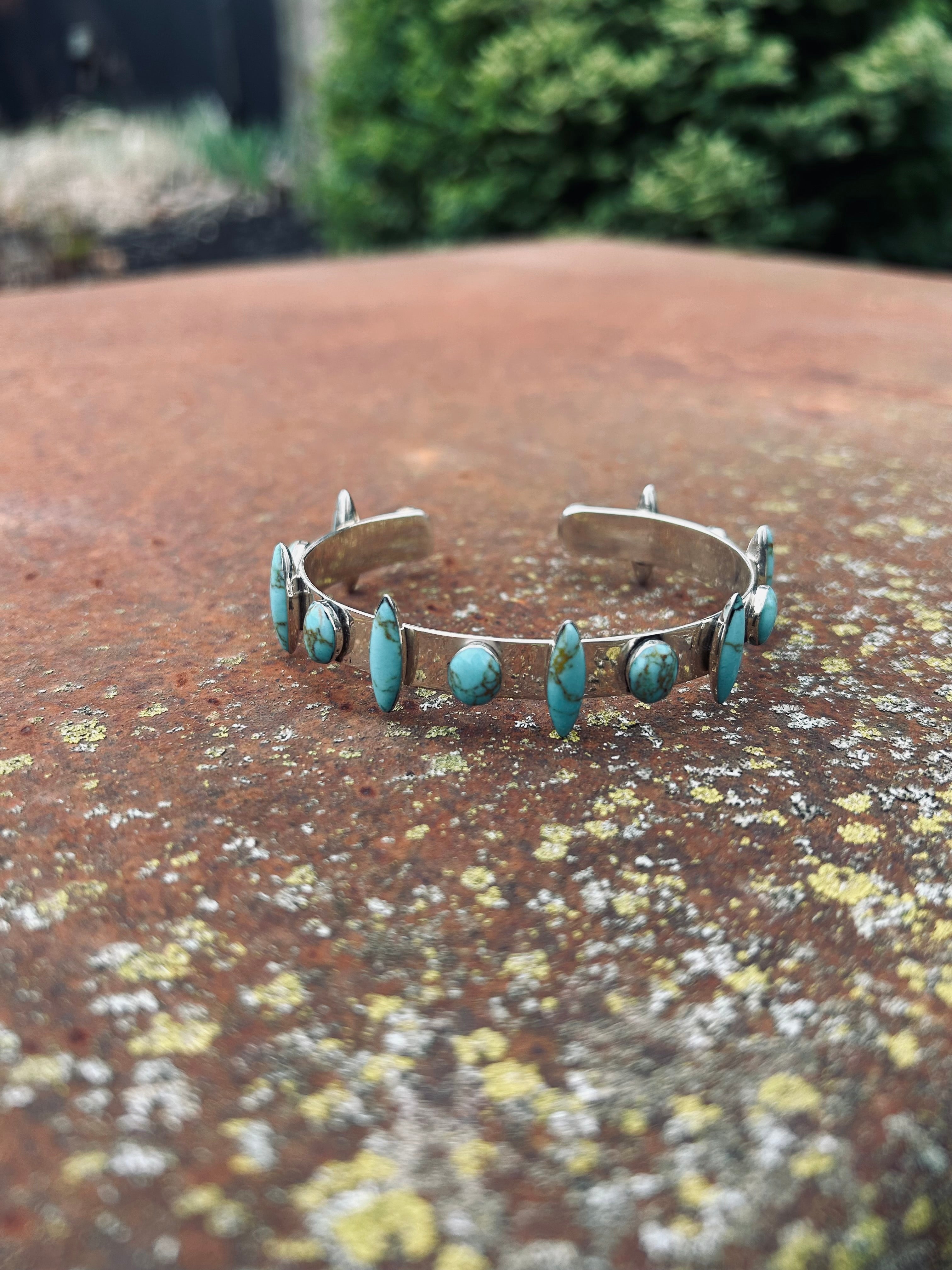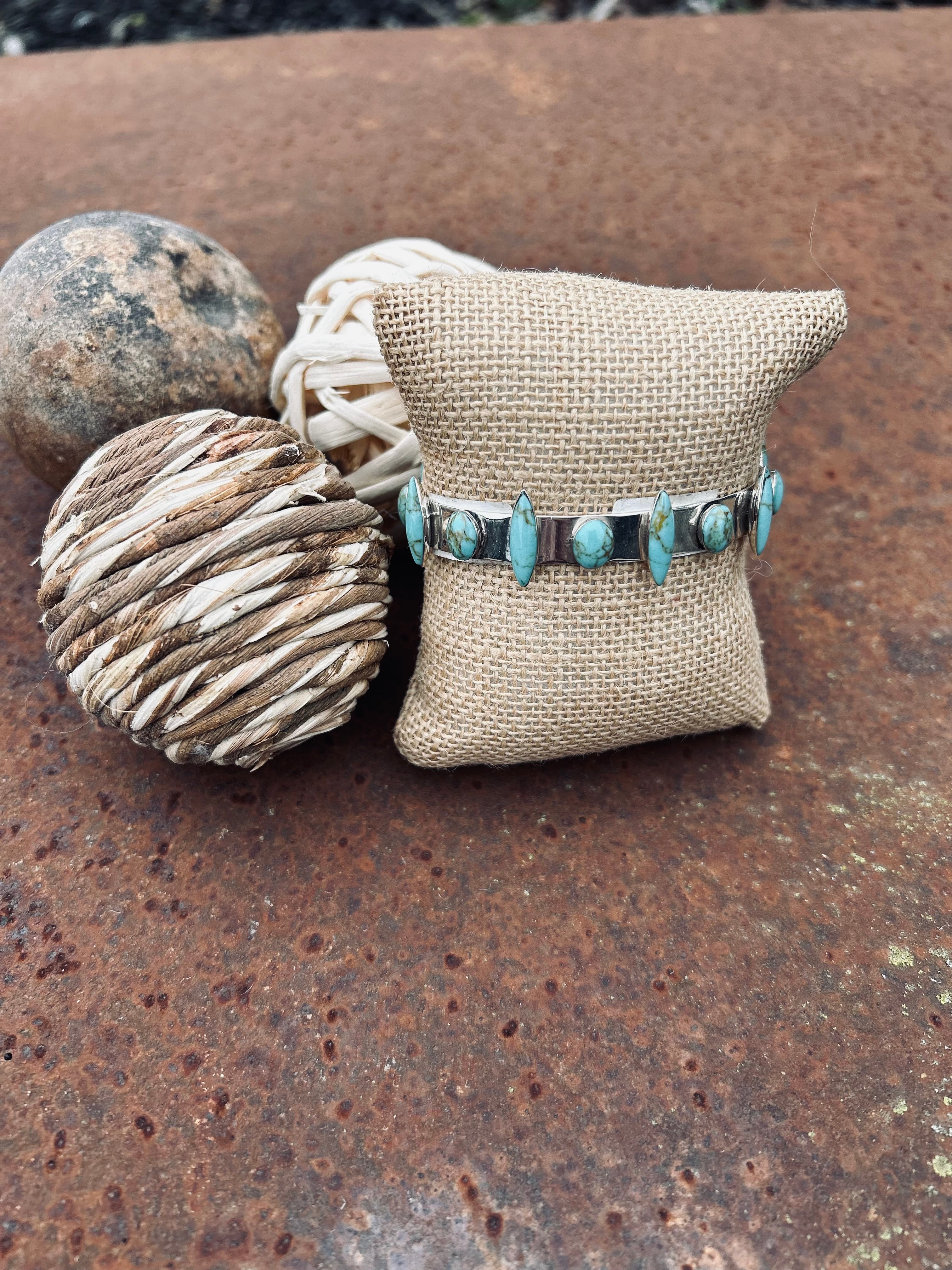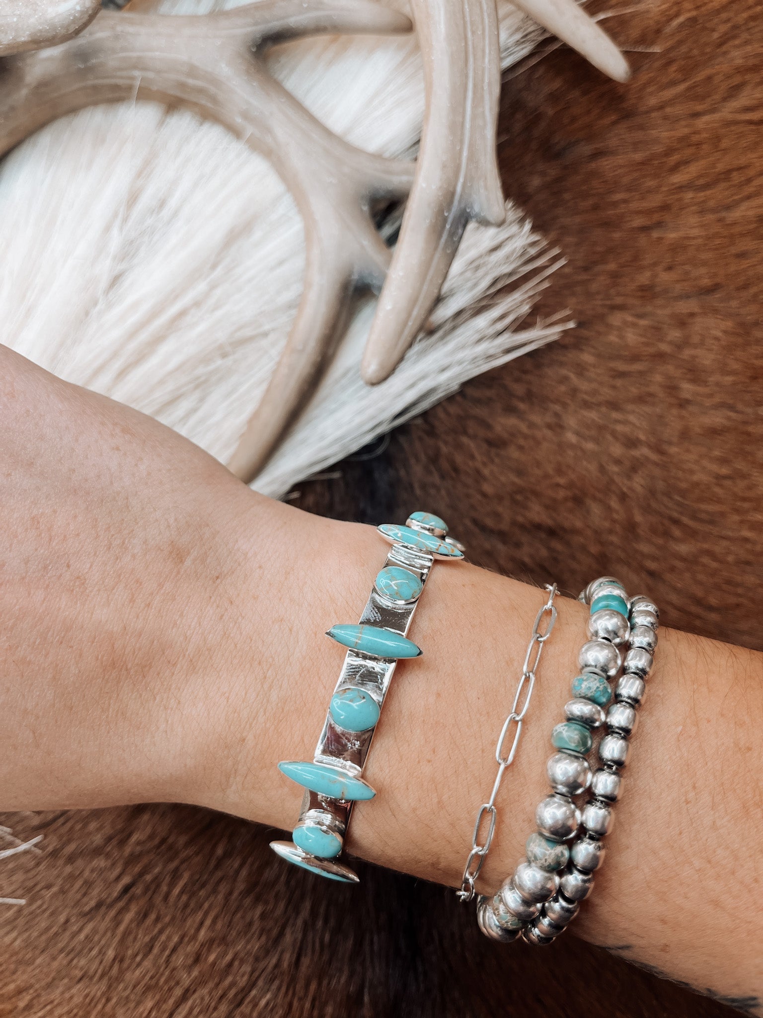 This stunning Sterling Silver band is carefully hand-crafted with a chrome-like finish and showcases alternating round and oval-shaped genuine Kingman Turquoise stones. From its shiny silver to the size and intricate Turquoise detailing, this substantial piece is an absolute show-stopper that you will never want to take off! It looks gorgeous on its own, but also pairs beautifully with other Sterling Silver or Turquoise pieces. Don't miss out on adding this timeless and durable piece to your collection today!