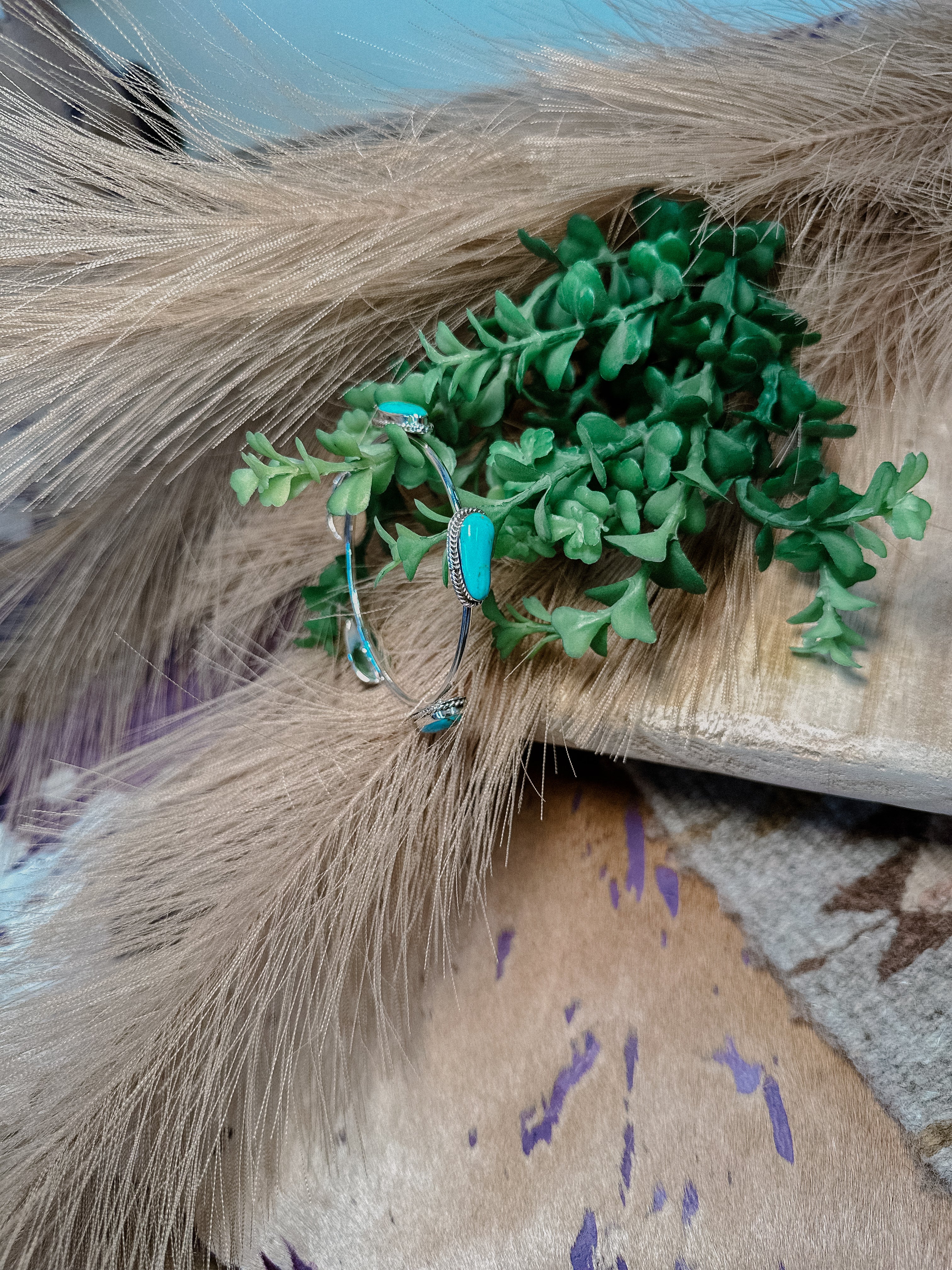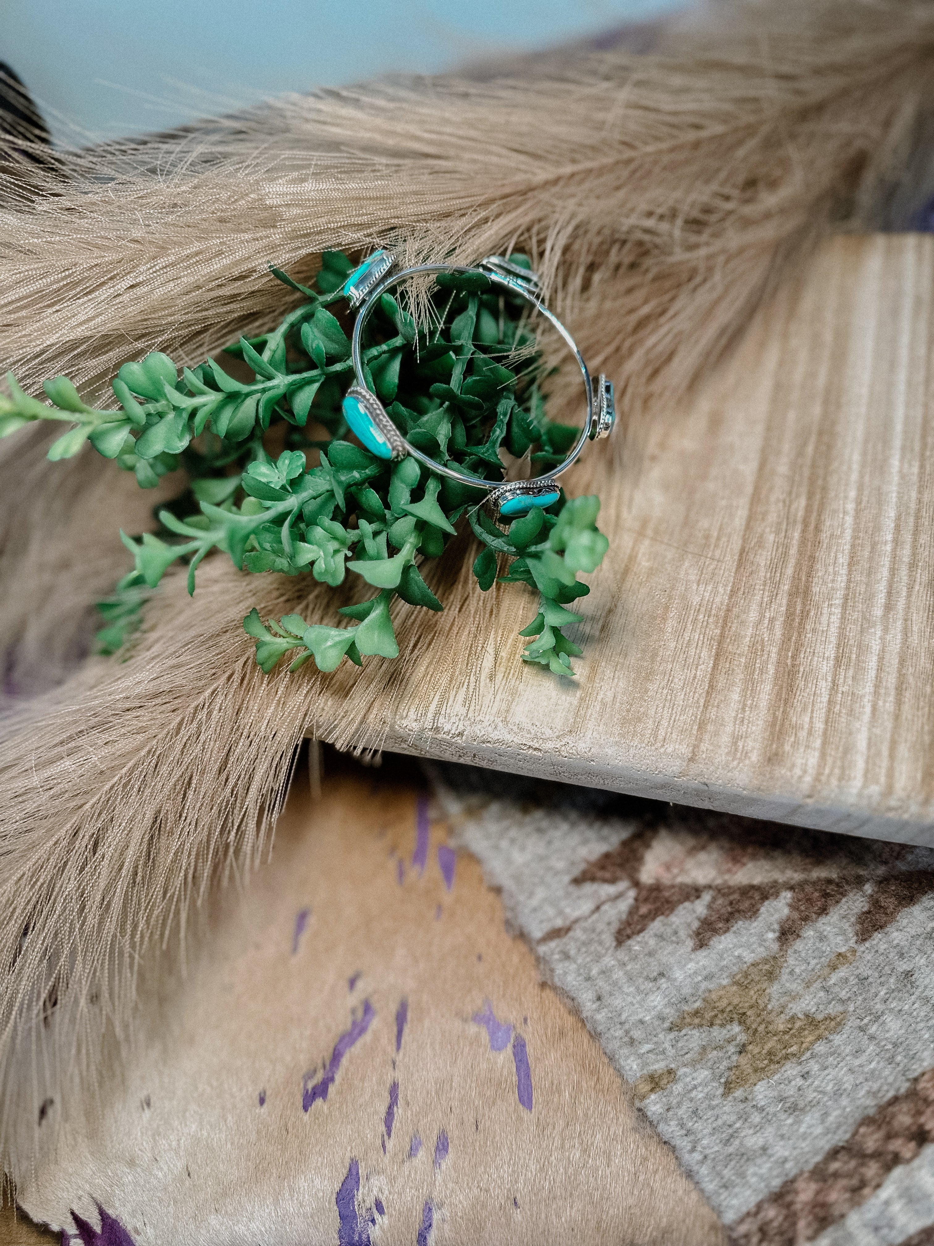 Indulge in the stunning beauty of 5 peanut shaped stones crafted from authentic Kingman Turquoise. Each stone is delicately set in a Sterling Silver mount with intricate rope detailing at the base. This breathtaking bangle boasts a completely unique style that is truly one-of-a-kind.