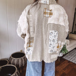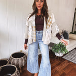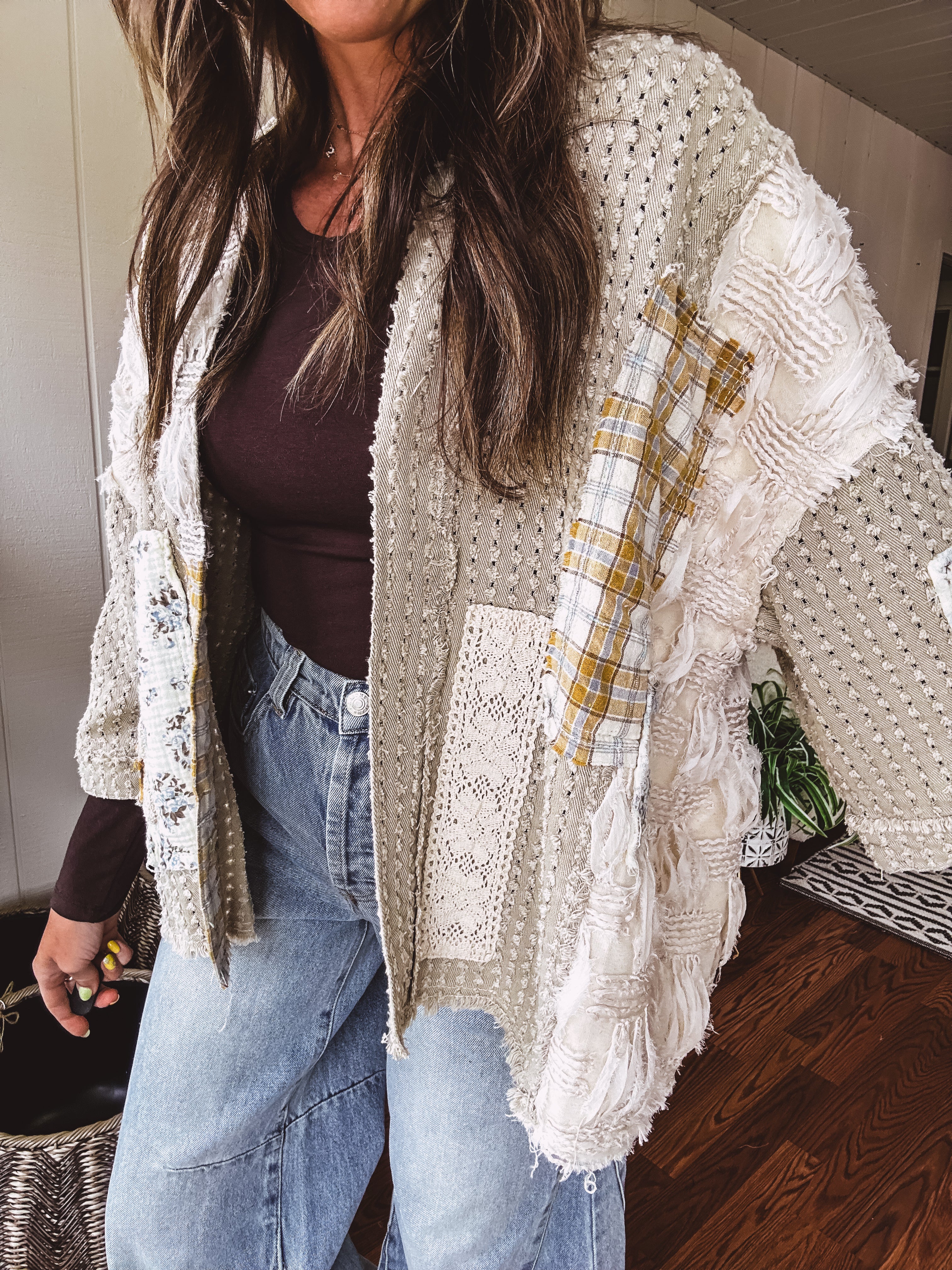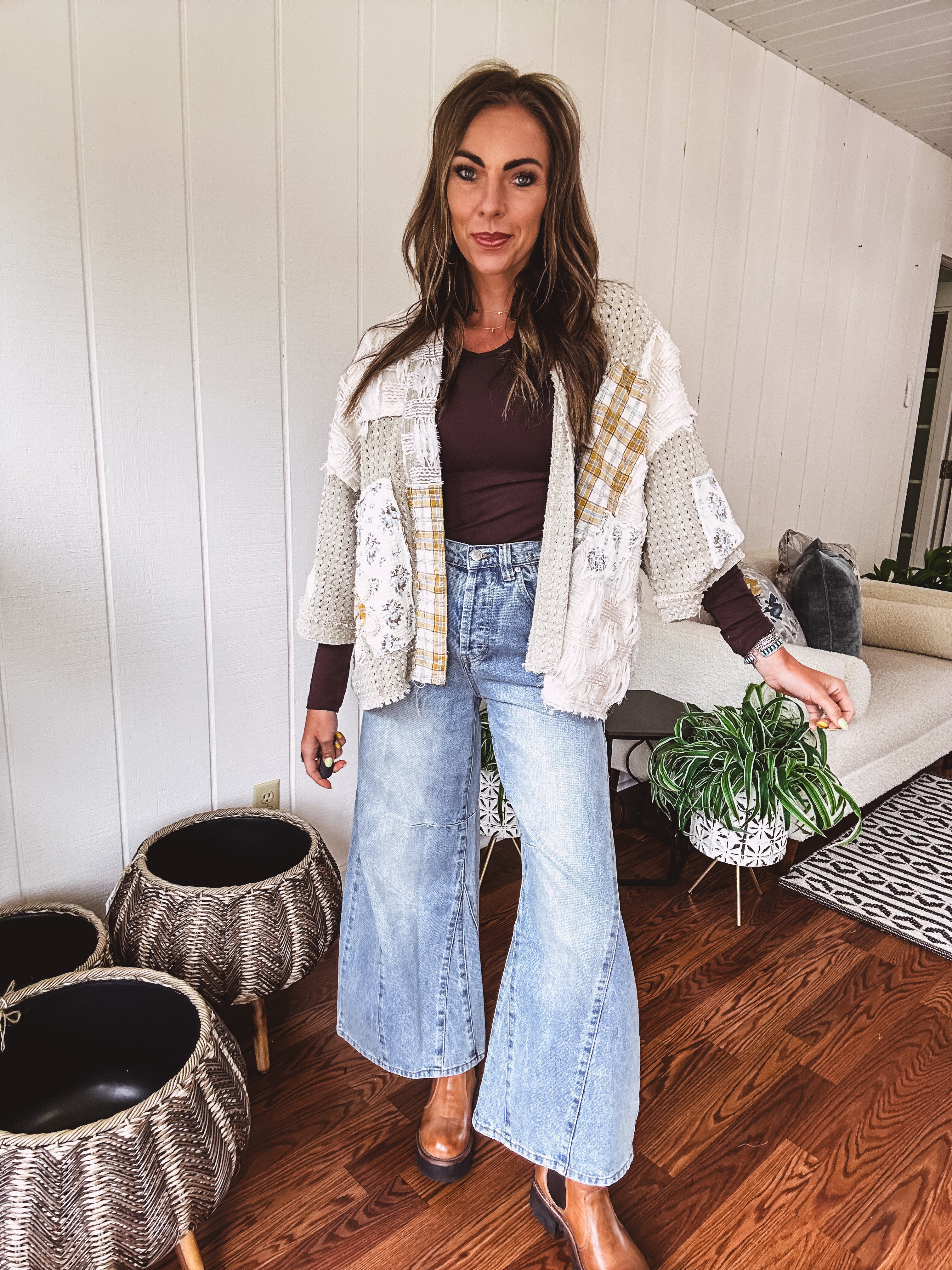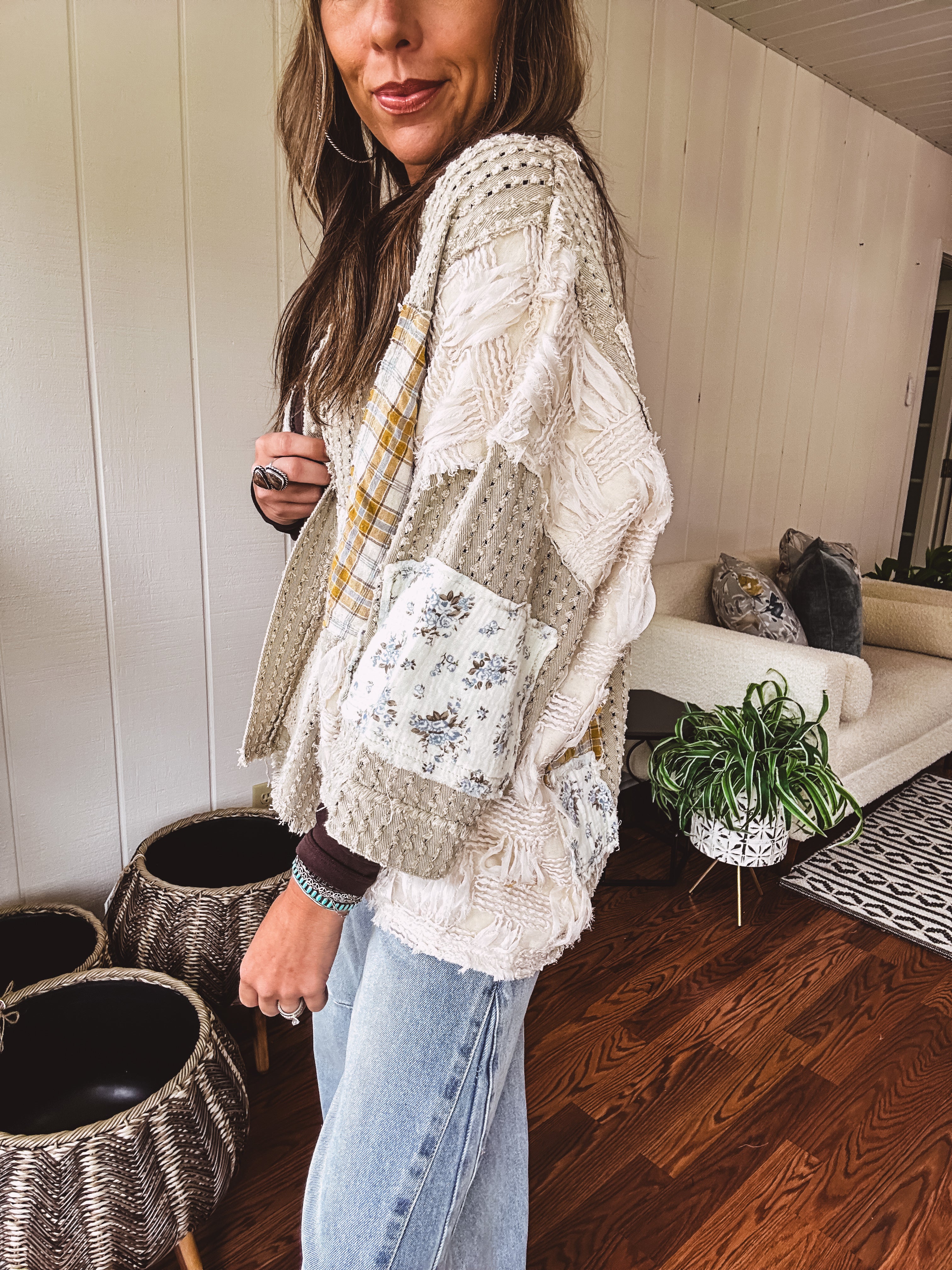 POL strikes again with this open cardigan! Featuring eyelet cutouts on a beige denim-style fabric, paired with floral gauze, mustard and blue flannel, plus crochet lace patches, this piece is truly one-of-a-kind. It’s the perfect boho kimono to add a splash of fun and personality to your outfit, layering effortlessly over any top and pairing beautifully with denim!