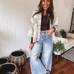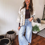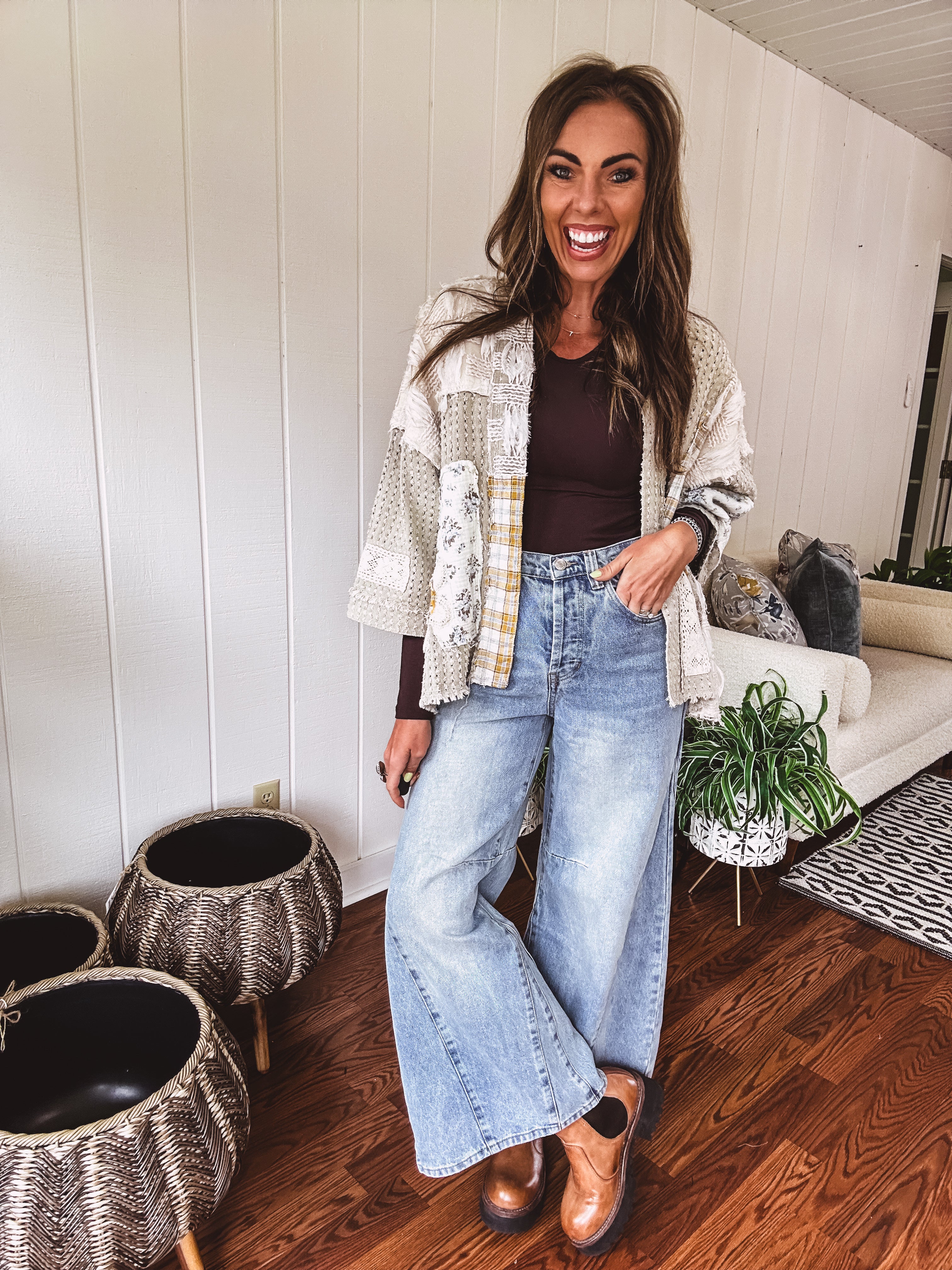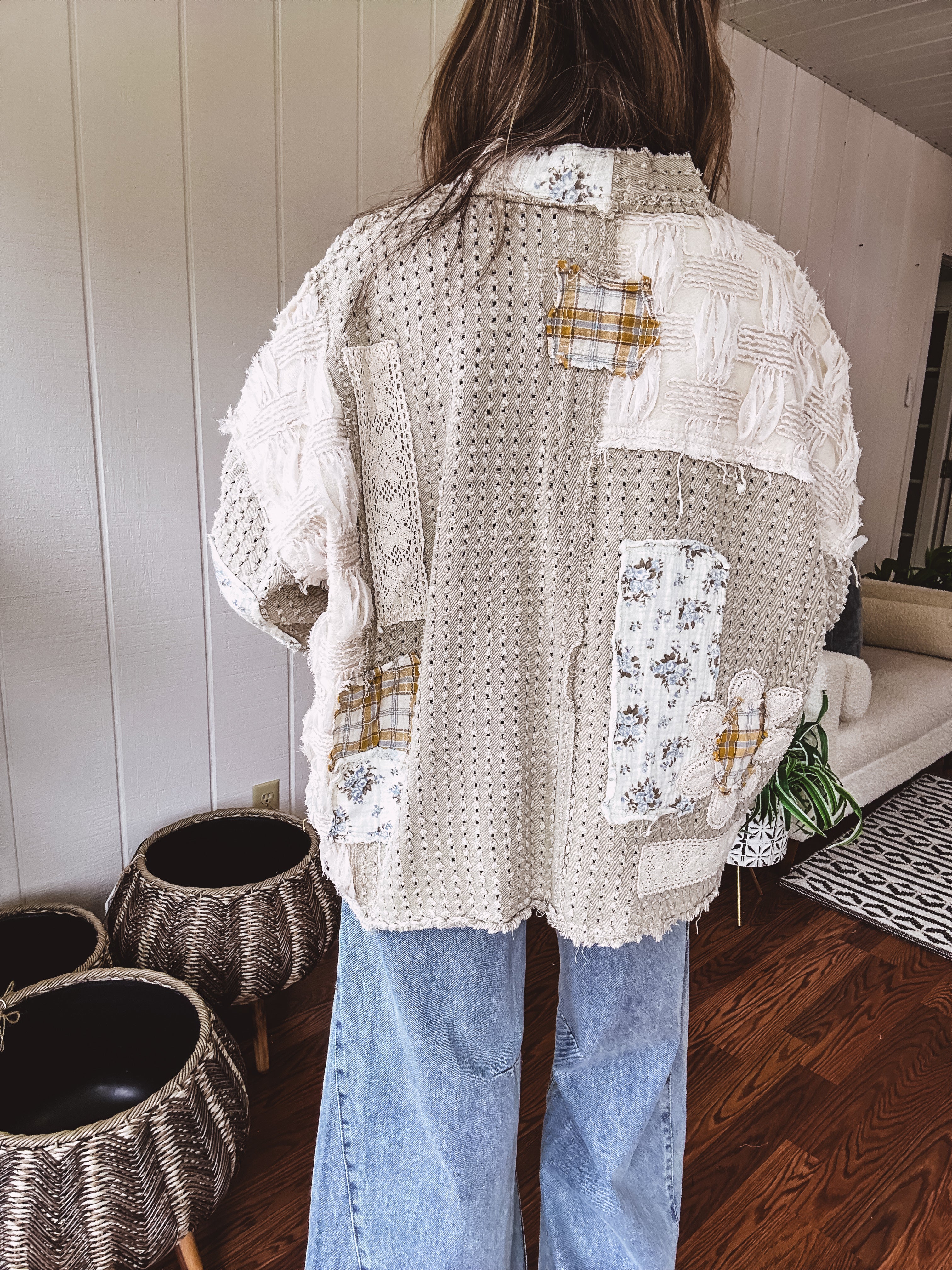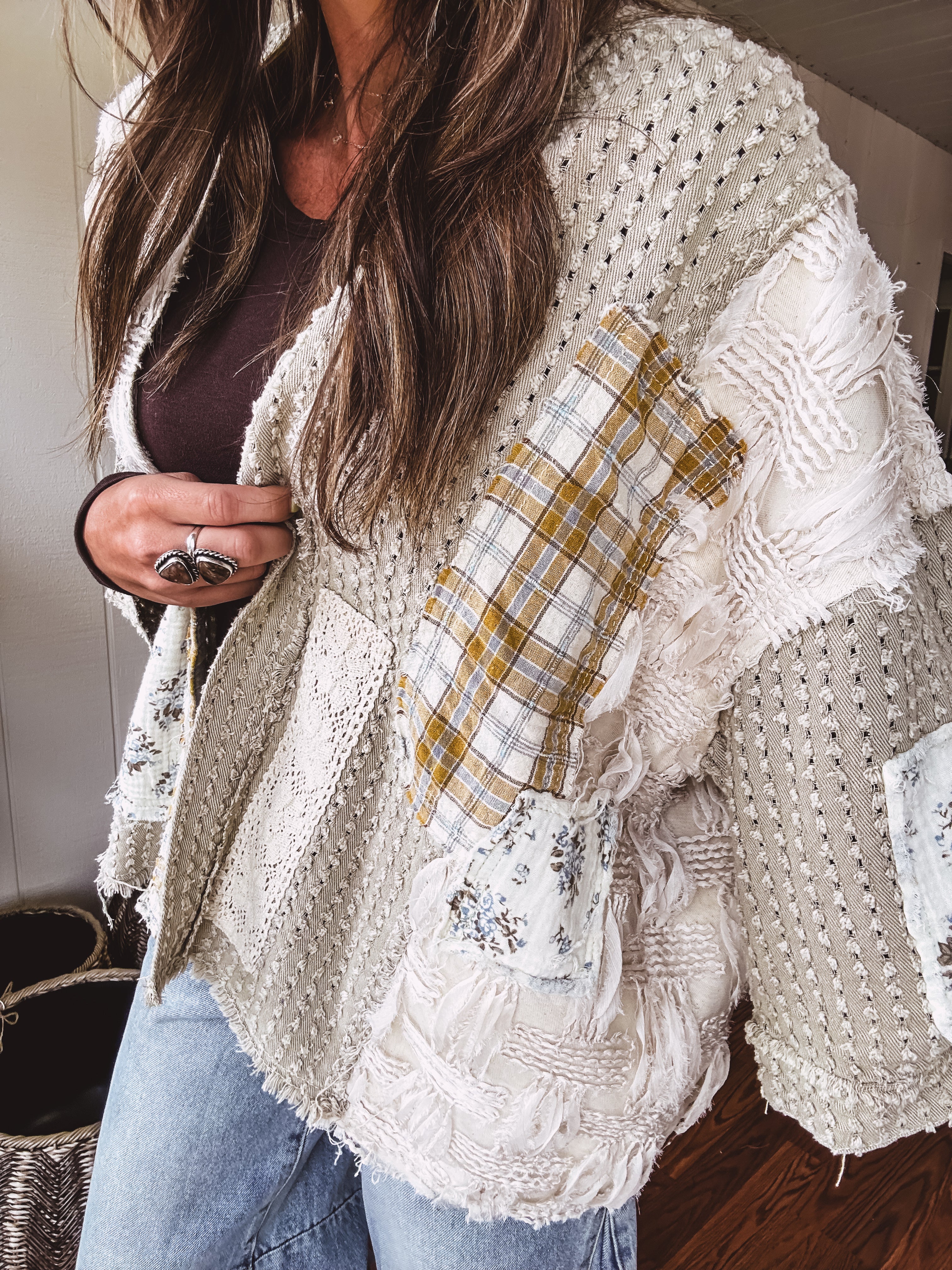 POL strikes again with this open cardigan! Featuring eyelet cutouts on a beige denim-style fabric, paired with floral gauze, mustard and blue flannel, plus crochet lace patches, this piece is truly one-of-a-kind. It’s the perfect boho kimono to add a splash of fun and personality to your outfit, layering effortlessly over any top and pairing beautifully with denim!