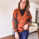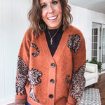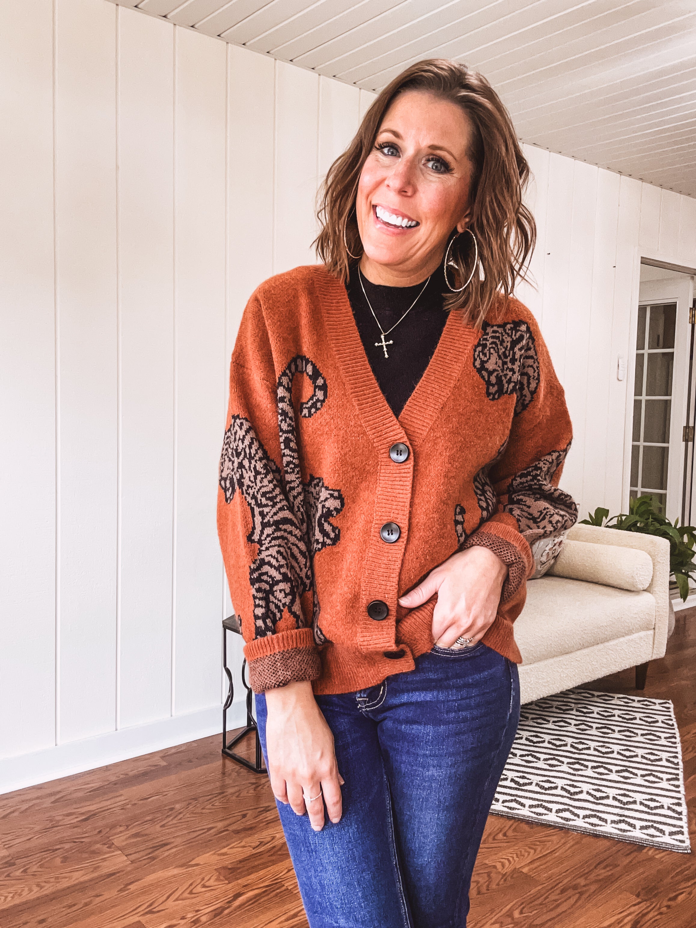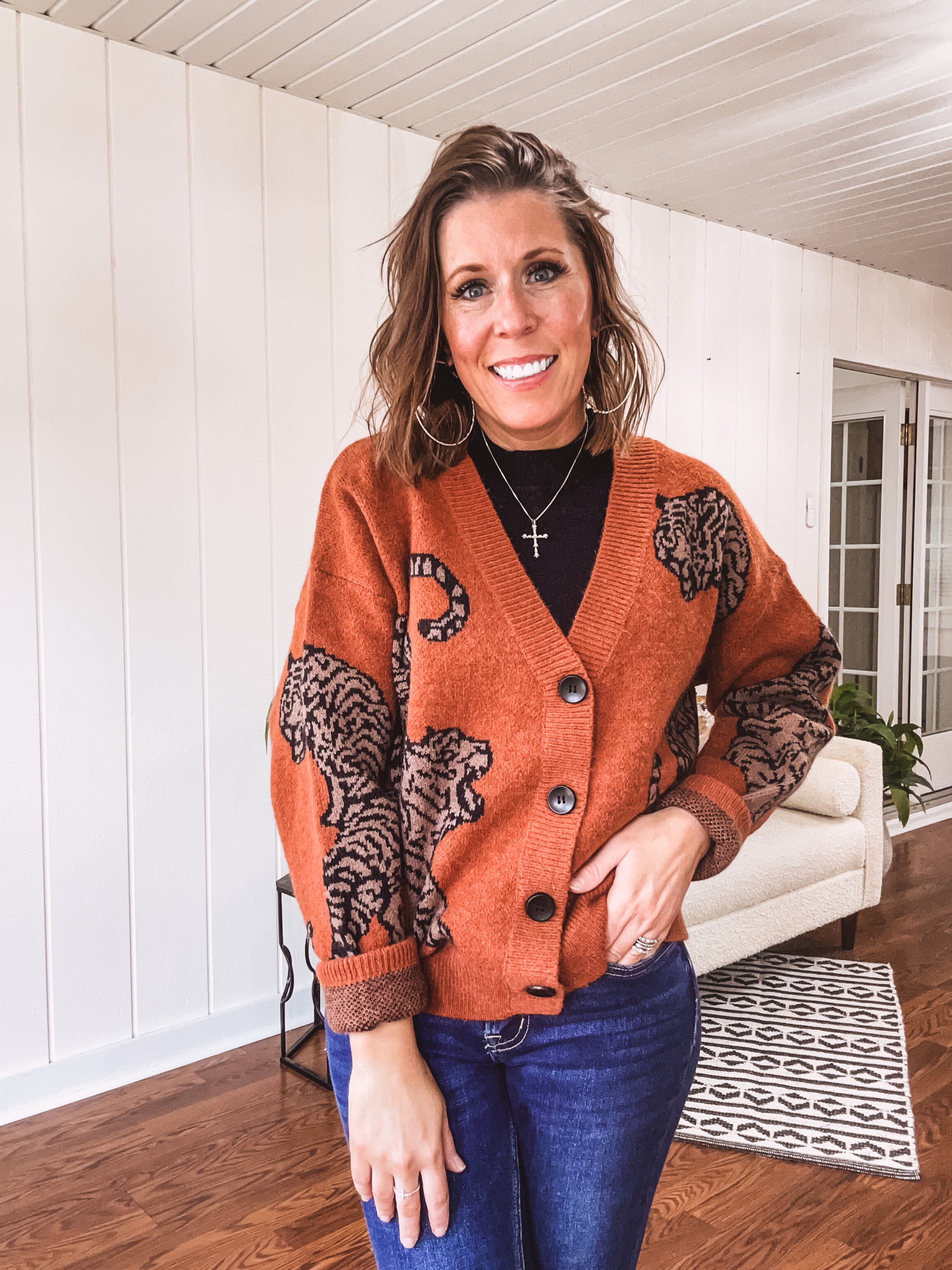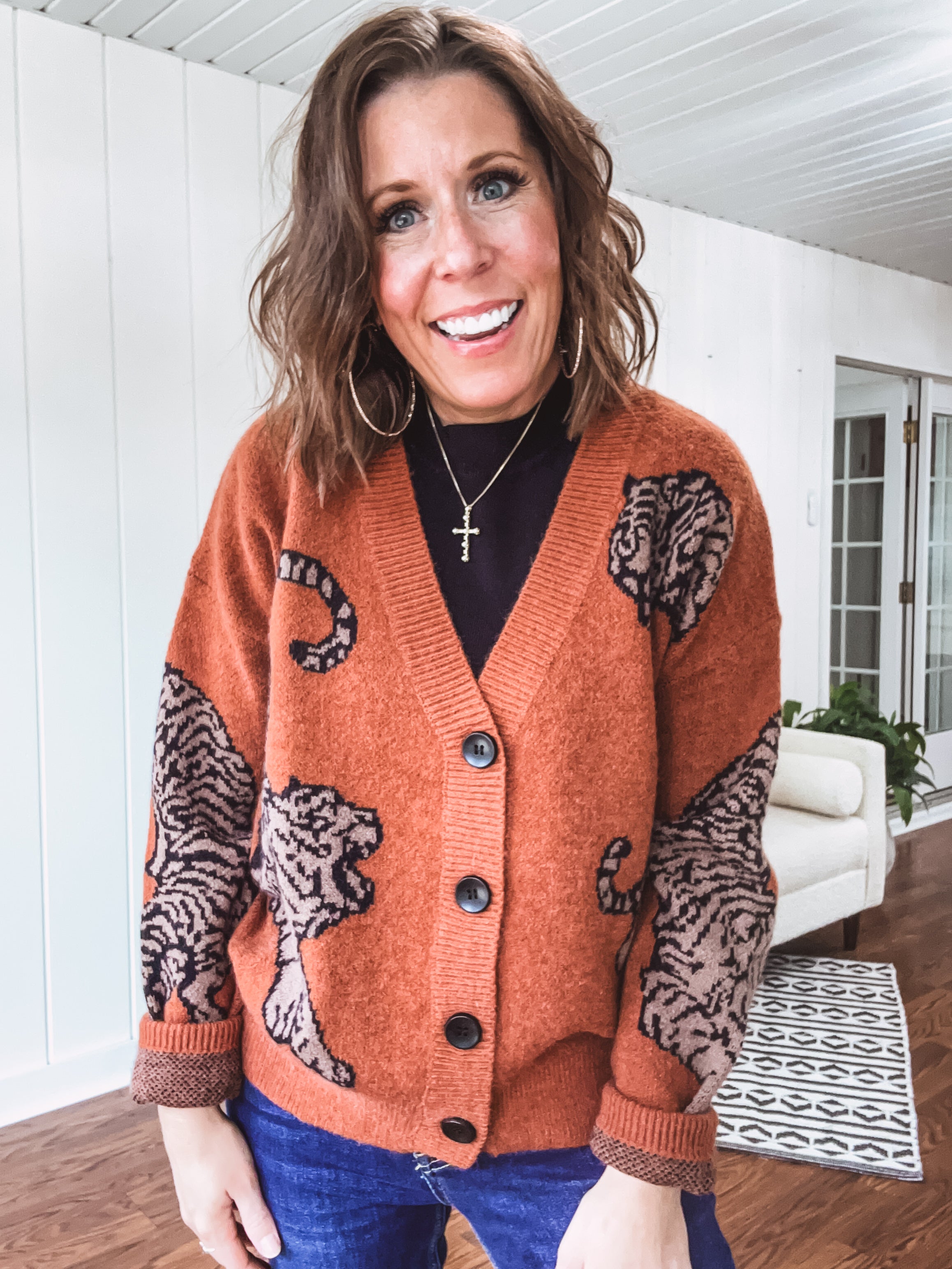 Cozy, warm, and just a bit fierce, this cardigan shines in a standout almond-orange hue sprinkled with prowling tigers. Its classic design and black button front make it an ideal pick for your fall and winter outfits. Whether paired with your go-to jeans or dressy slacks, it’s ready to take you from the office to evening adventures with playful style.