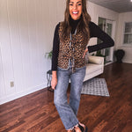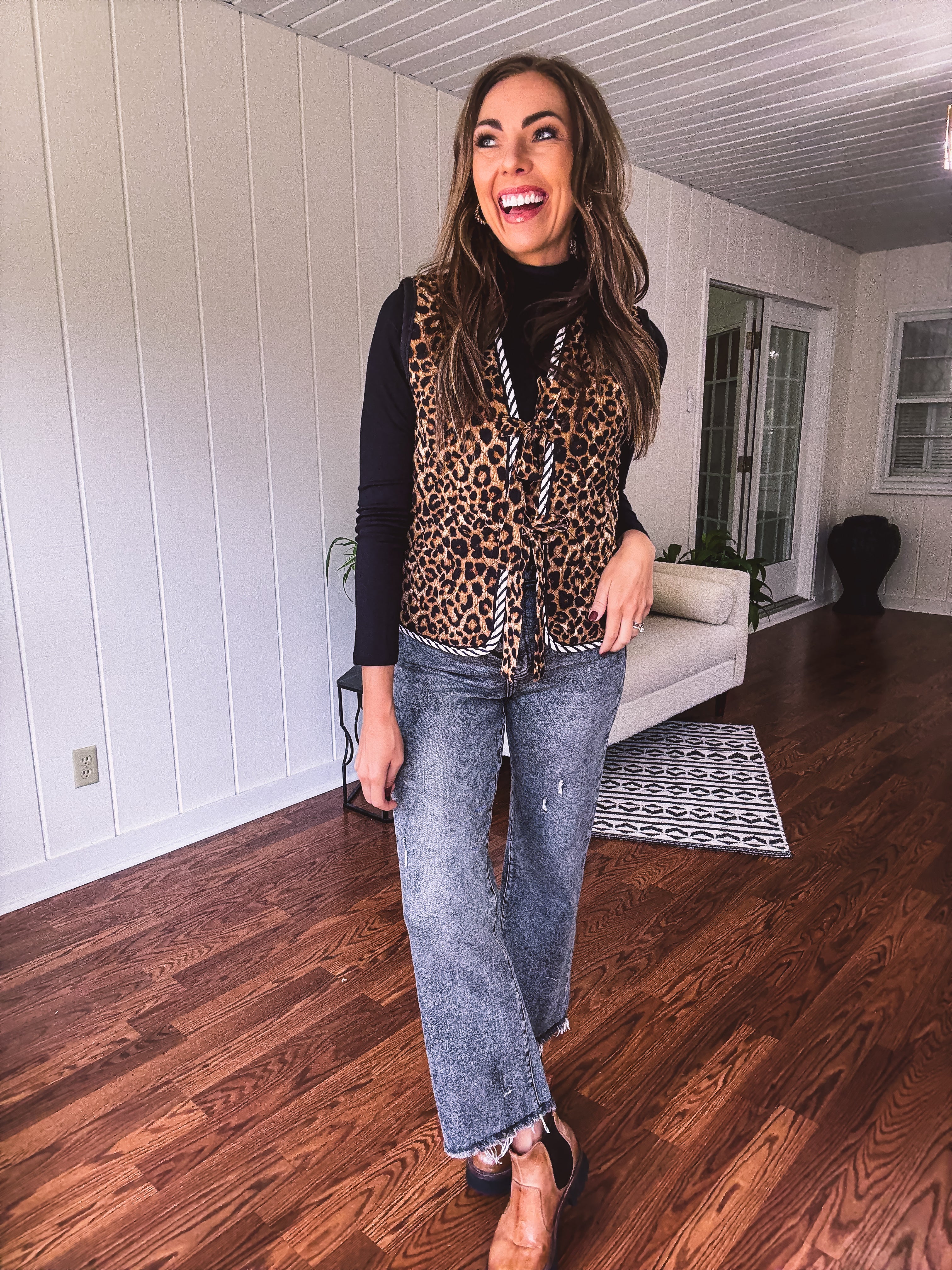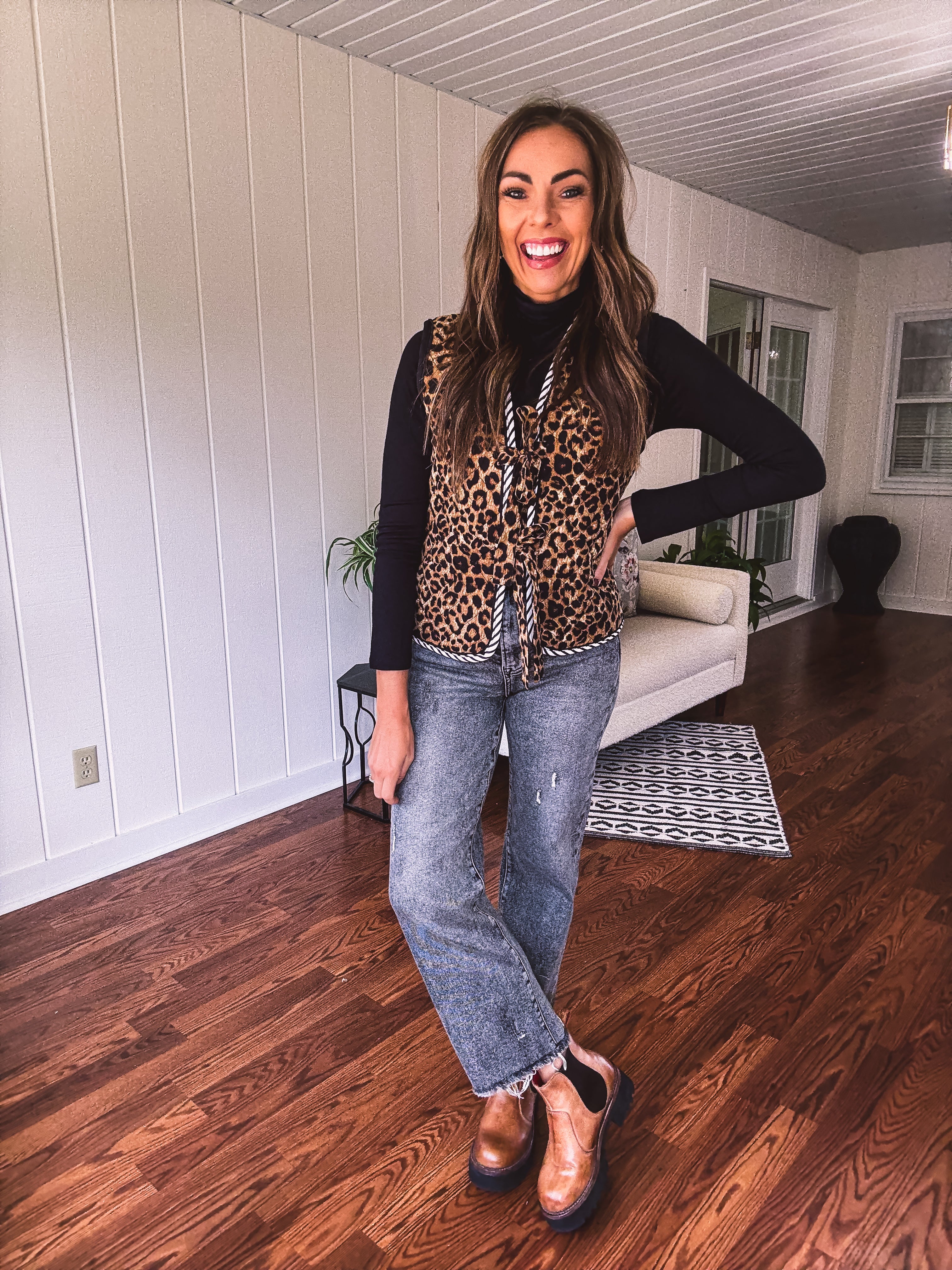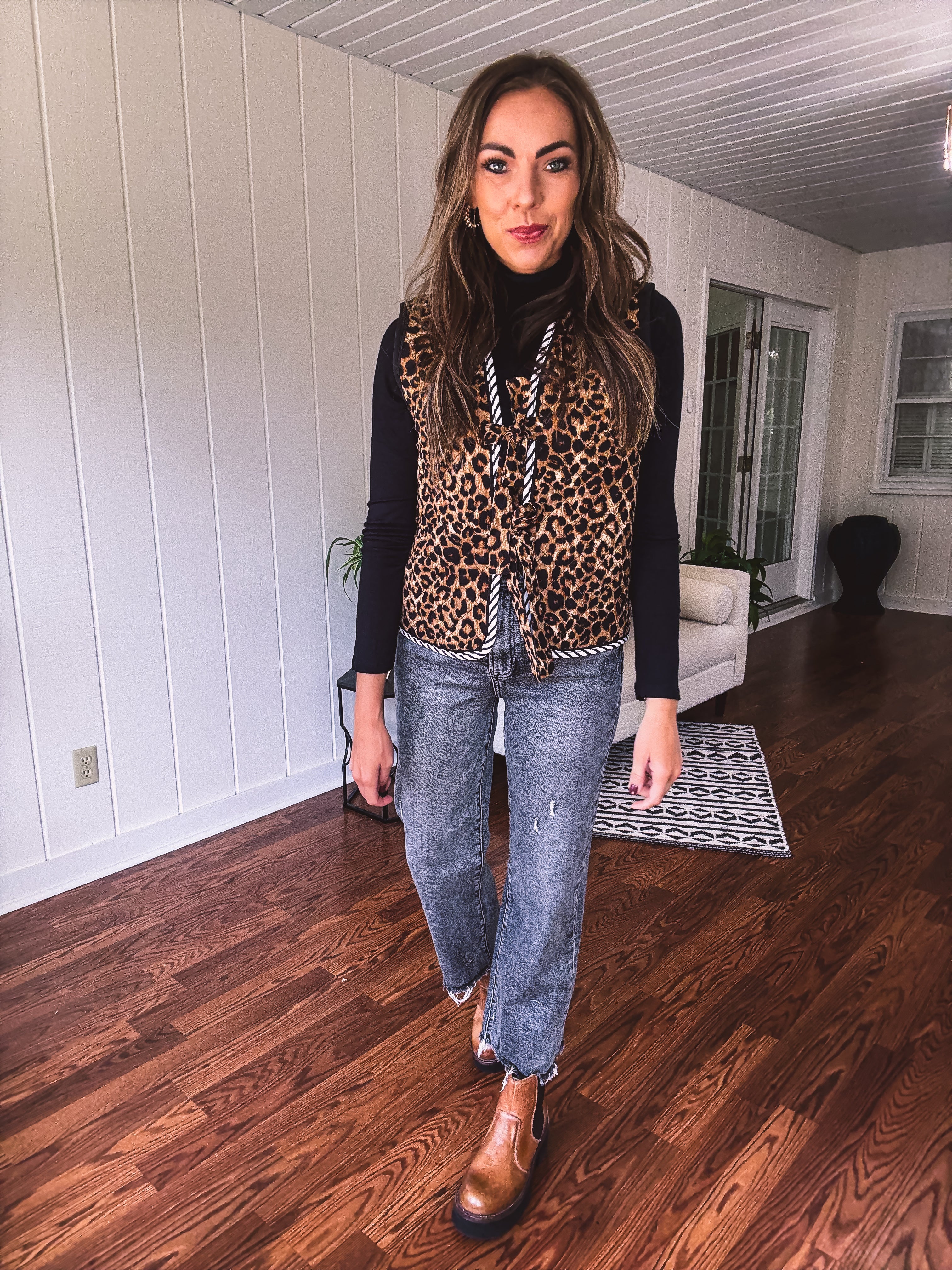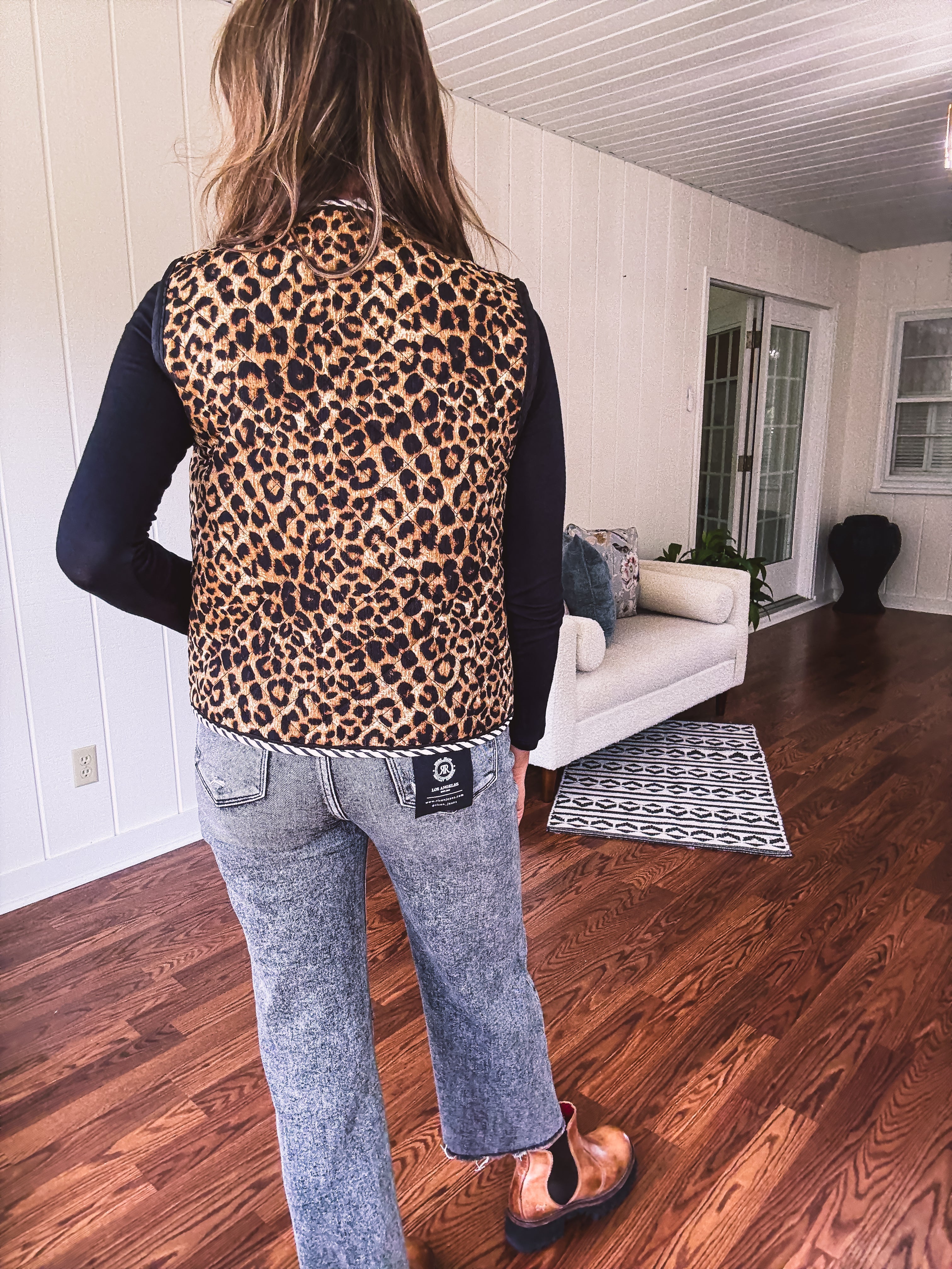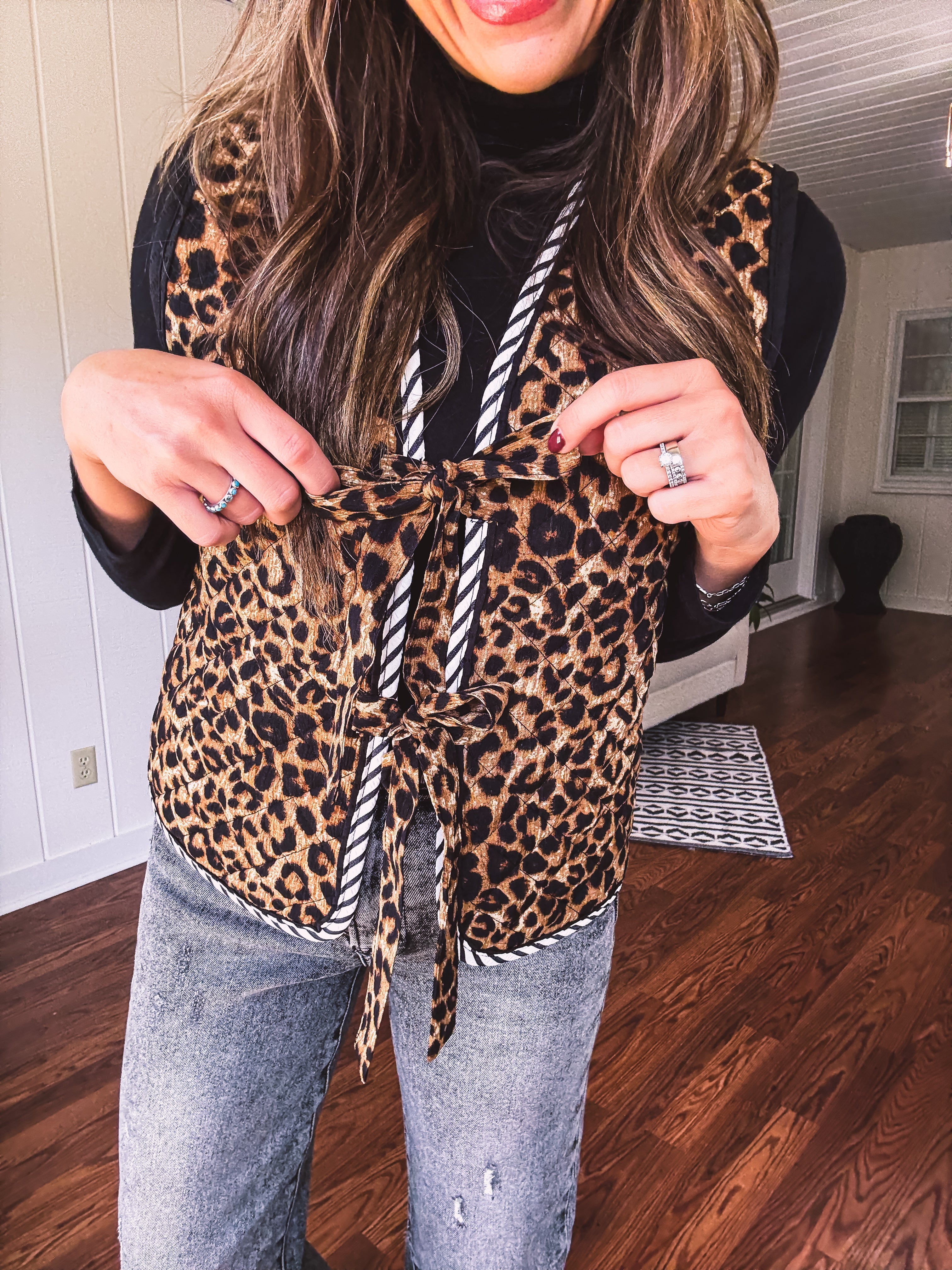This vest features light quilting, a playful leopard print exterior, and a bold black-and-white striped lining with matching trim and leopard print ties at the front. It’s the ideal way to inject a little wild style into your outfit! Pair it with a long-sleeve mesh top, mock neck, or graphic tee and your favorite jeans for a look that’s ready to roar.
