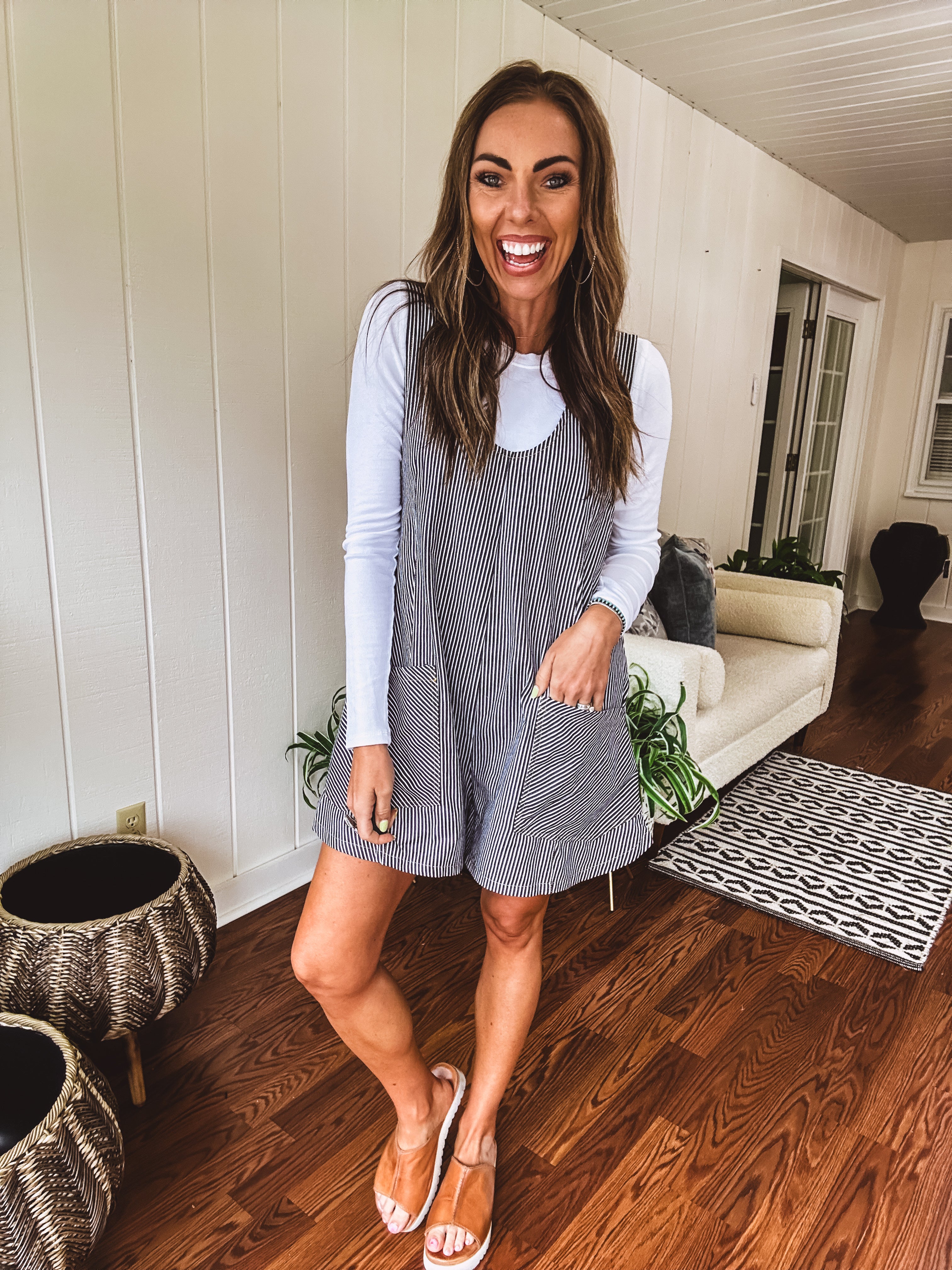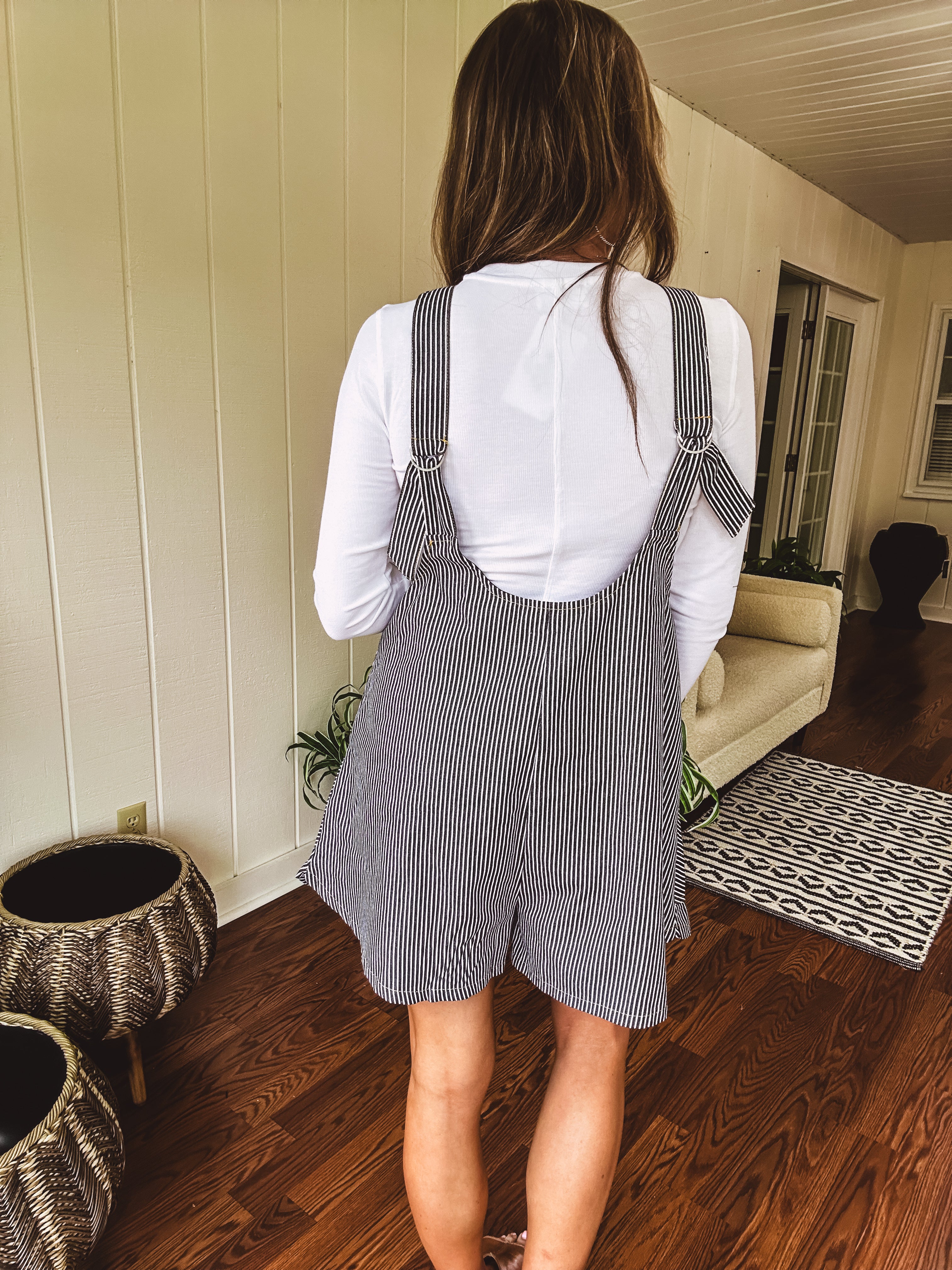 This breezy, lightweight romper features a timeless black and white stripe pattern and a roomy fit made for playful days. It comes with large front pockets and adjustable back straps for a perfect fit. Layer it over your favorite tee, tank, or mesh top to mix and match endless styles!