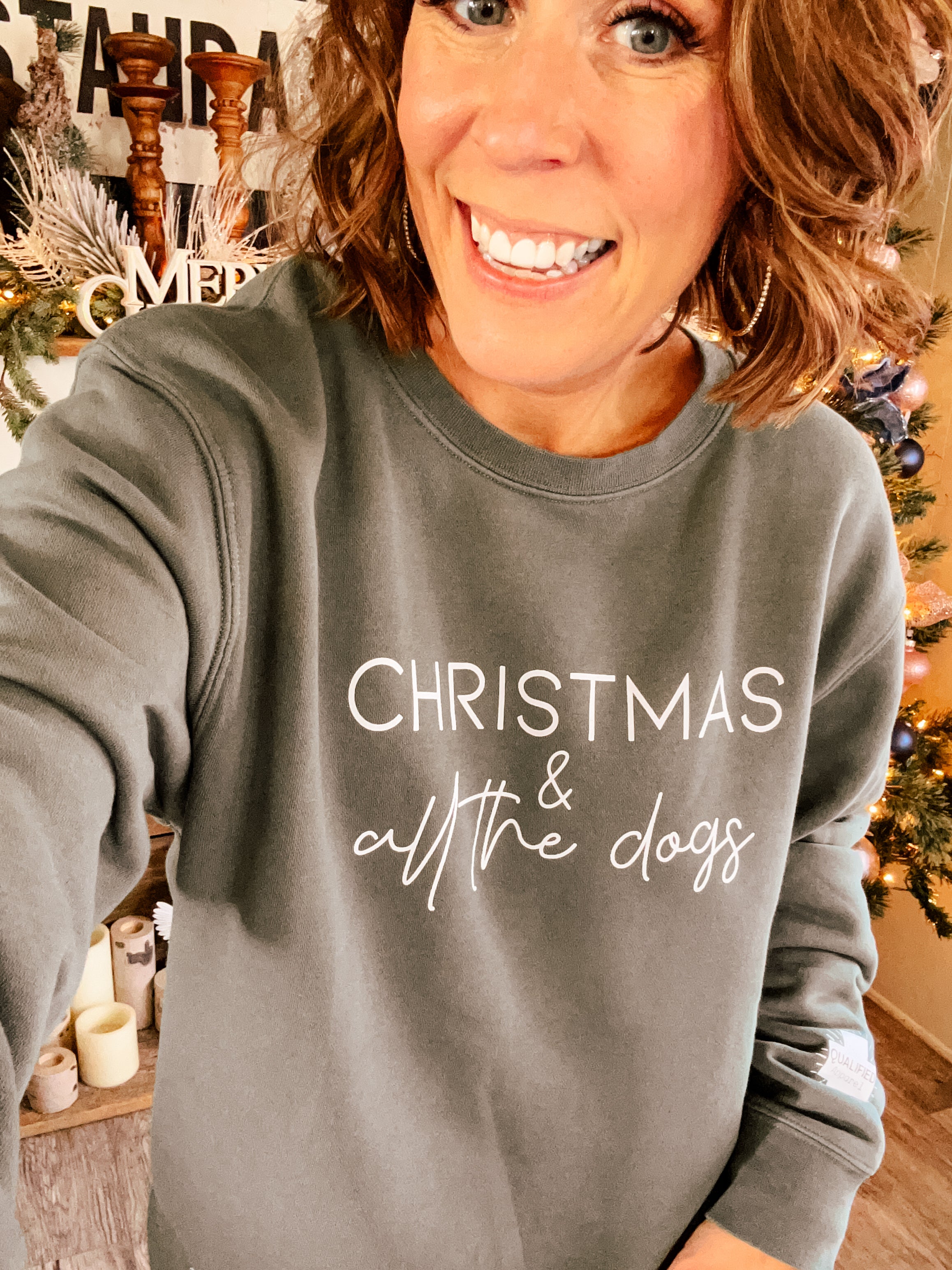 Feel the cozy comfort with this gorgeous alpine green crew sweatshirt, featuring "Christmas & All The Dogs" in a crisp white print. The straight and relaxed style, along with the wide hem, will surely add to your festive season comfort. With its soft fabric and extra length, this is a must-have for your holiday wardrobe!