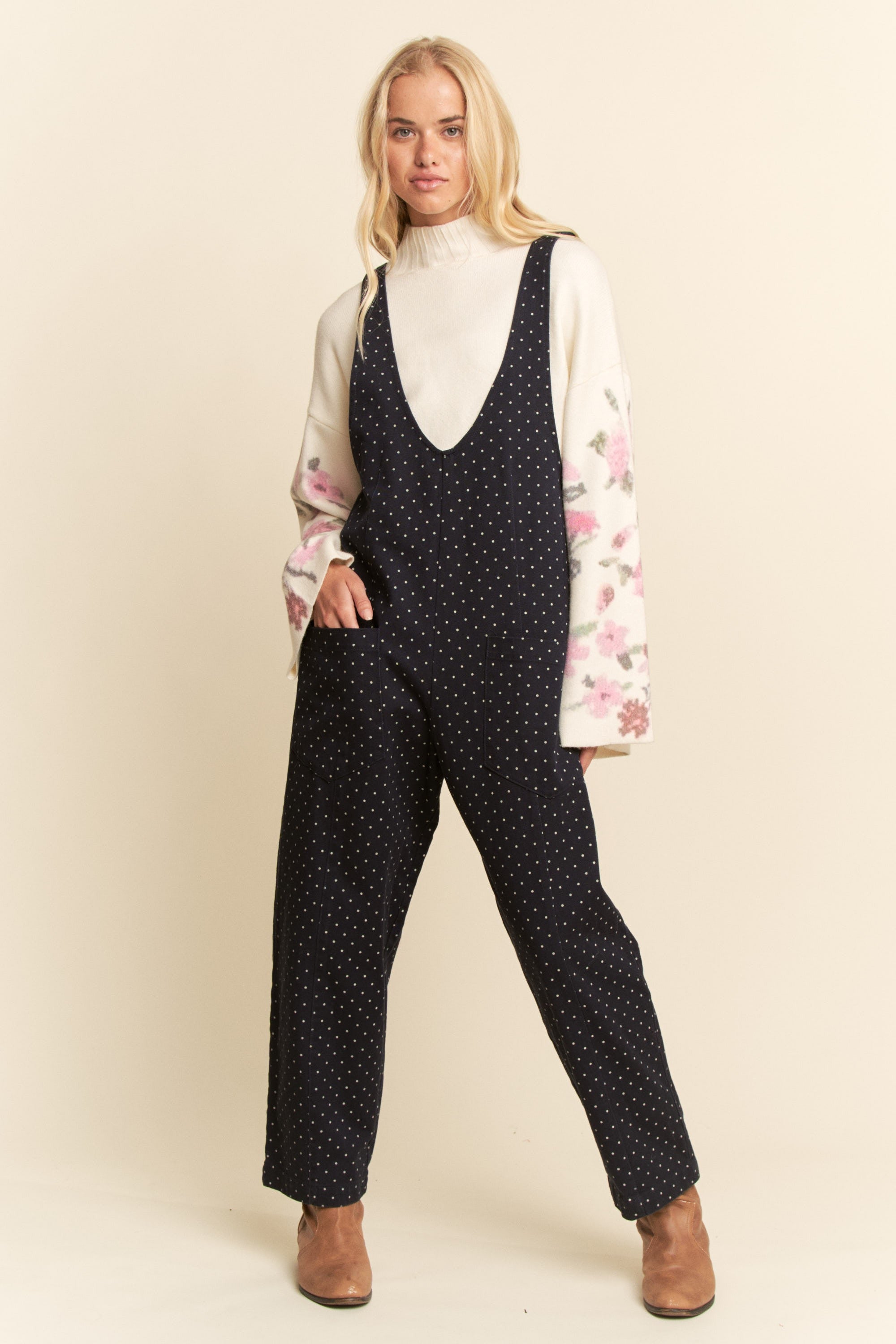 Navy Polka Dot Jumpsuit with Adjustable Straps