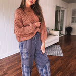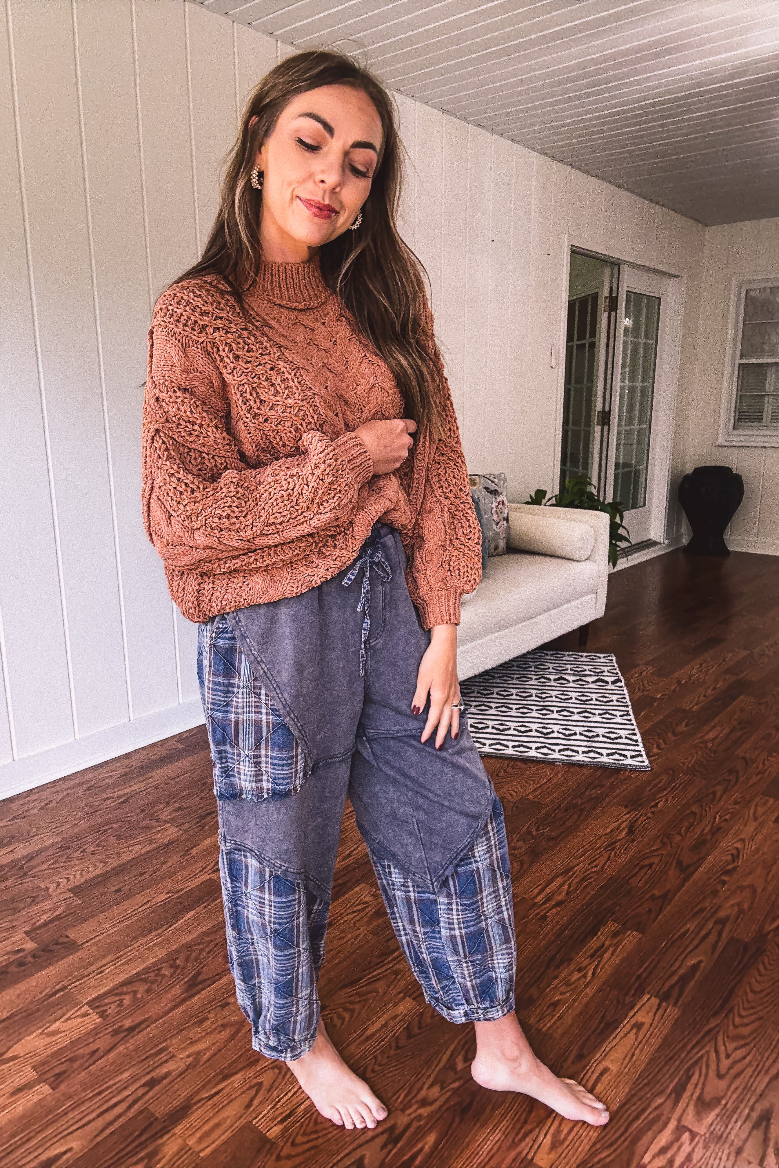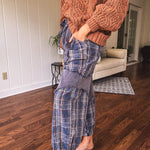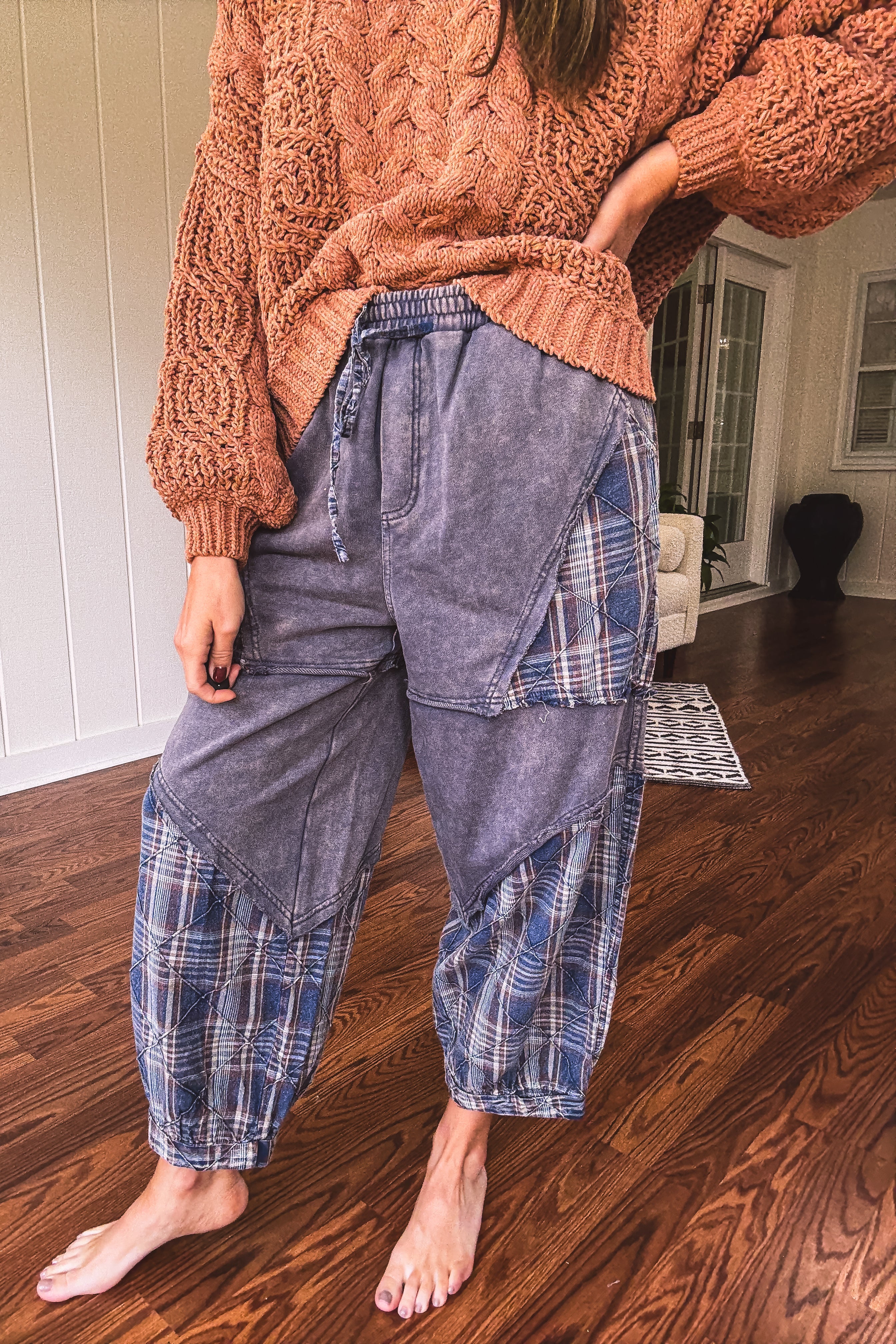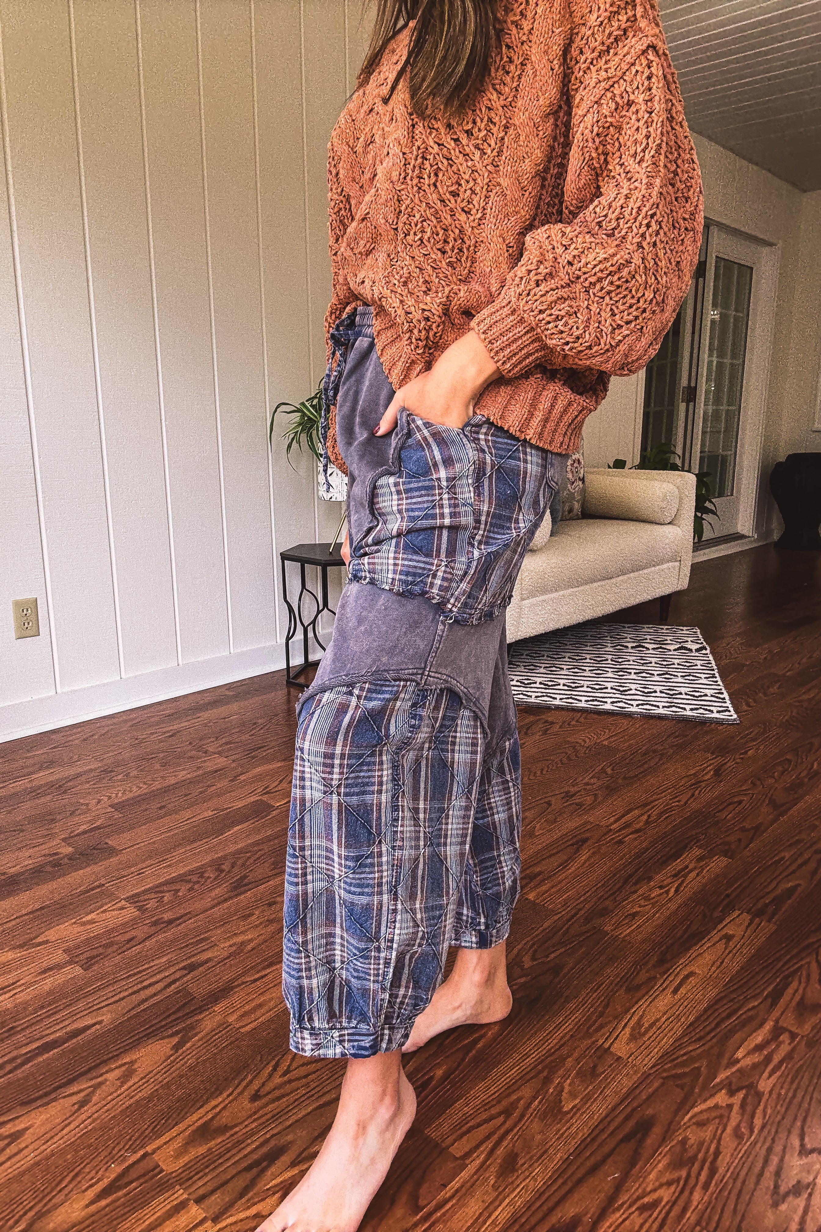 These boho pants blend mineral washed navy terry knit with navy, rust, and taupe plaid cotton for a fun, patchwork look. Featuring a drawstring waist, handy side and back pockets, and cuffed hems, they’re comfy and stylish. Perfect for transitioning from summer tees and tanks to cozy fall sweaters and shackets with effortless flair.