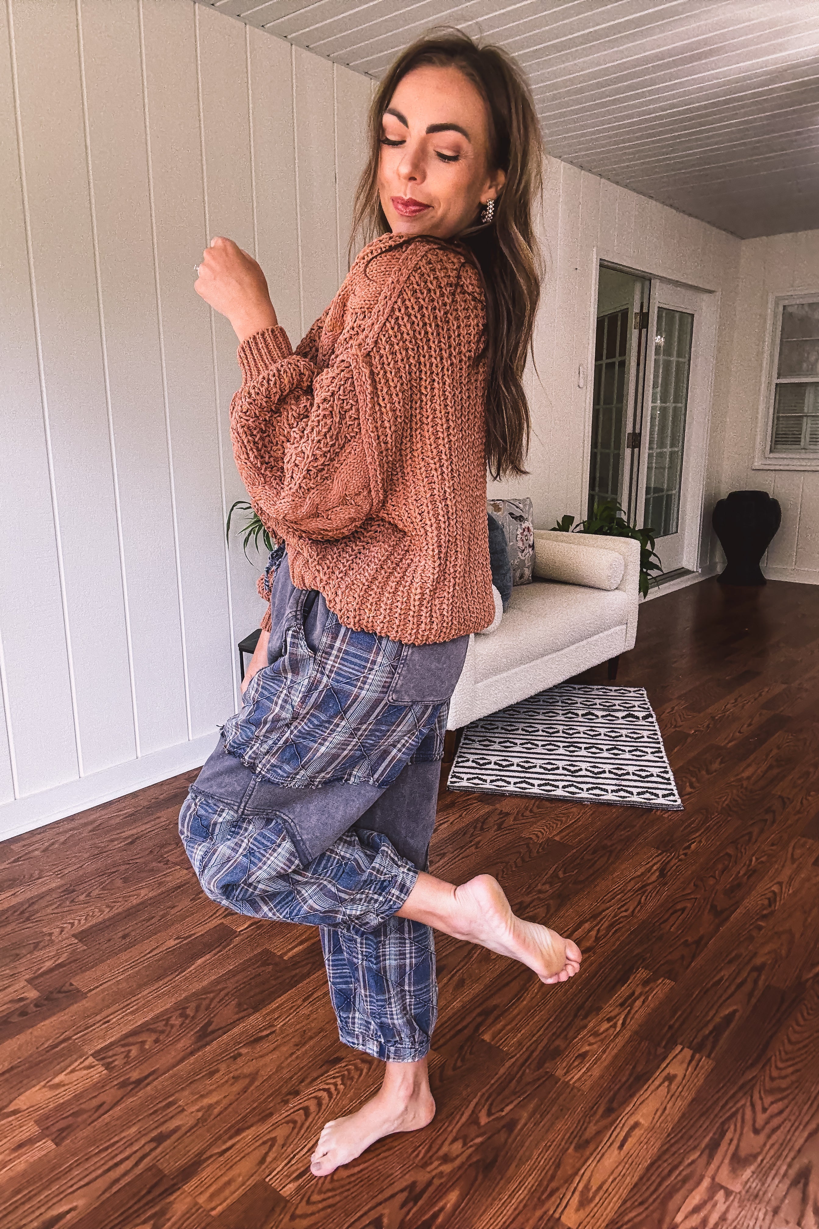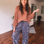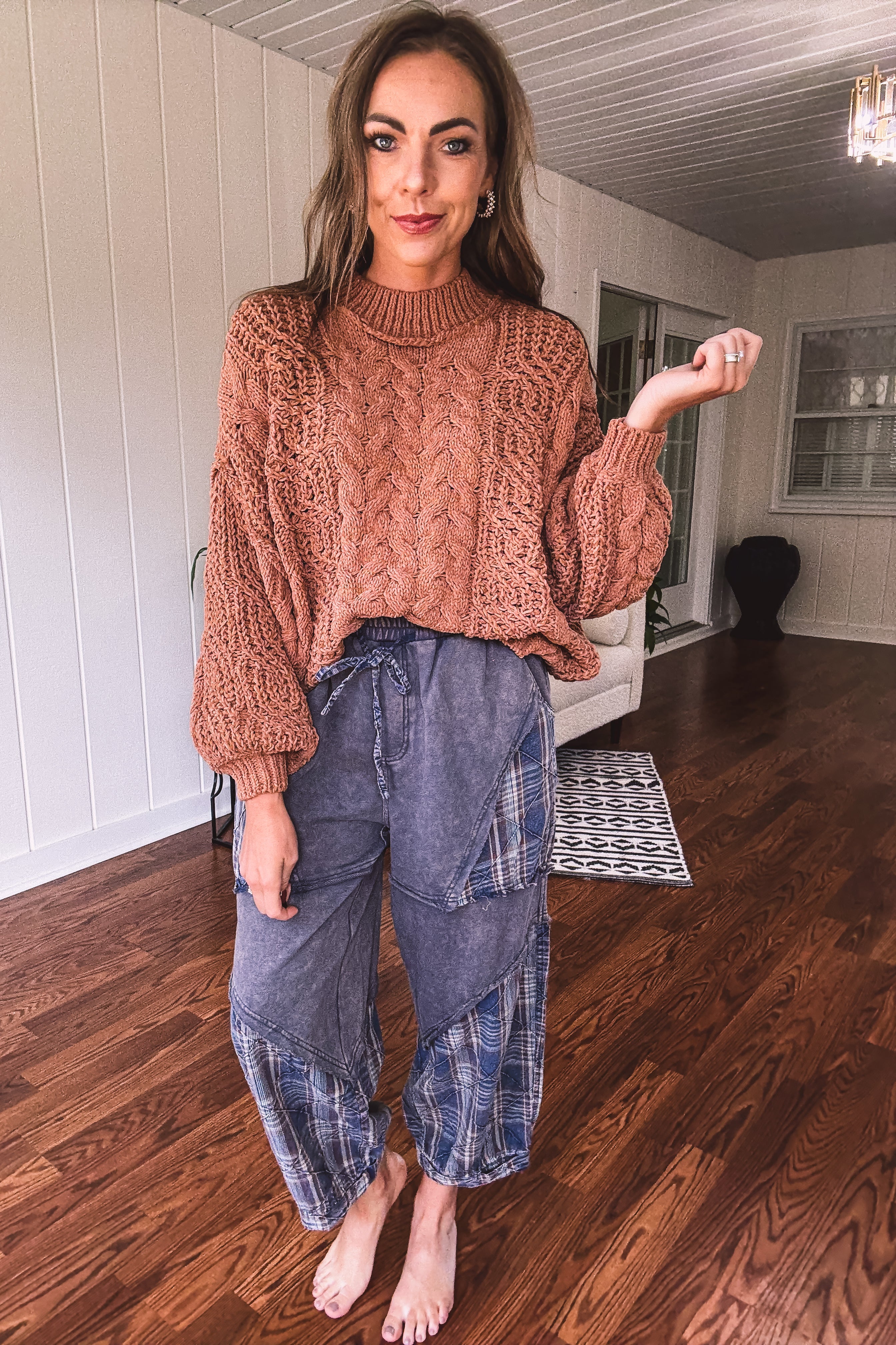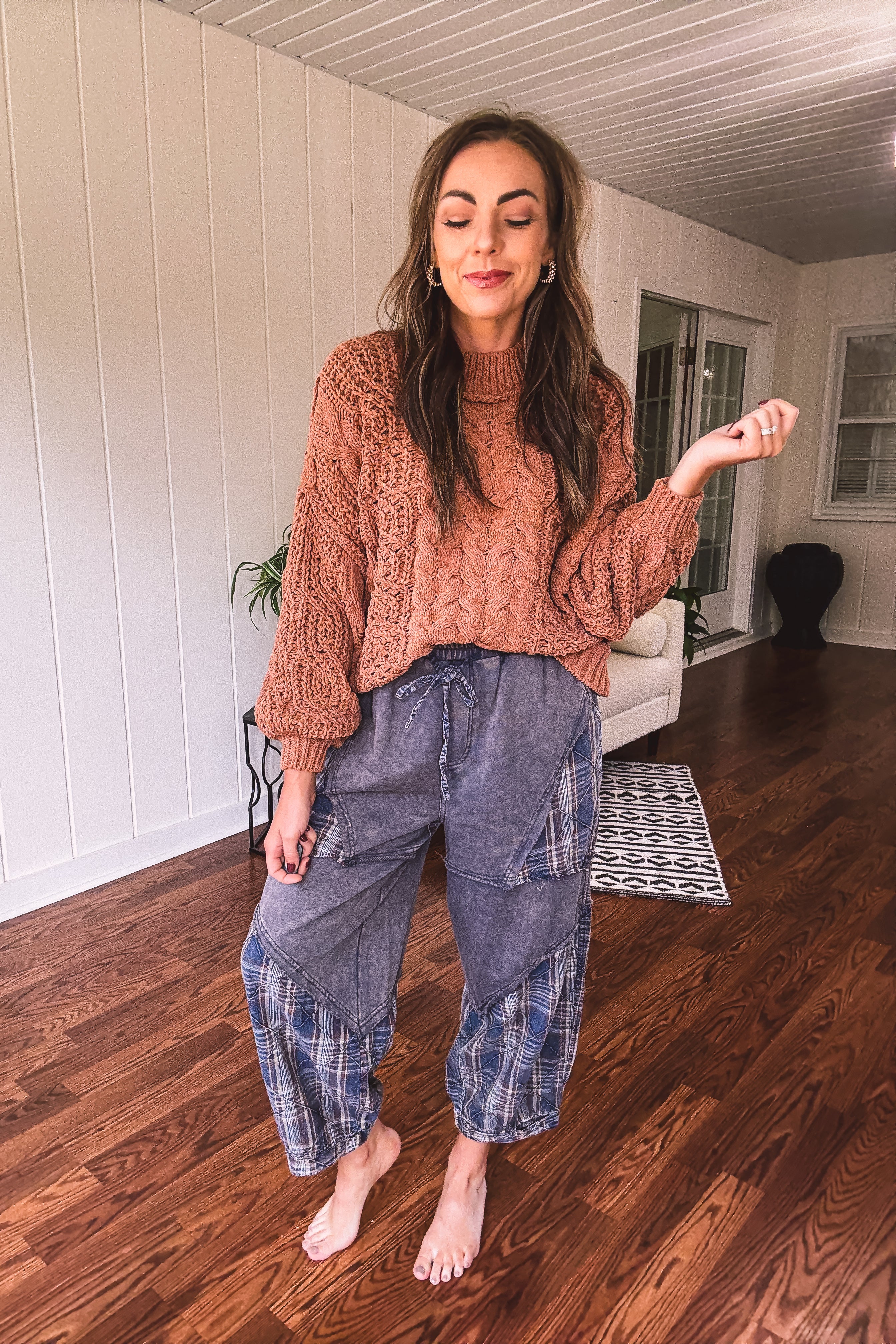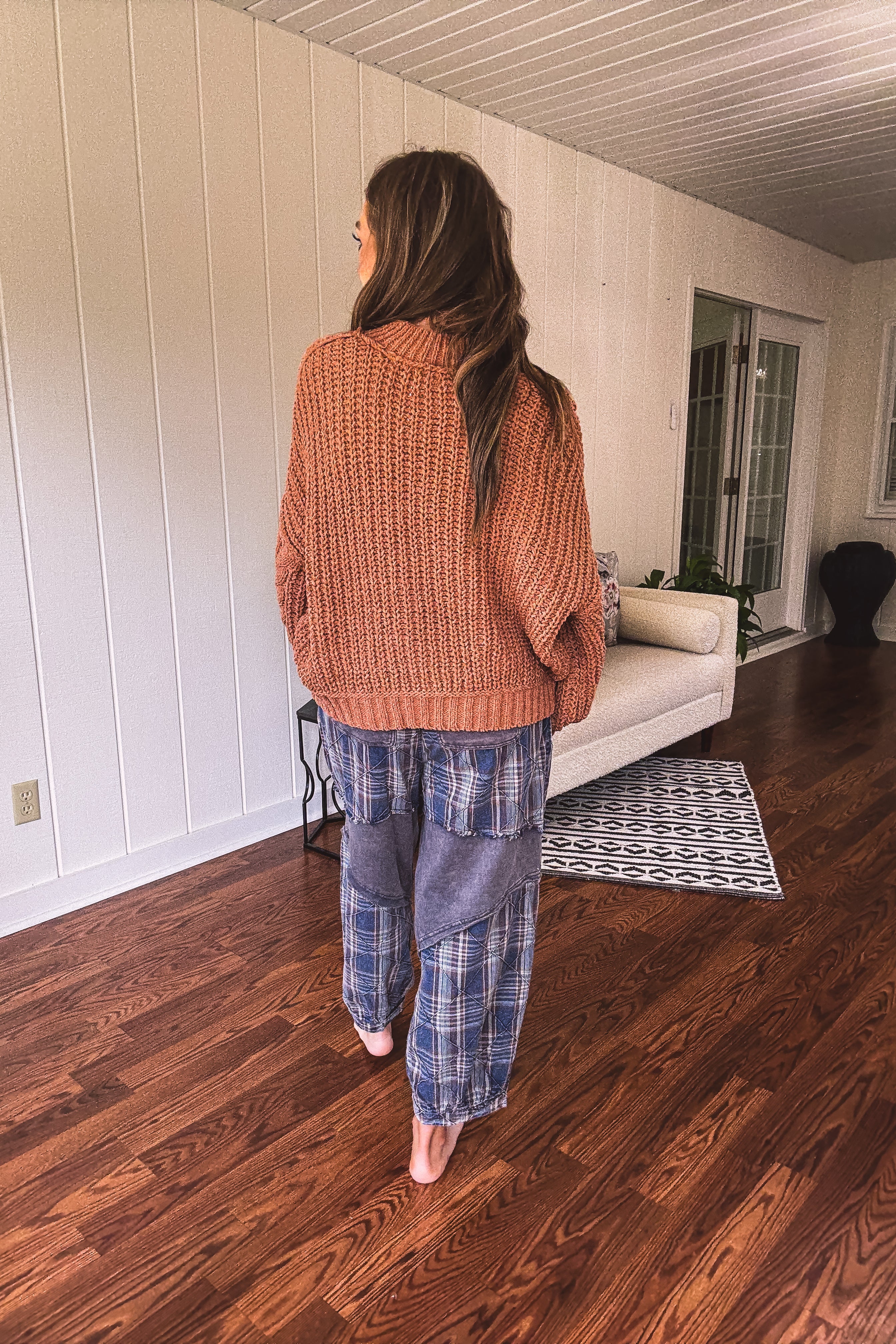 These boho pants blend mineral washed navy terry knit with navy, rust, and taupe plaid cotton for a fun, patchwork look. Featuring a drawstring waist, handy side and back pockets, and cuffed hems, they’re comfy and stylish. Perfect for transitioning from summer tees and tanks to cozy fall sweaters and shackets with effortless flair.