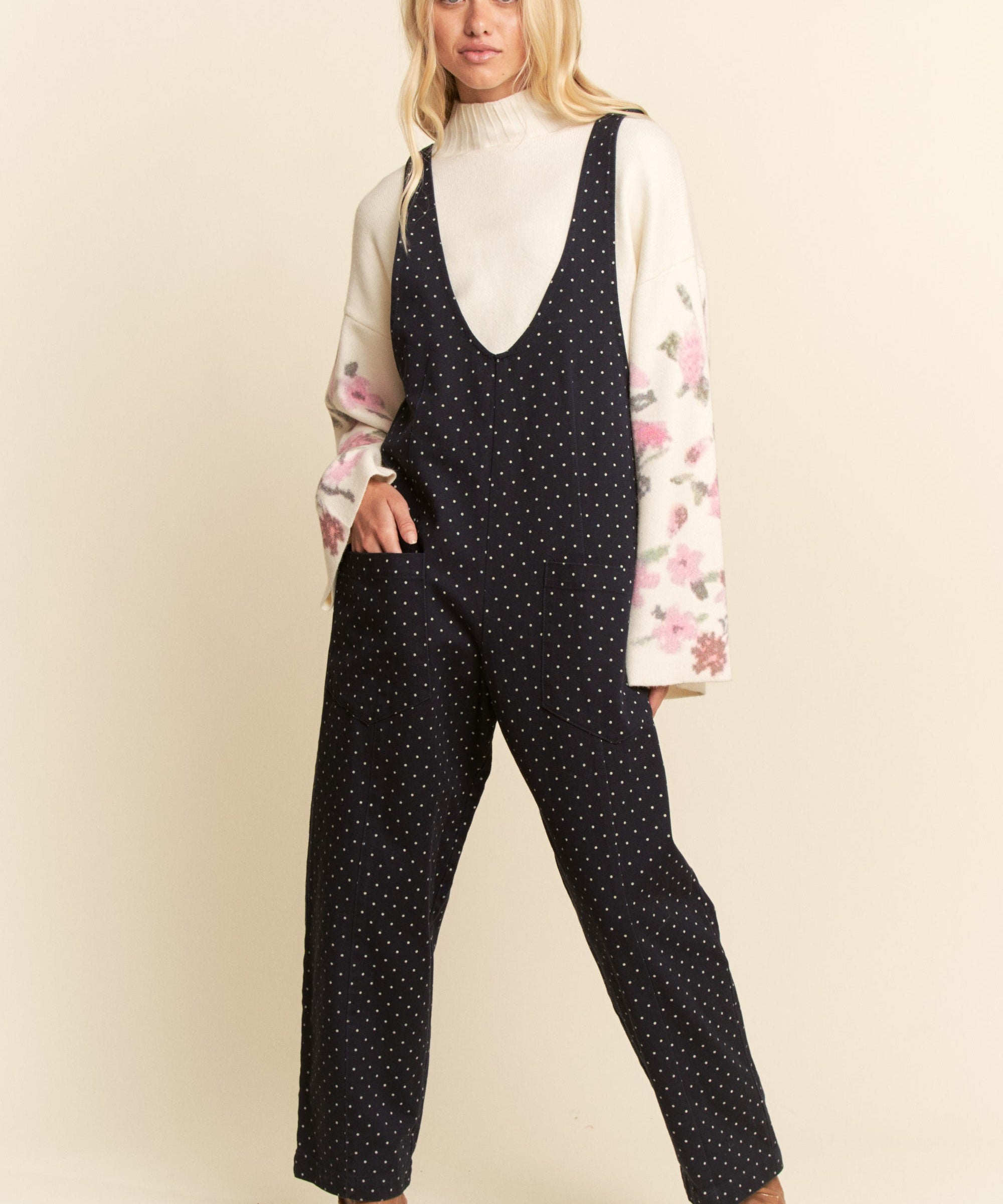 Navy Polka Dot Jumpsuit with Adjustable Straps