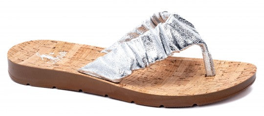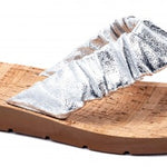 Start your summer off right with the playful Cool Off Silver Metallic flip flop from Corky's! The ruched metallic upper, paired with the signature cork cushioned footbed, makes these slip-ons a must-have for your summer wardrobe. Whether you're lounging by the pool or hitting the shops with your besties, you'll stay cool and comfy in these quirky and fun sandals!
