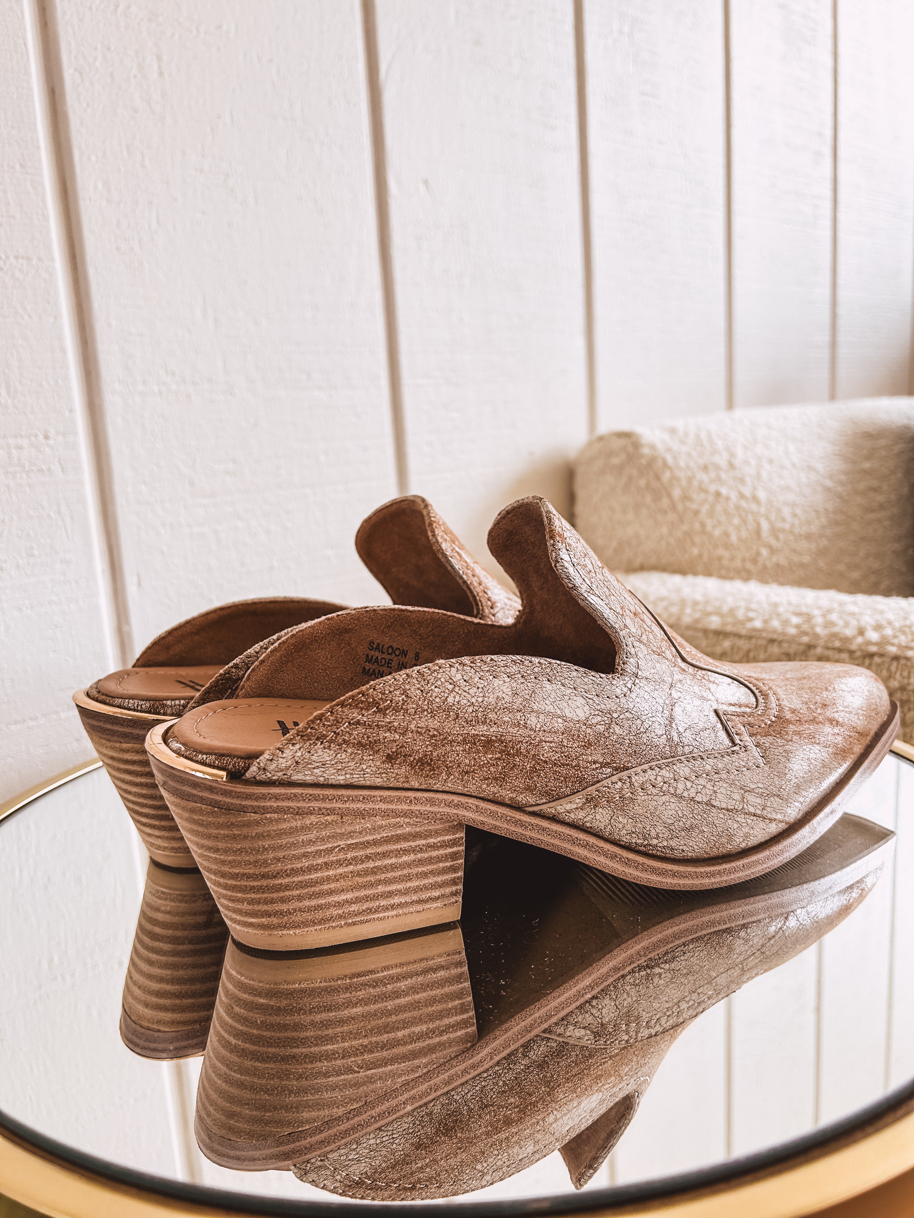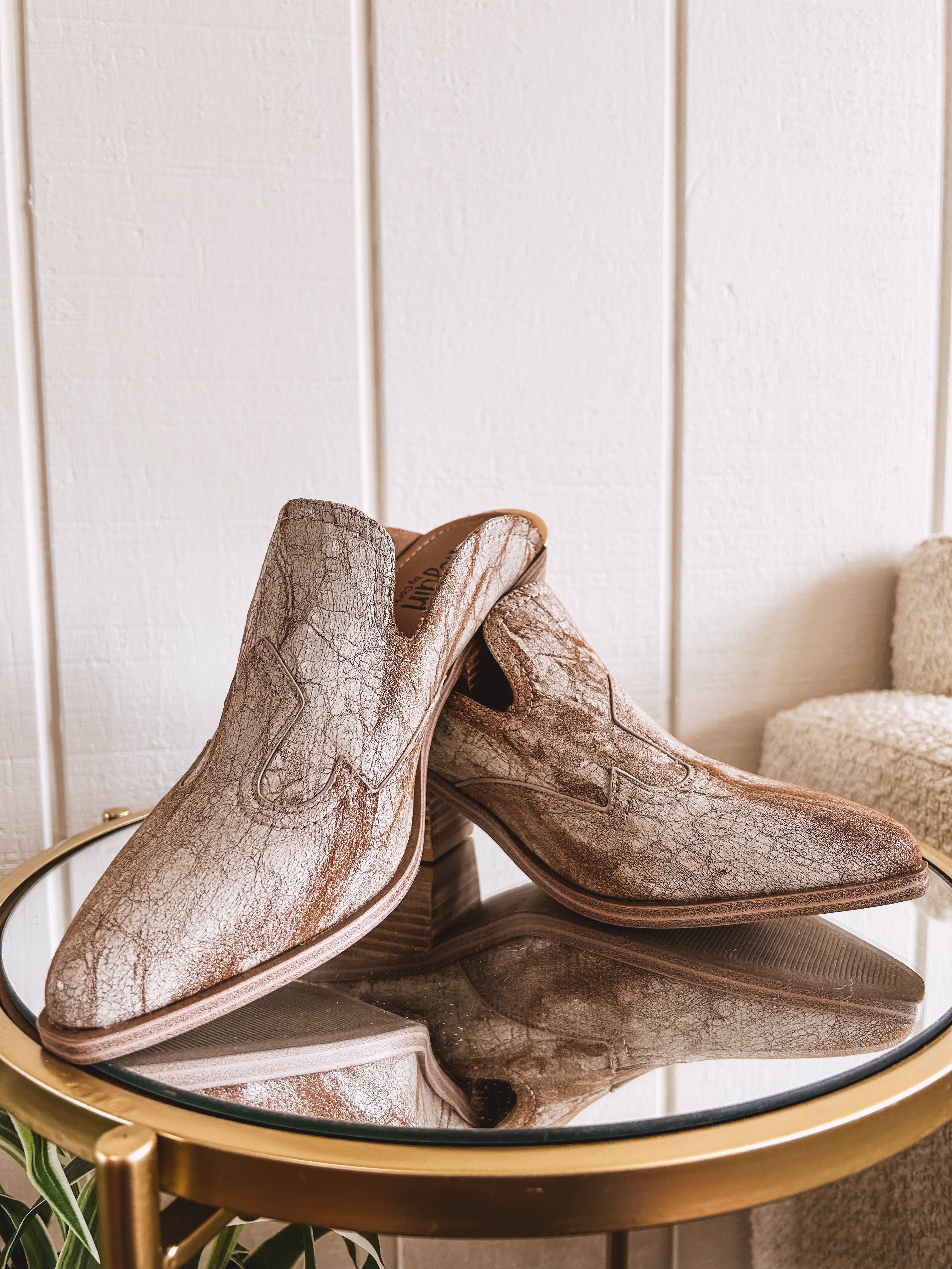 Step up your style with these distressed silver western mules that sparkle with every step. A fun twist on the traditional cowgirl vibe, they slide on effortlessly and make a statement whether you're running errands or heading out for fun. Featuring a metallic silver distressed look, classic Western stitching, a pointed toe, and a comfy stacked heel perfect for all-day wear.