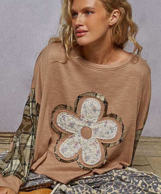 Mocha Patchwork Flower Balloon Sleeve Top