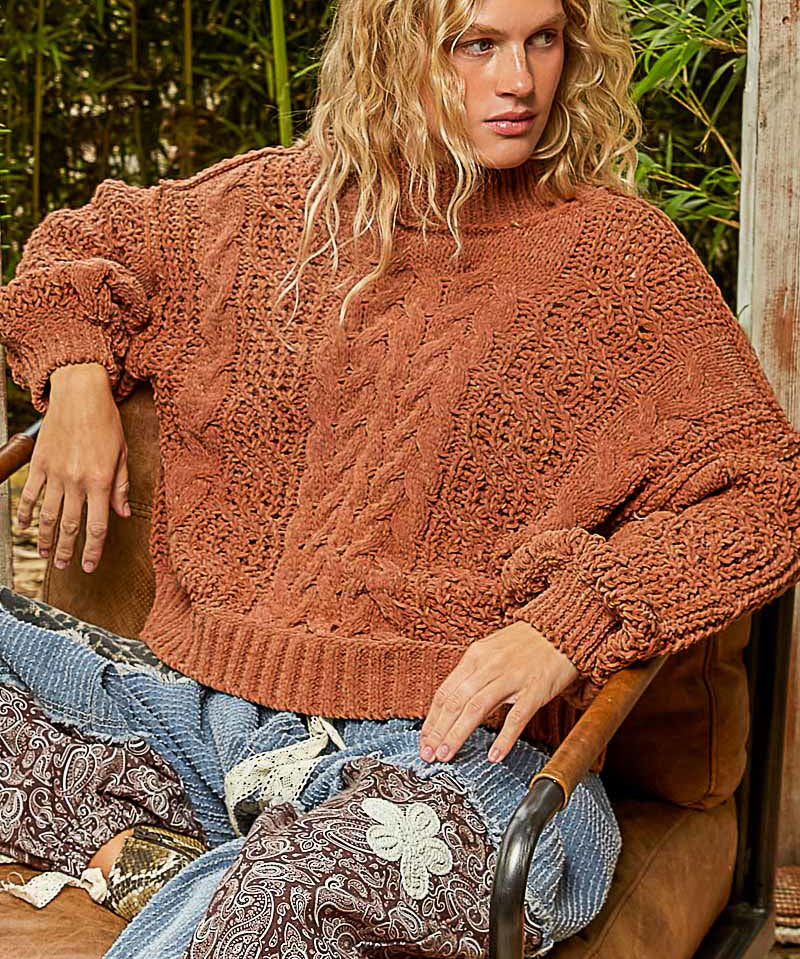 Burnt Topaz Chenille Mock Neck Balloon Sleeve Sweater