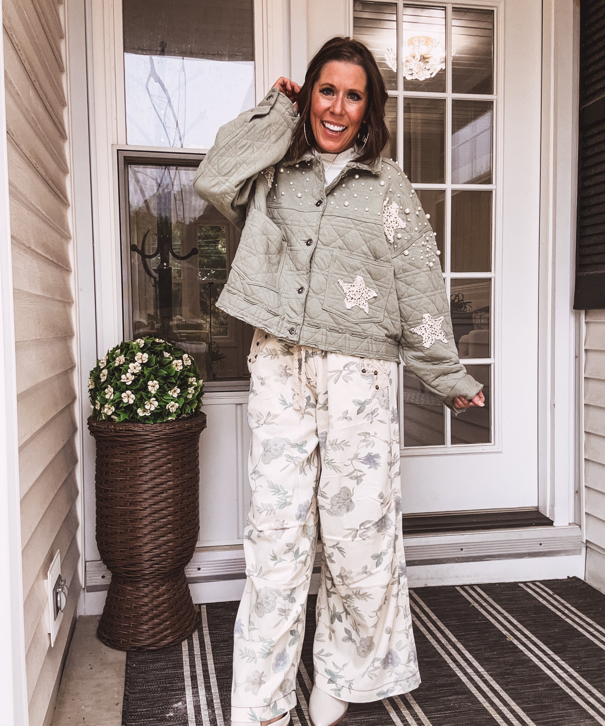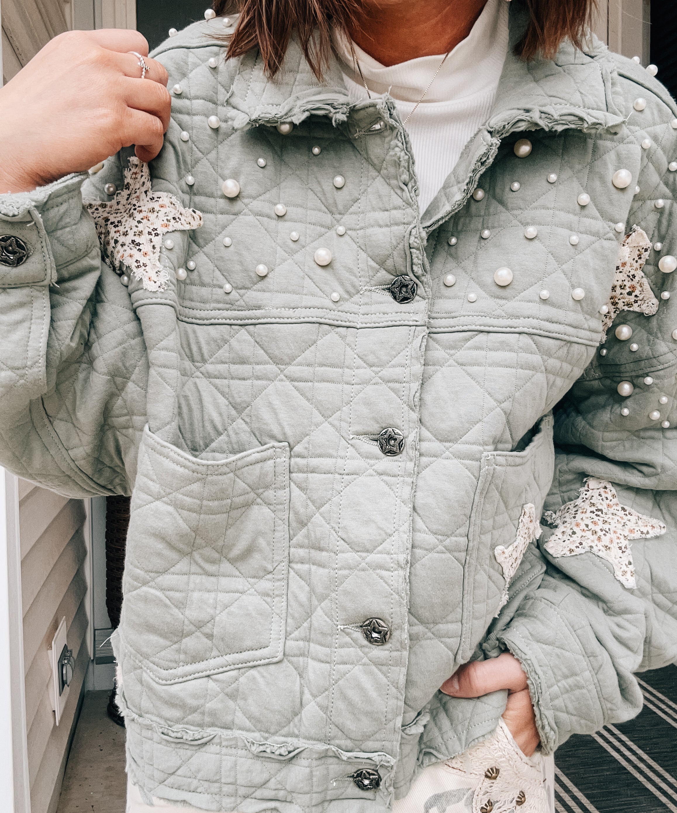 Sage Quilted Star Jacket with Pearls