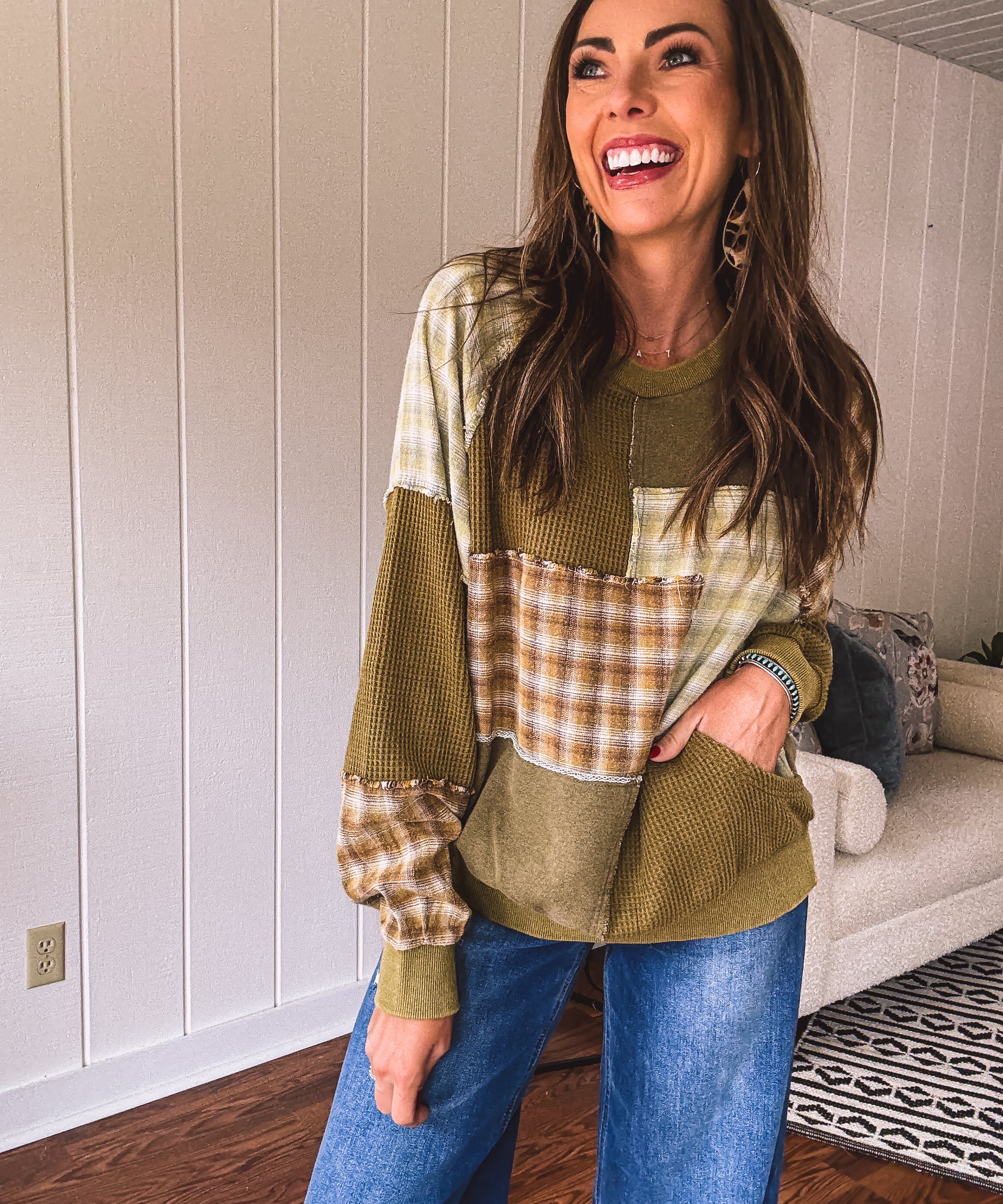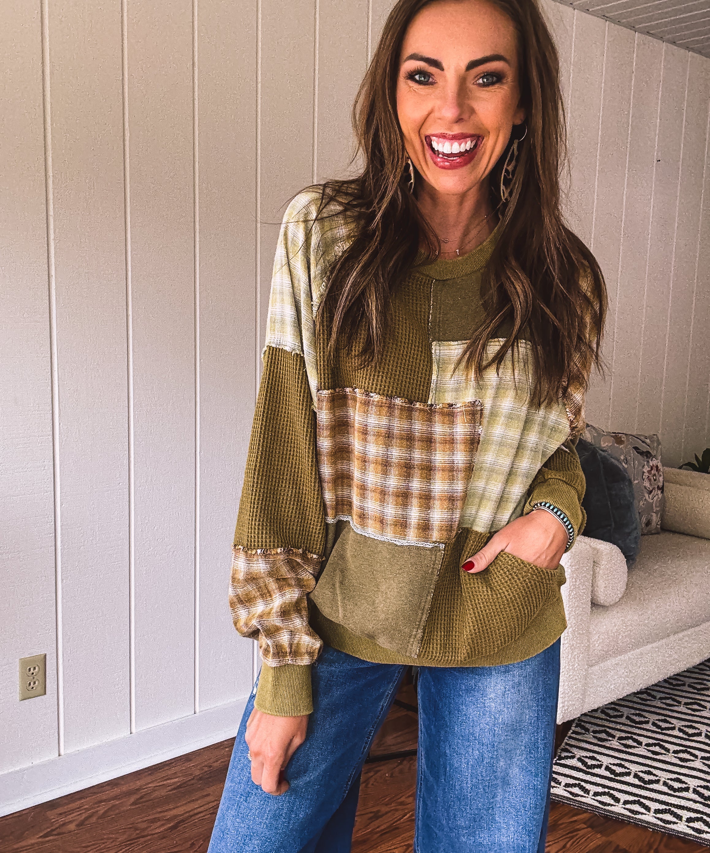 Olive Thermal Patchwork Mix & Match Pullover