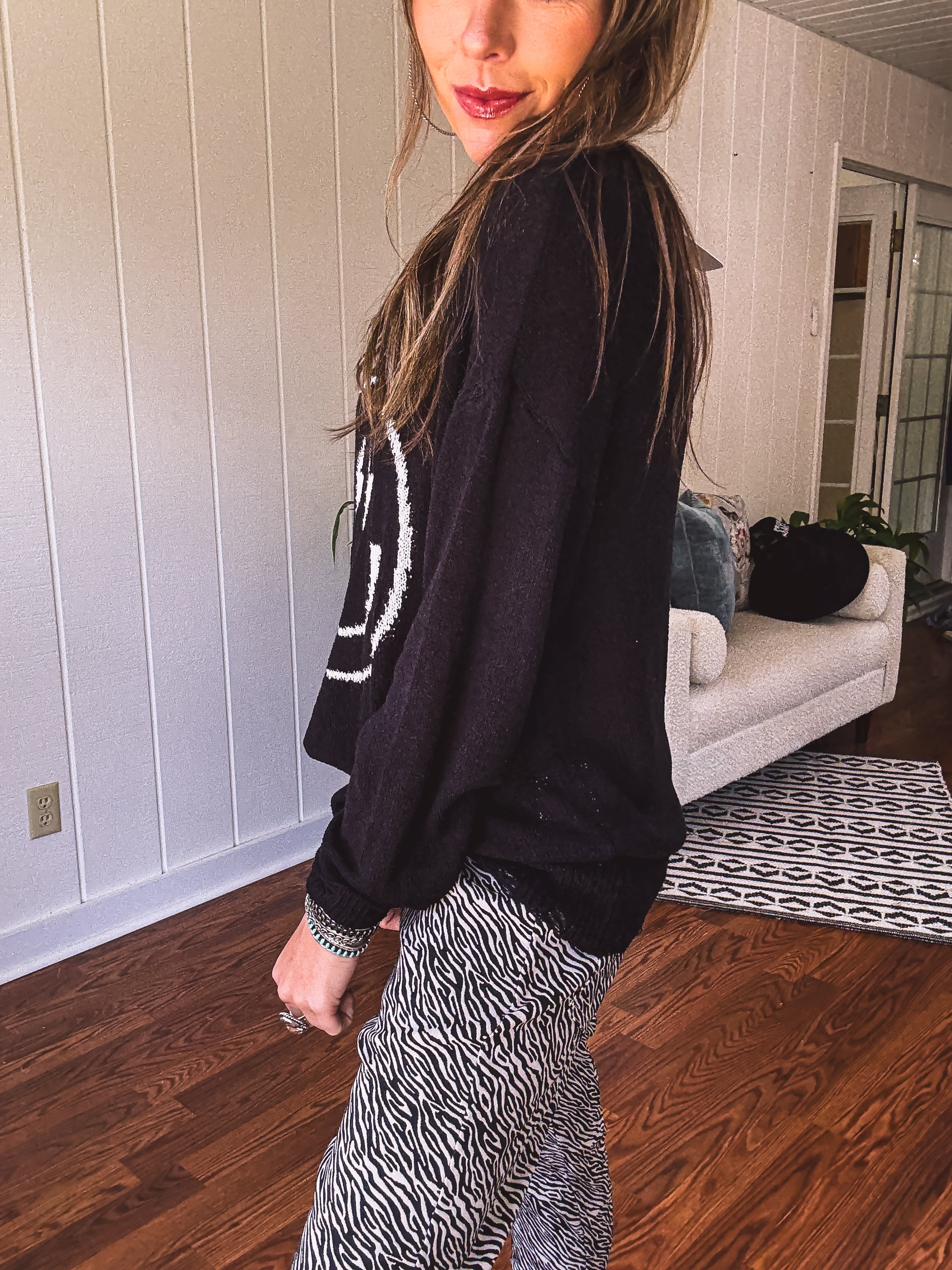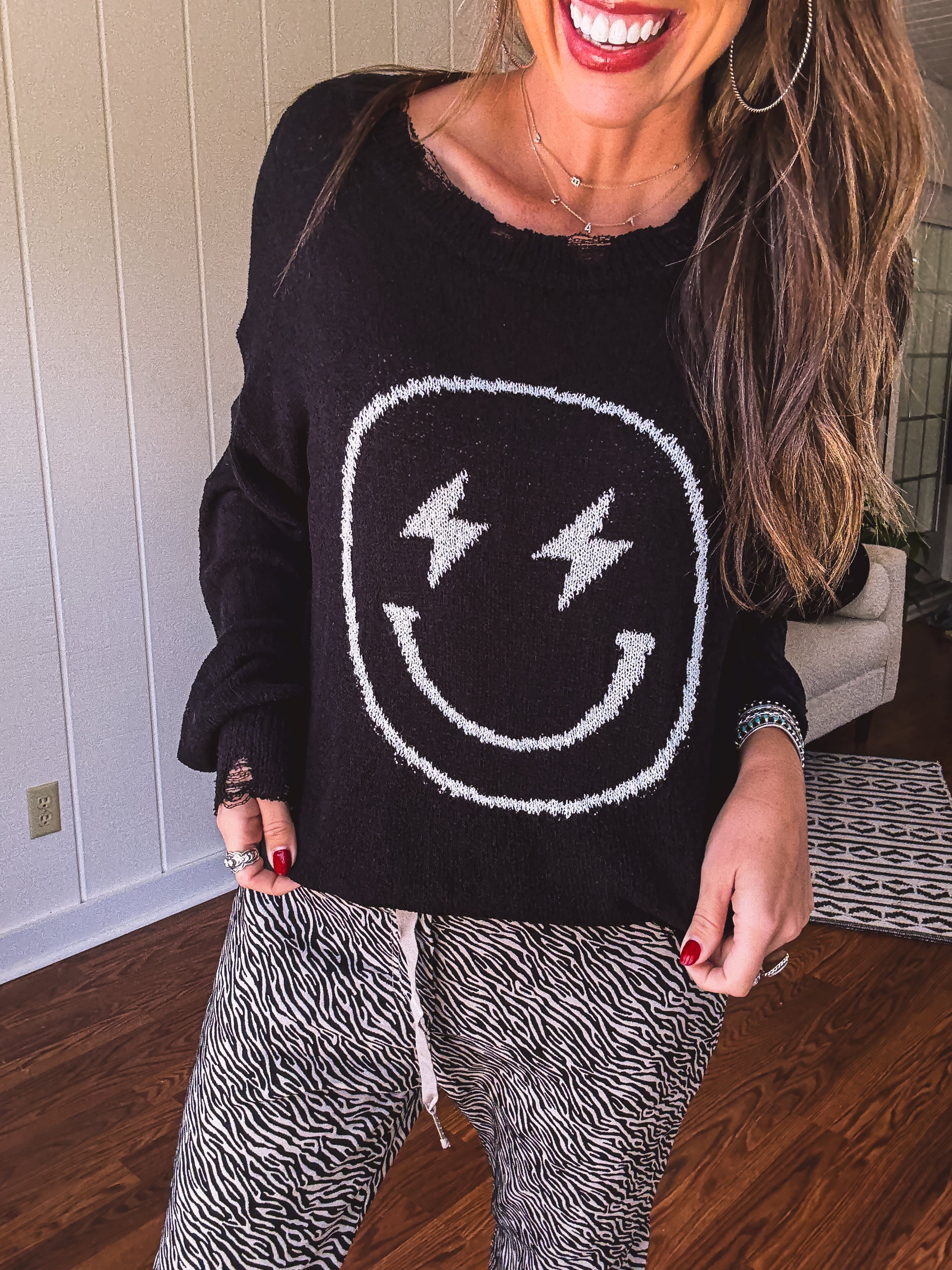 Indulge in the effortless comfort and edgy style of our Black Happy Bolt Woven Pullover. With its distressed hem and collar, lightweight knit fabric, and unique graphic featuring a blissful lightning bolt design, this sweater is a must-have for any trendsetter. Its relaxed fit makes it the perfect transition piece for any season.