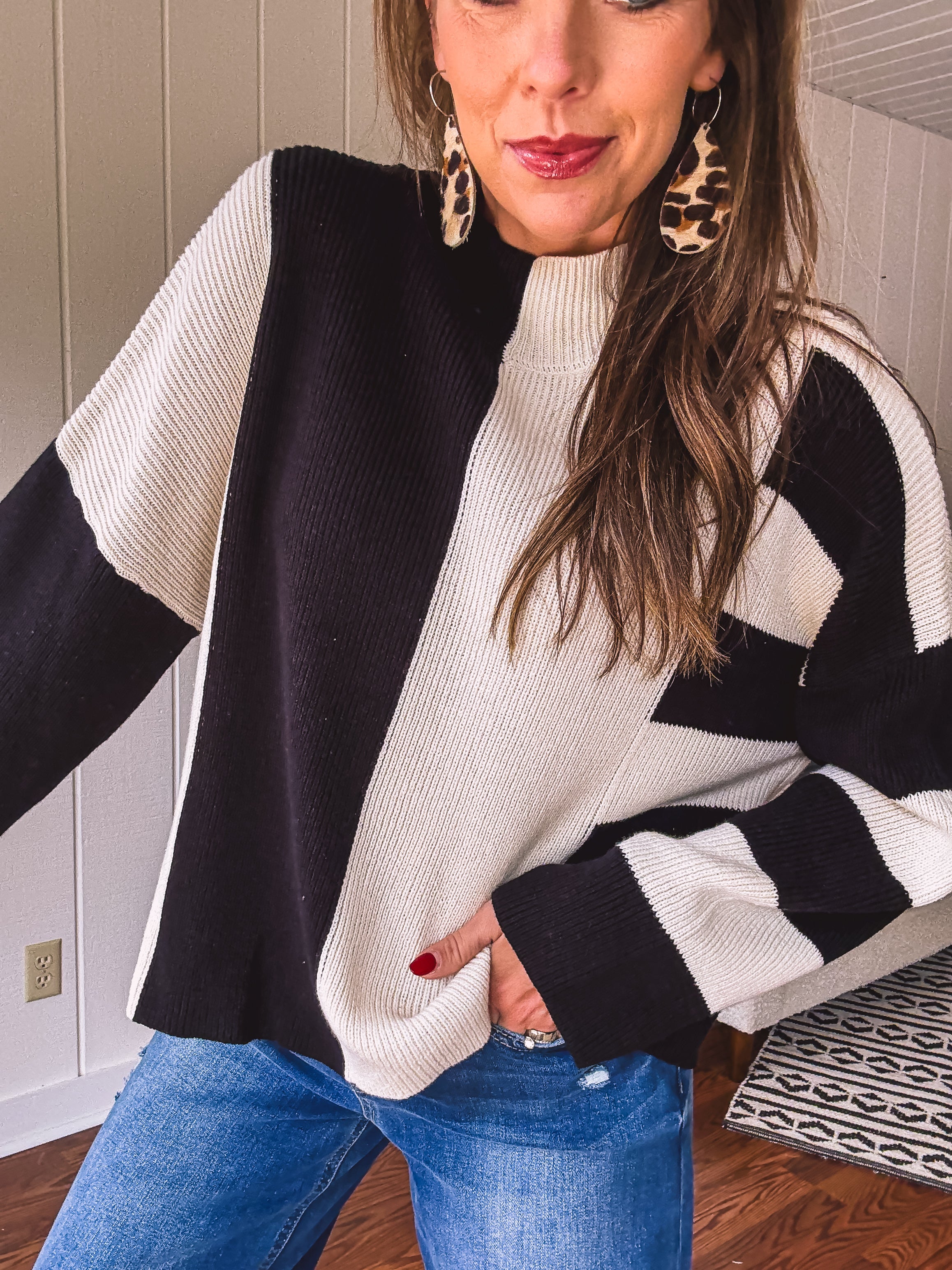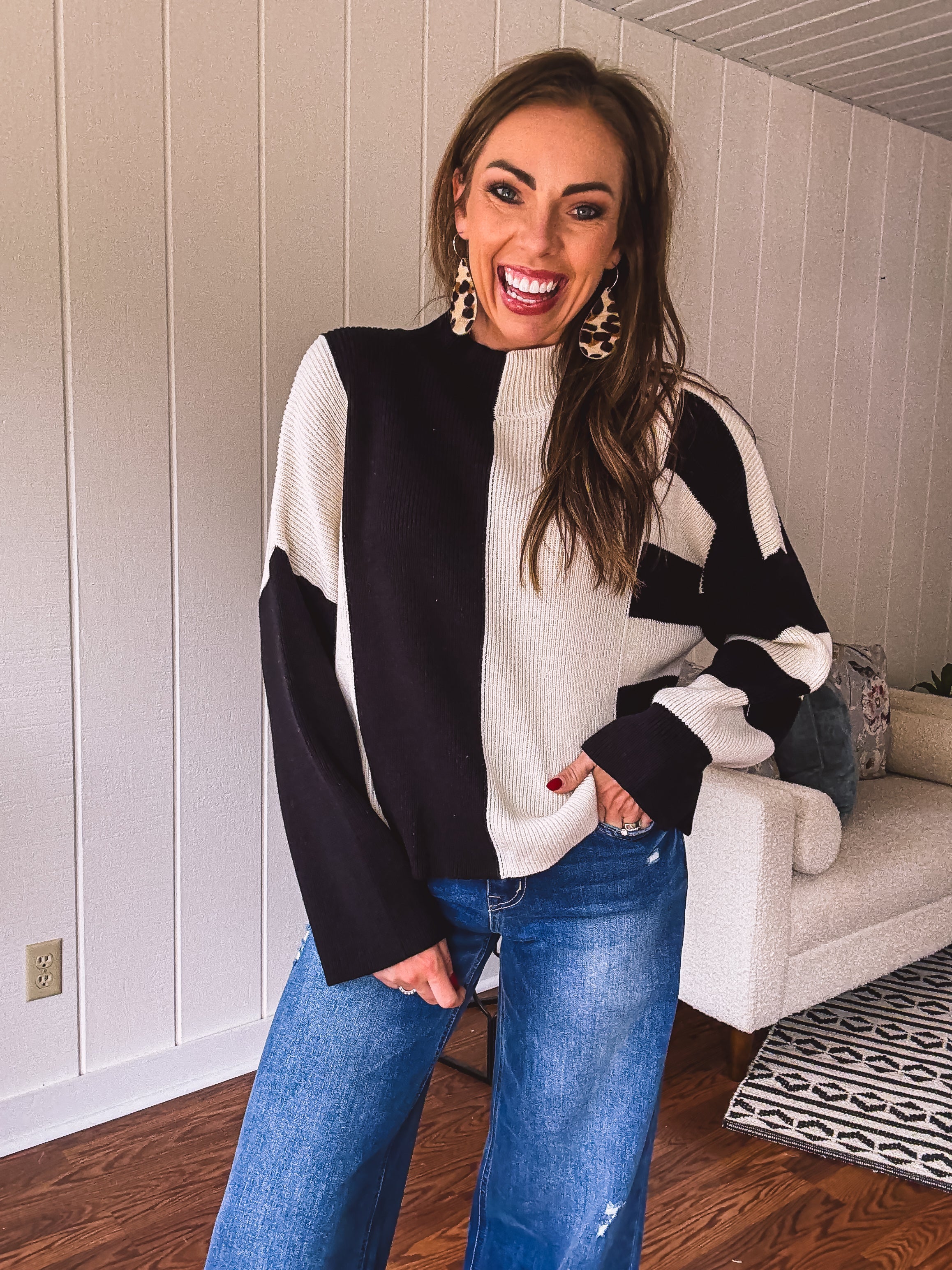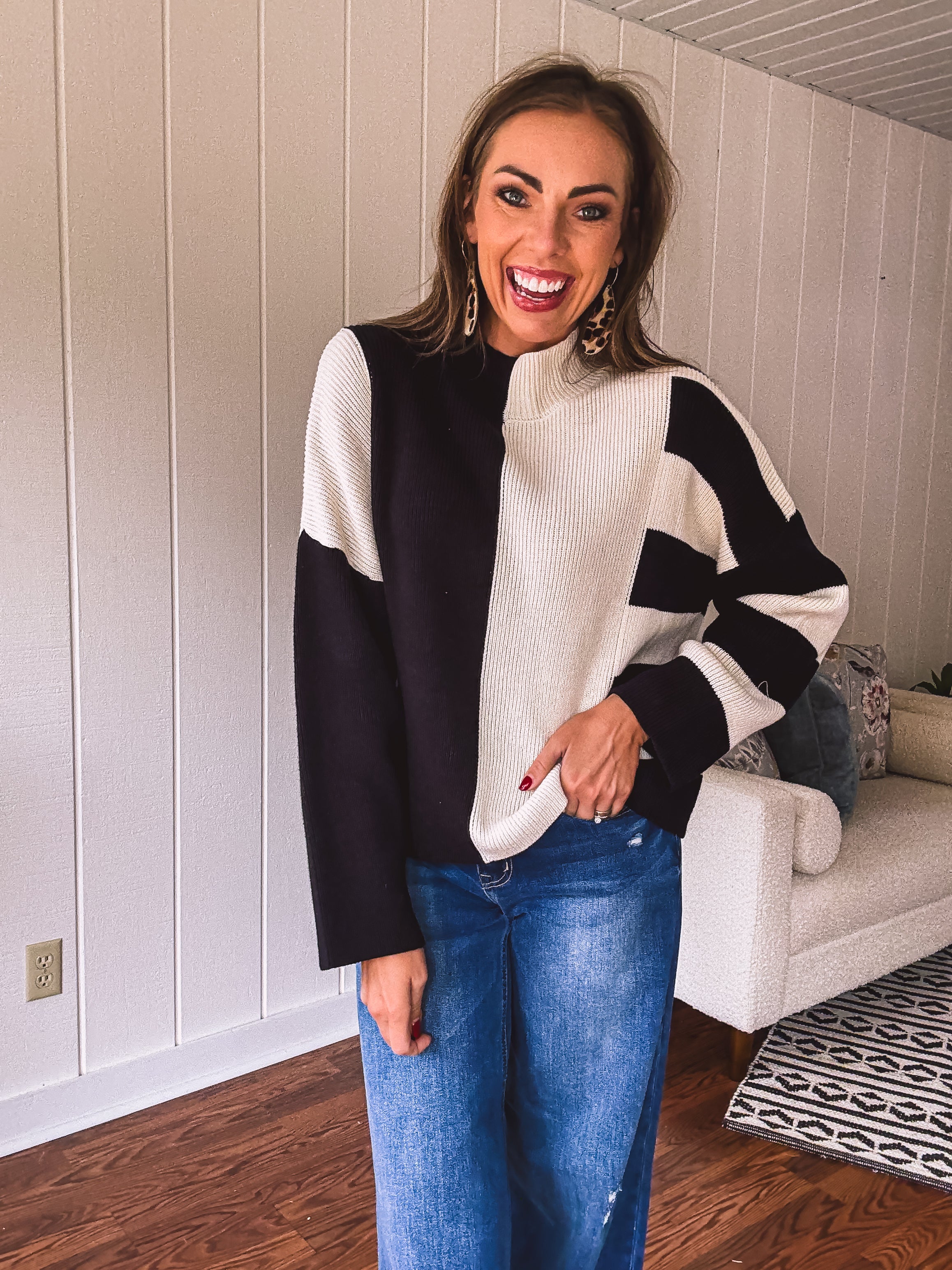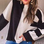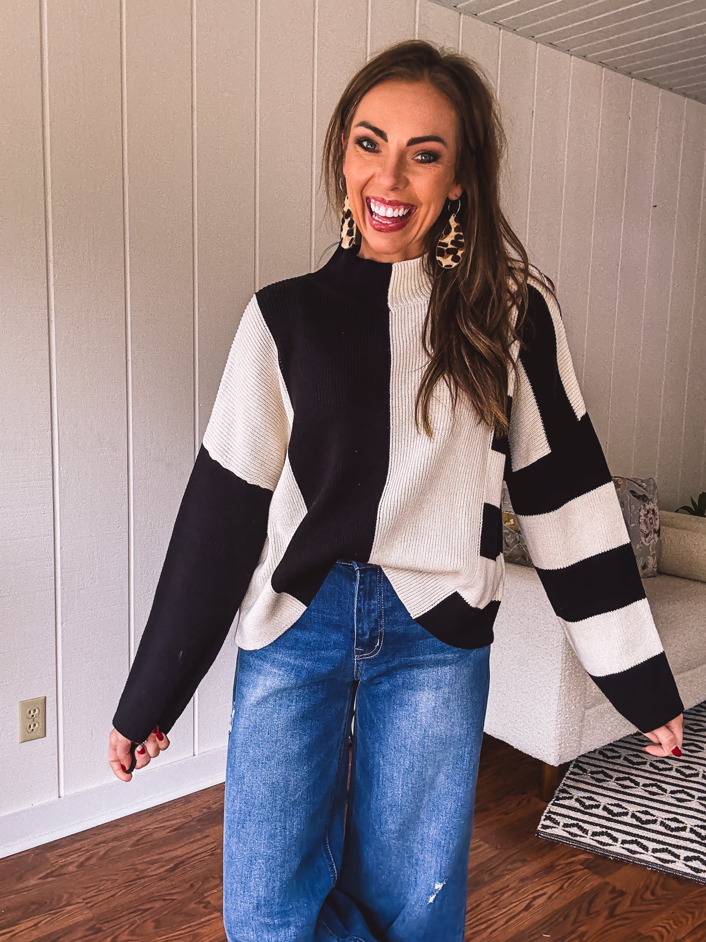This Black & White Stripe Colorblock Pullover Sweater blends style and comfort effortlessly. Featuring a striking ivory and black design, a cozy mock neck, and a relaxed boxy hem, it’s a fun way to upgrade your look. Pair it with your go-to jeans or dress it up with slacks for an easy, chic vibe any day of the week.