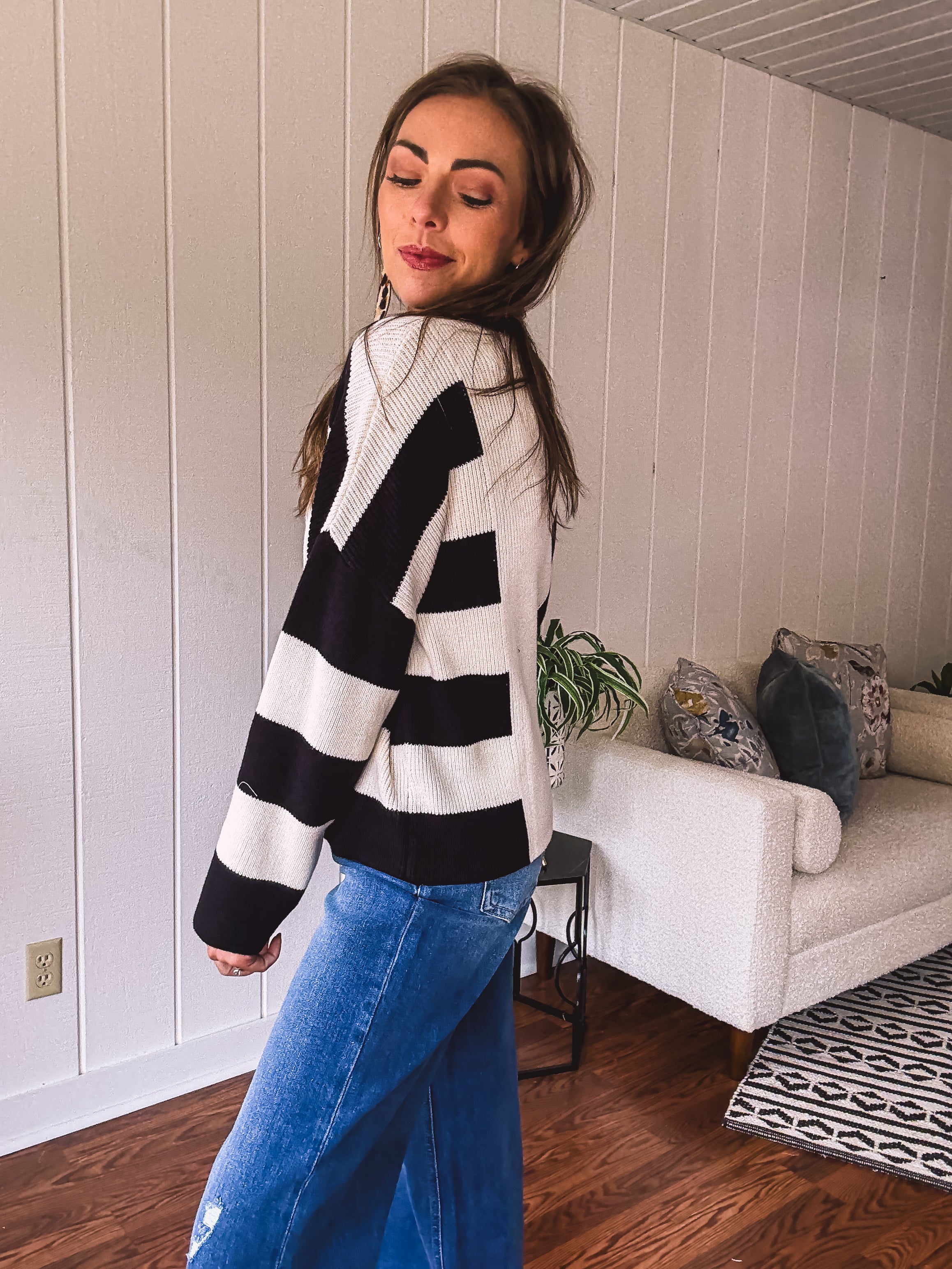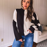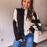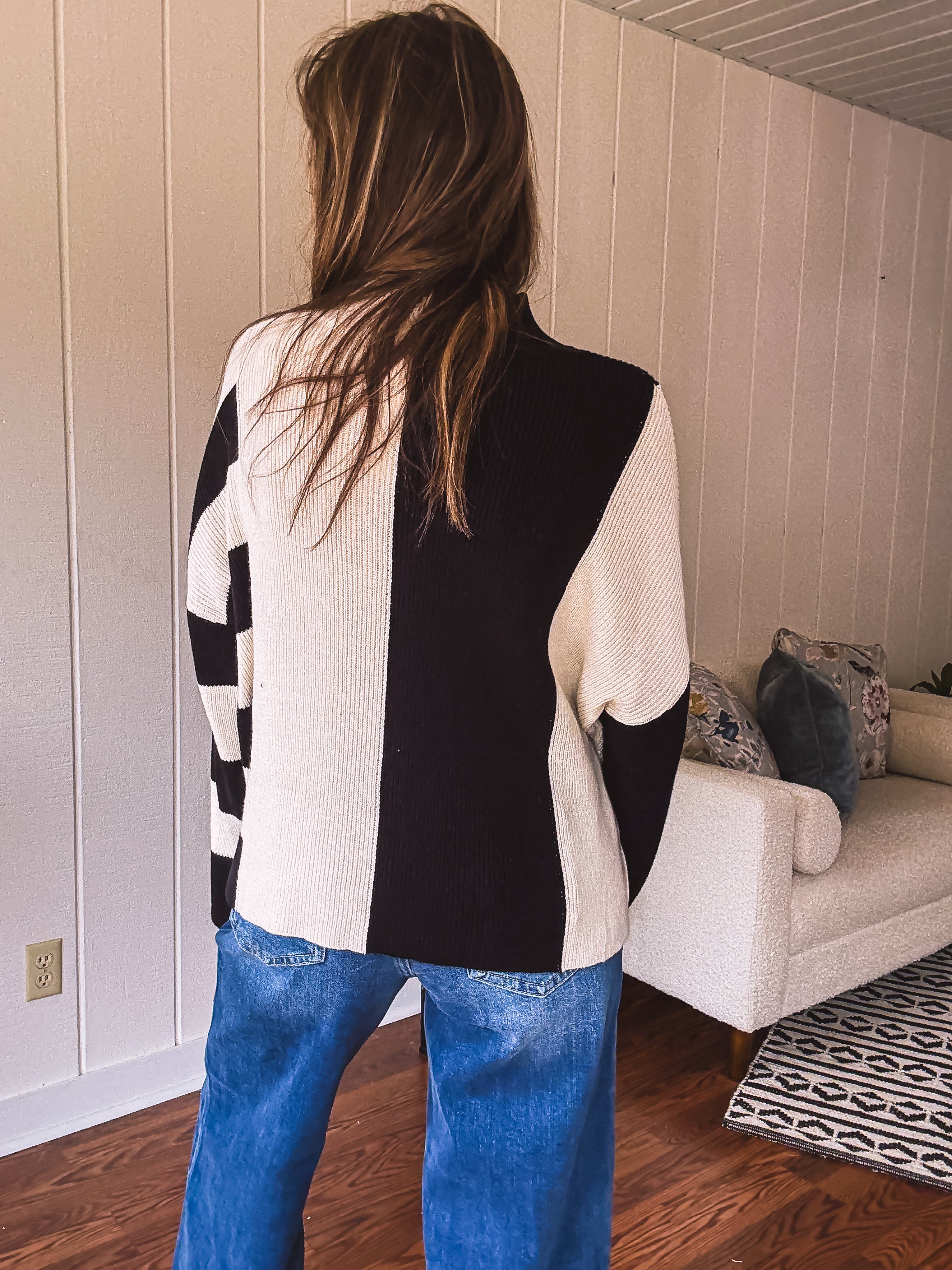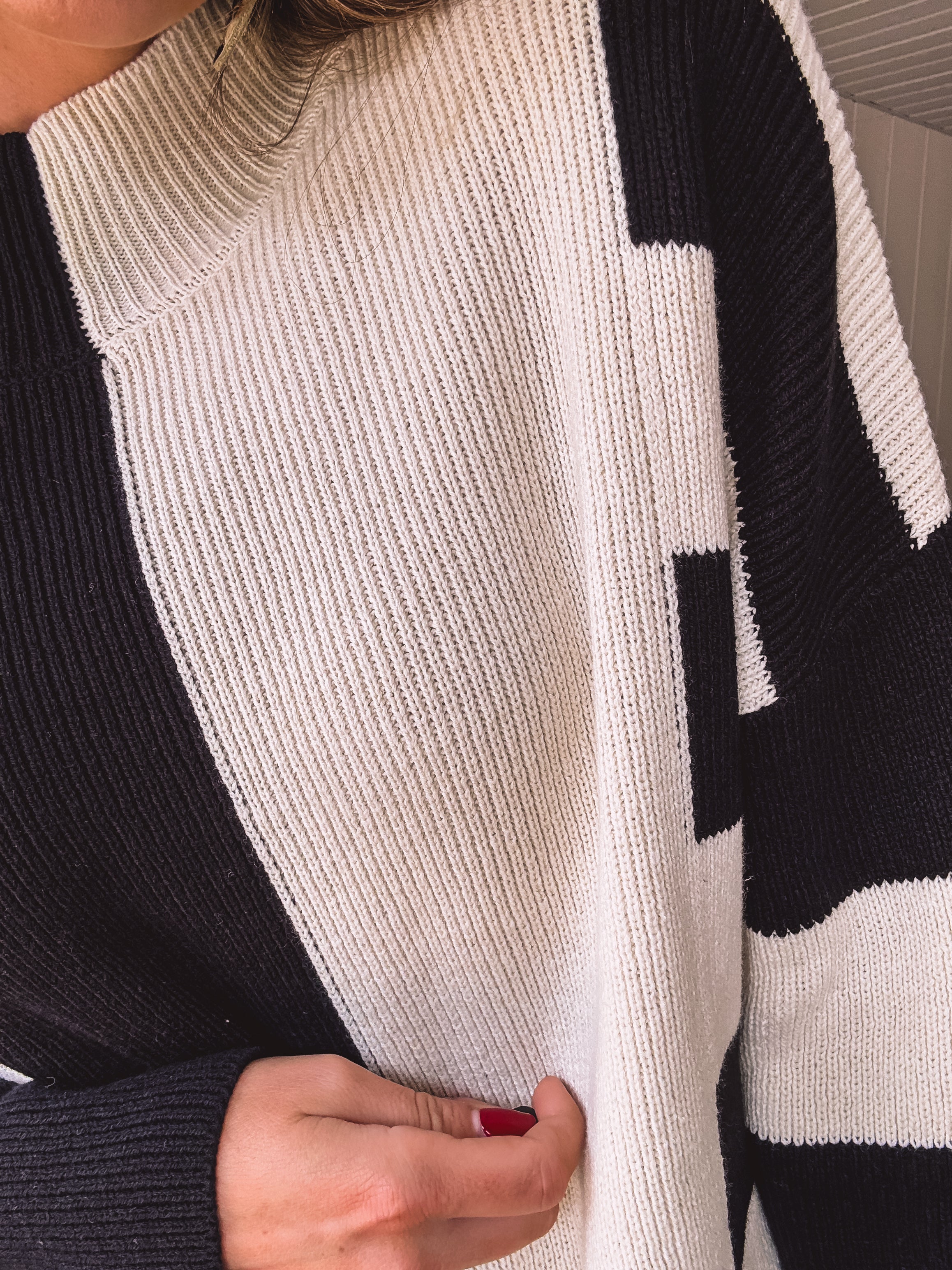 This Black & White Stripe Colorblock Pullover Sweater blends style and comfort effortlessly. Featuring a striking ivory and black design, a cozy mock neck, and a relaxed boxy hem, it’s a fun way to upgrade your look. Pair it with your go-to jeans or dress it up with slacks for an easy, chic vibe any day of the week.