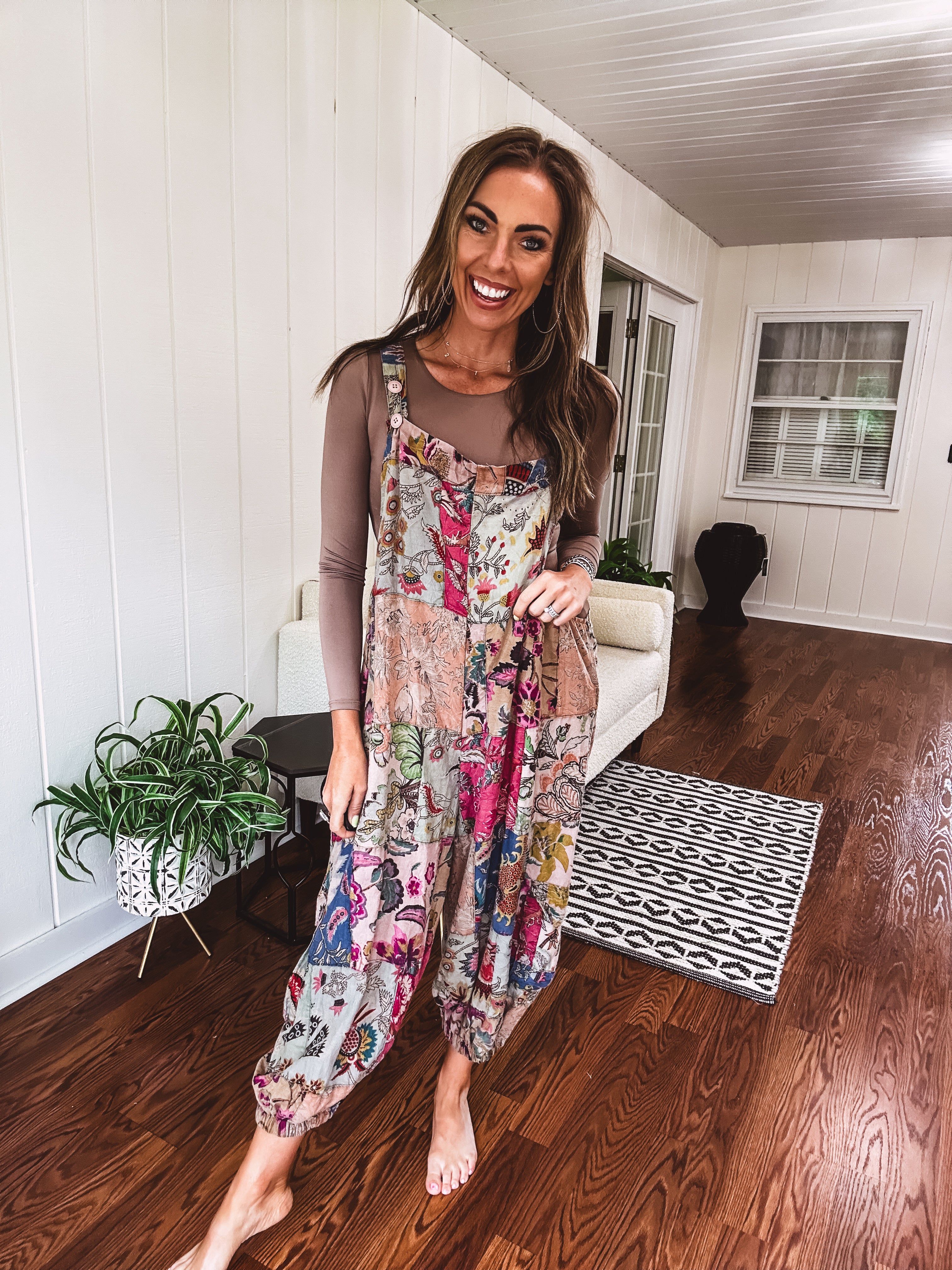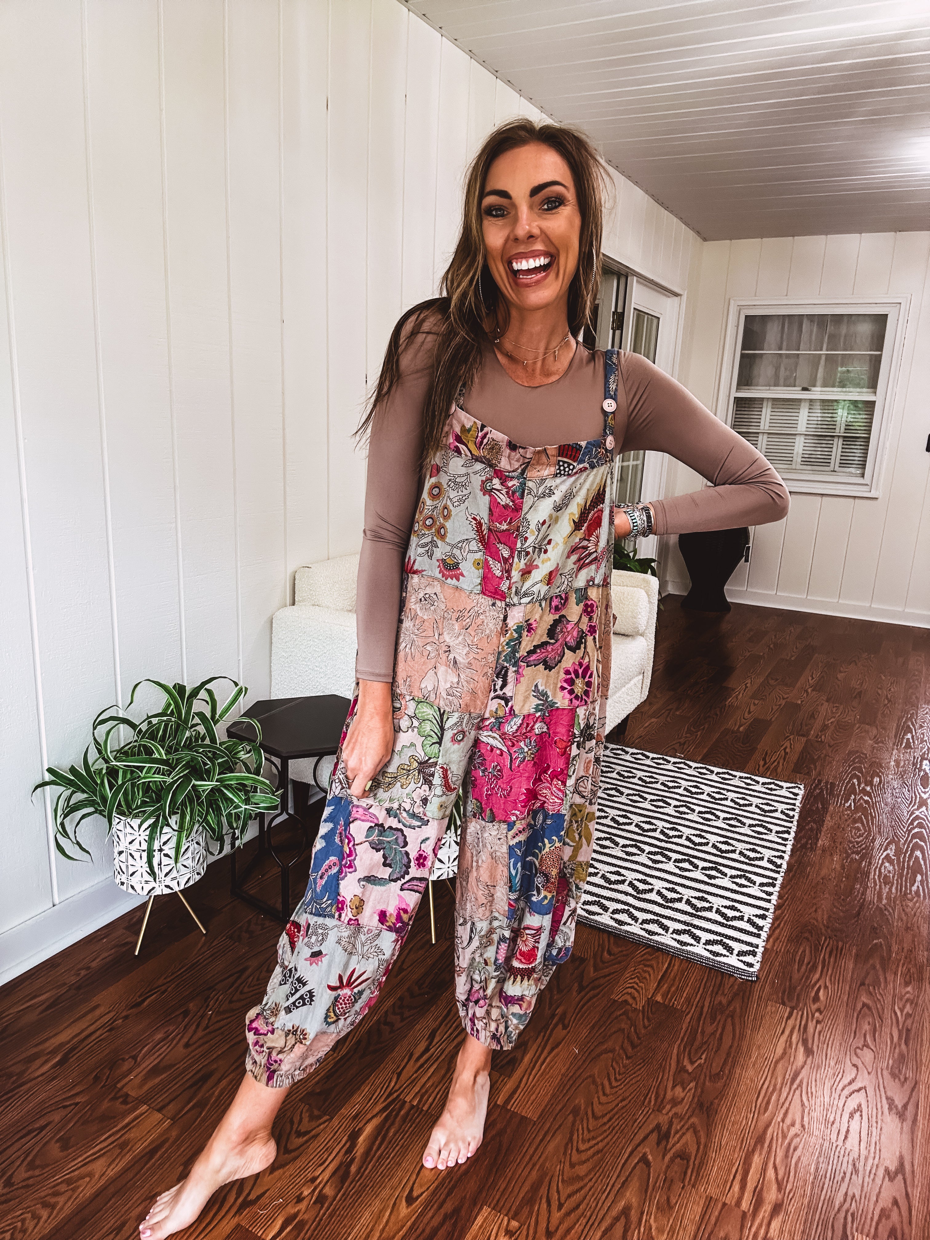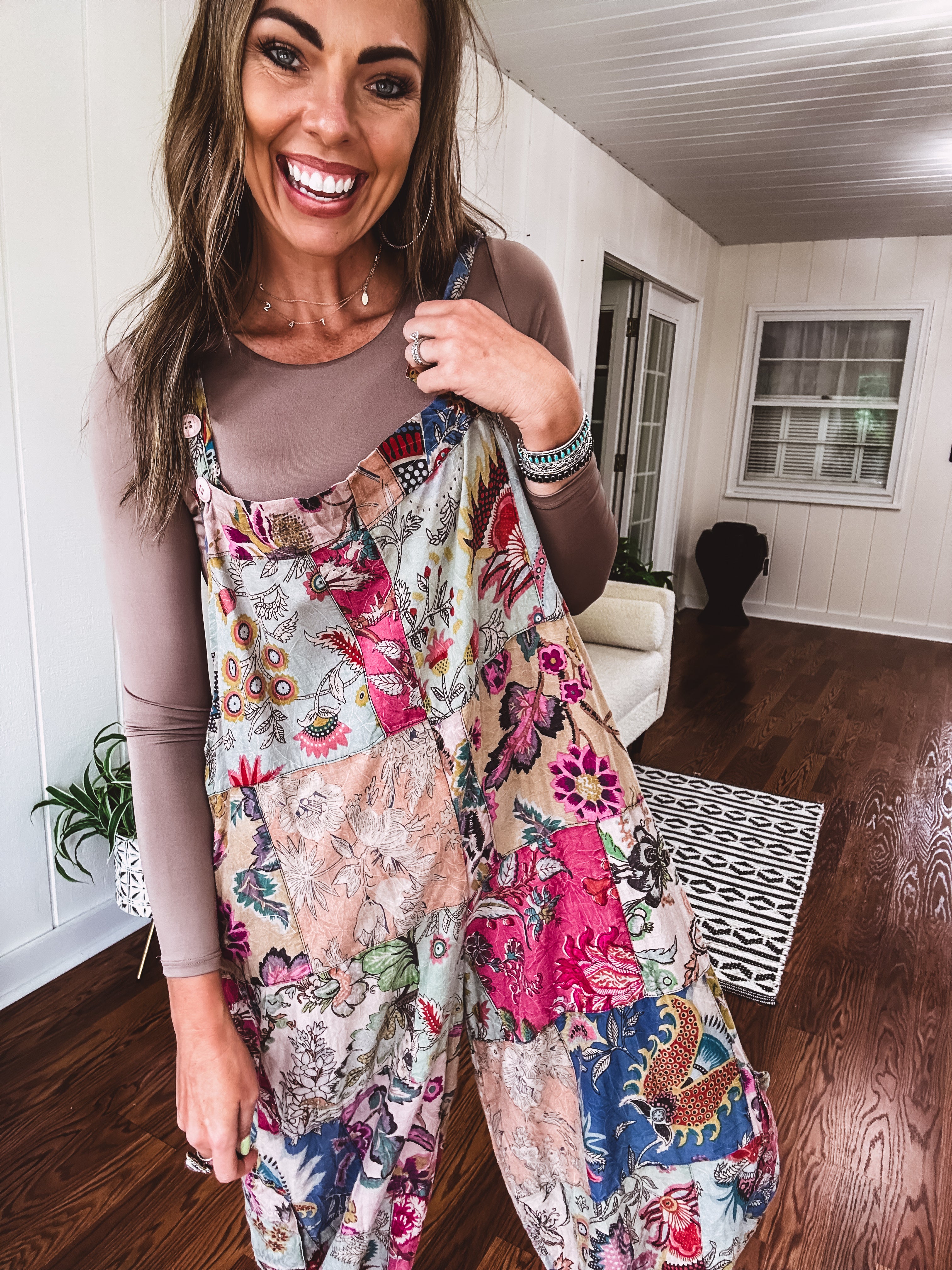 These Joyous Jamboree Slouchy Overalls from Jaded Gypsy feature a lightweight, breathable fabric with a funky floral patchwork in soft, muted tones. The elastic cuffs and relaxed fit give off a laid-back boho vibe, ideal for moving smoothly from summer into fall. Layer with a tank or your favorite long-sleeve mesh or tee, slip on some booties, and get ready to shine with your joyful spirit!