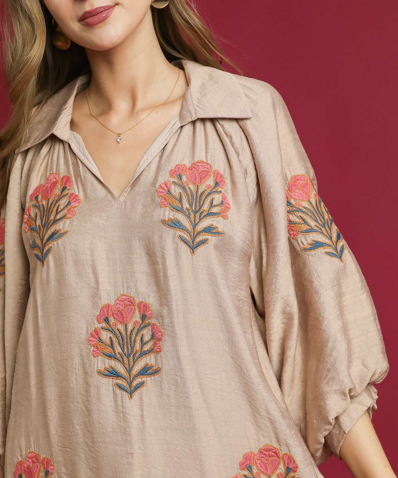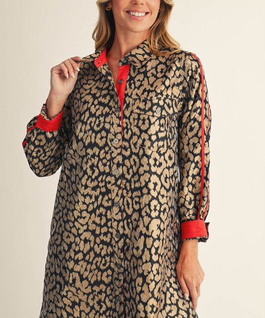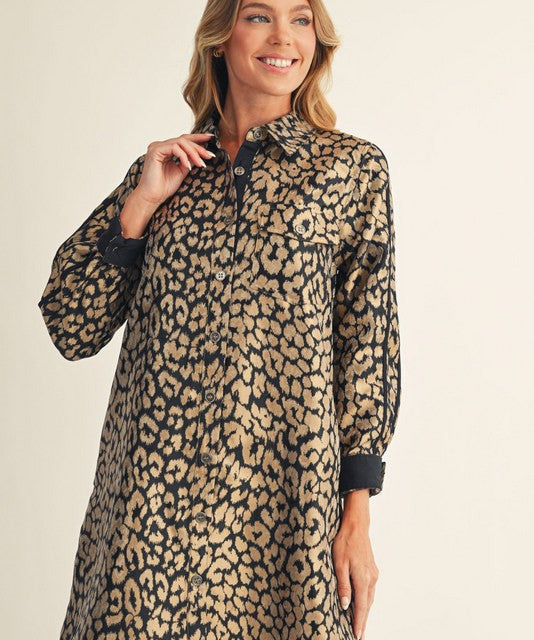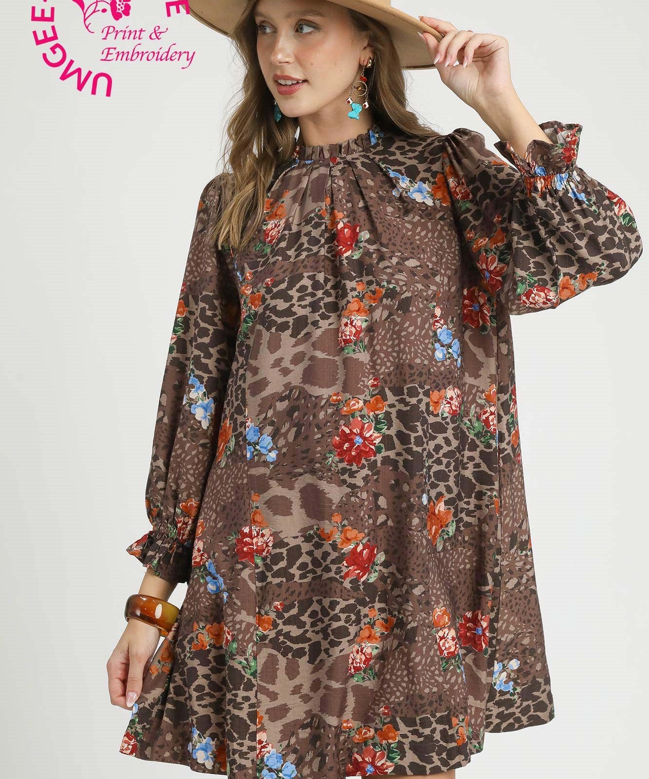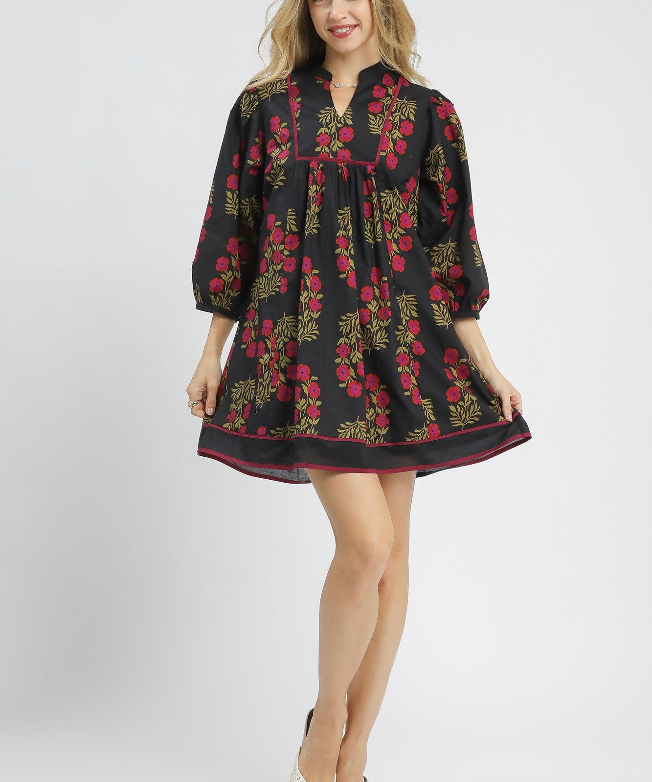 Black Gingko Leaf Printed Chiffon Dress with Smock Yoke