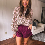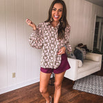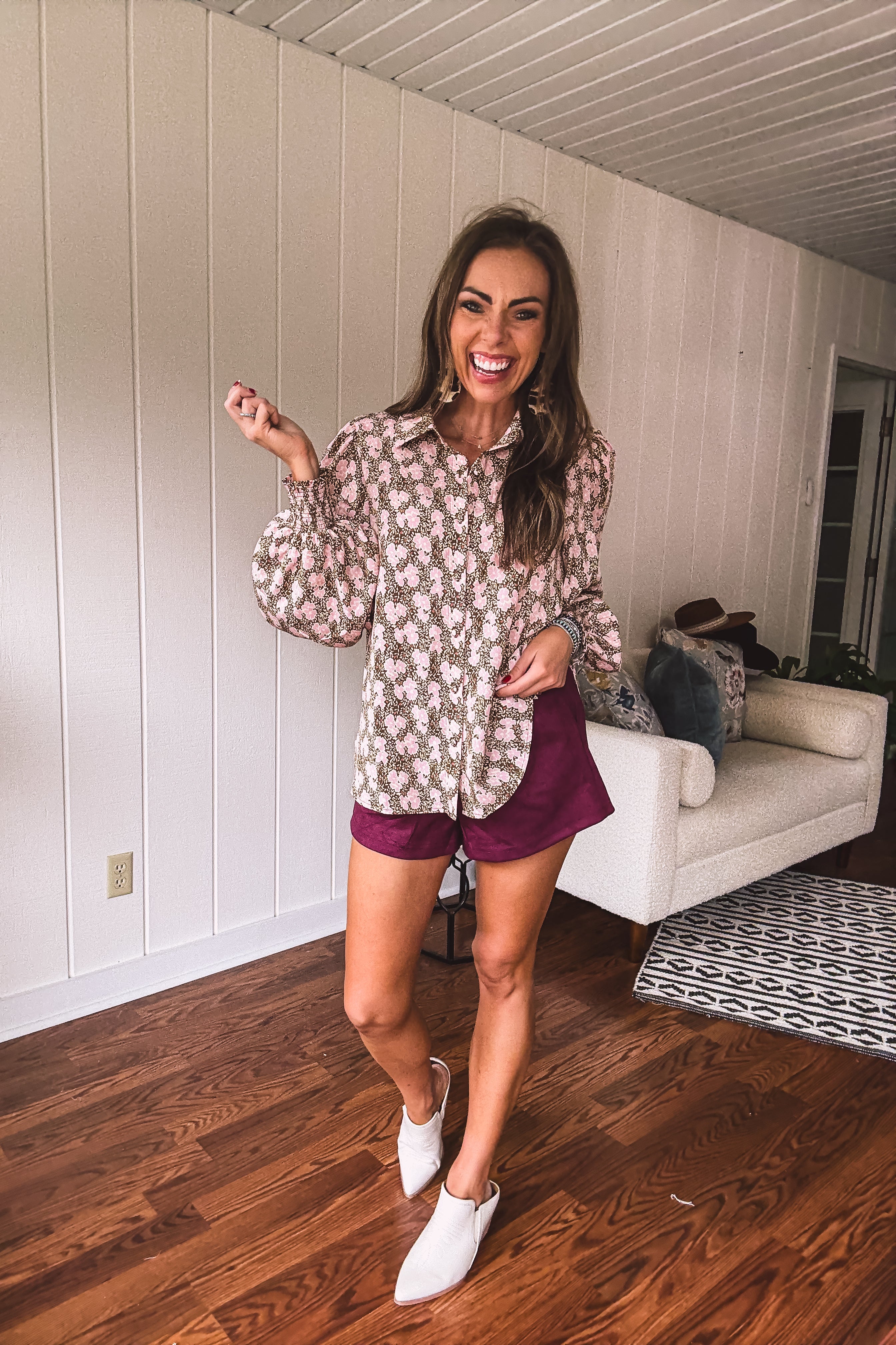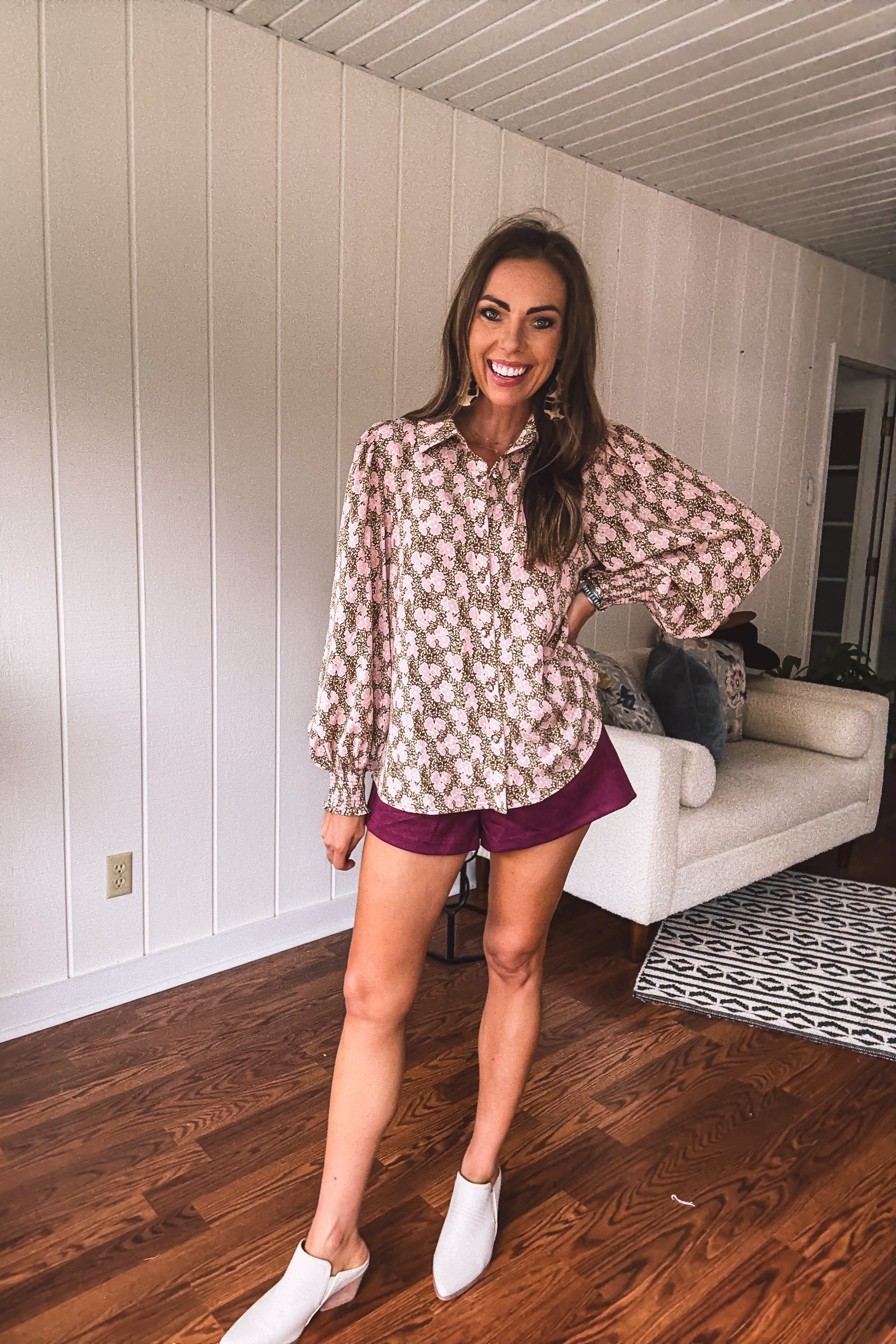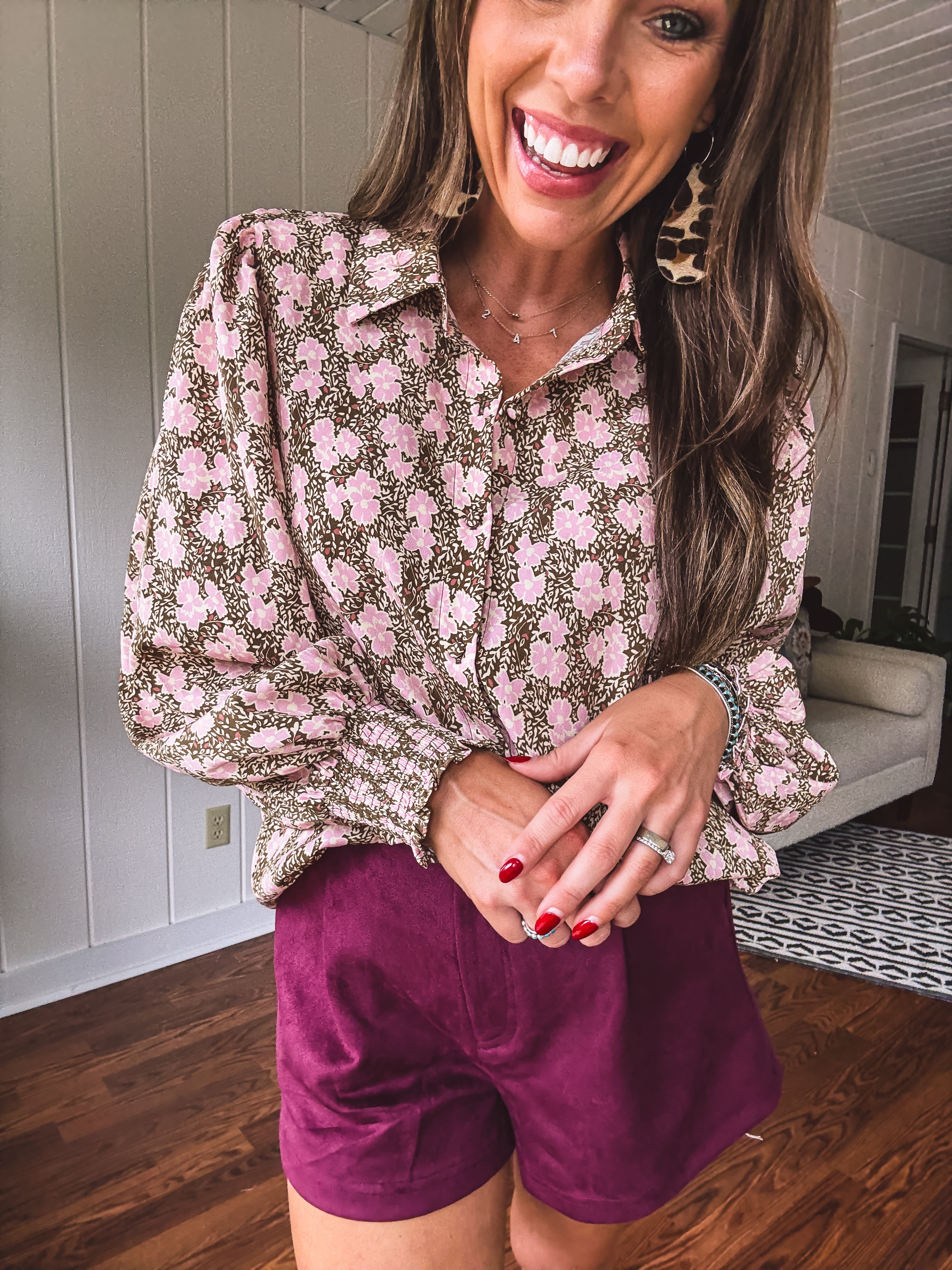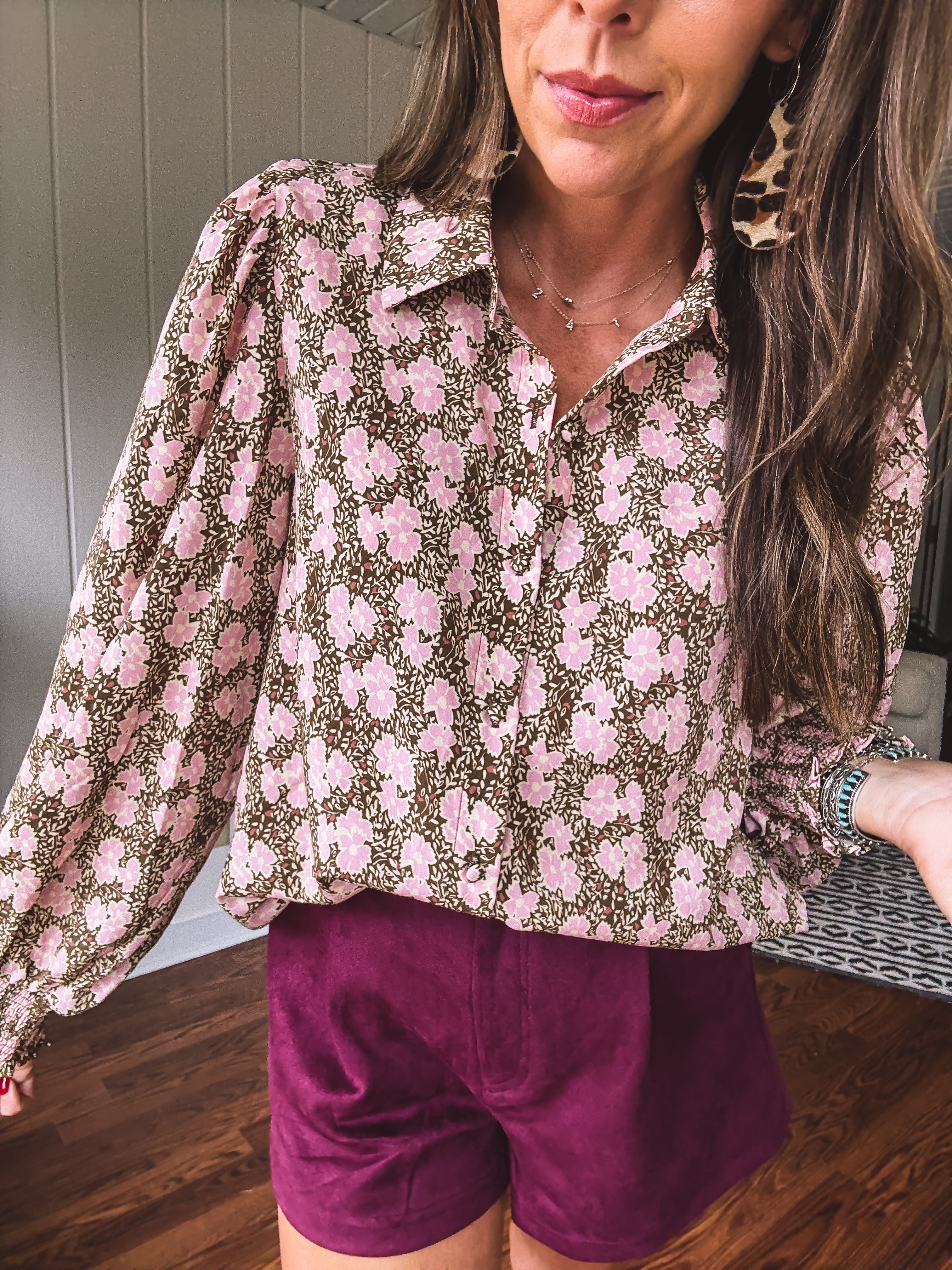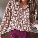 This charming blouse blends olive and blush hues with delicate florals, fabric-covered buttons, and gathered cuffs for a soft, feminine feel. Its puffed sleeves and airy, flowing fabric make it perfect for dressing up or down. Whether paired with slacks or jeans, this top effortlessly boosts your look. Layer on a crochet vest, cozy cardigan, or denim jacket to showcase your playful personal style.