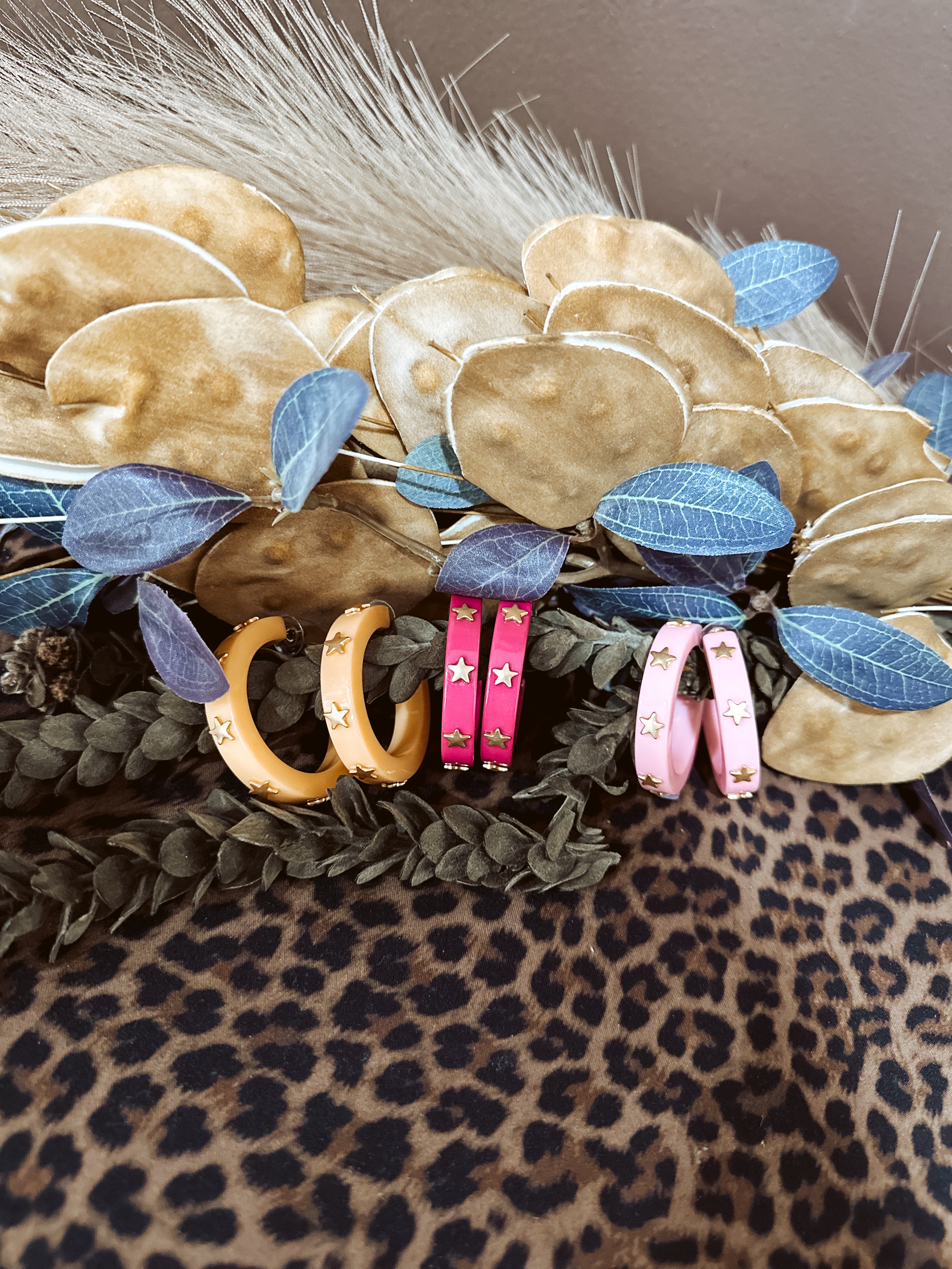 Vibrant and fun, the Darla Star Resin Hoop combines bold pink, fuchsia, and cantaloupe hues in a chunky resin design that radiates playful energy. Each medium-sized hoop sparkles with matte gold stars, adding a whimsical touch perfect for those who love to brighten their look and stand out in any crowd. Lightweight and comfortable, these earrings are the ultimate statement accessory to bring a pop of color and a dash of starry charm to your everyday style.