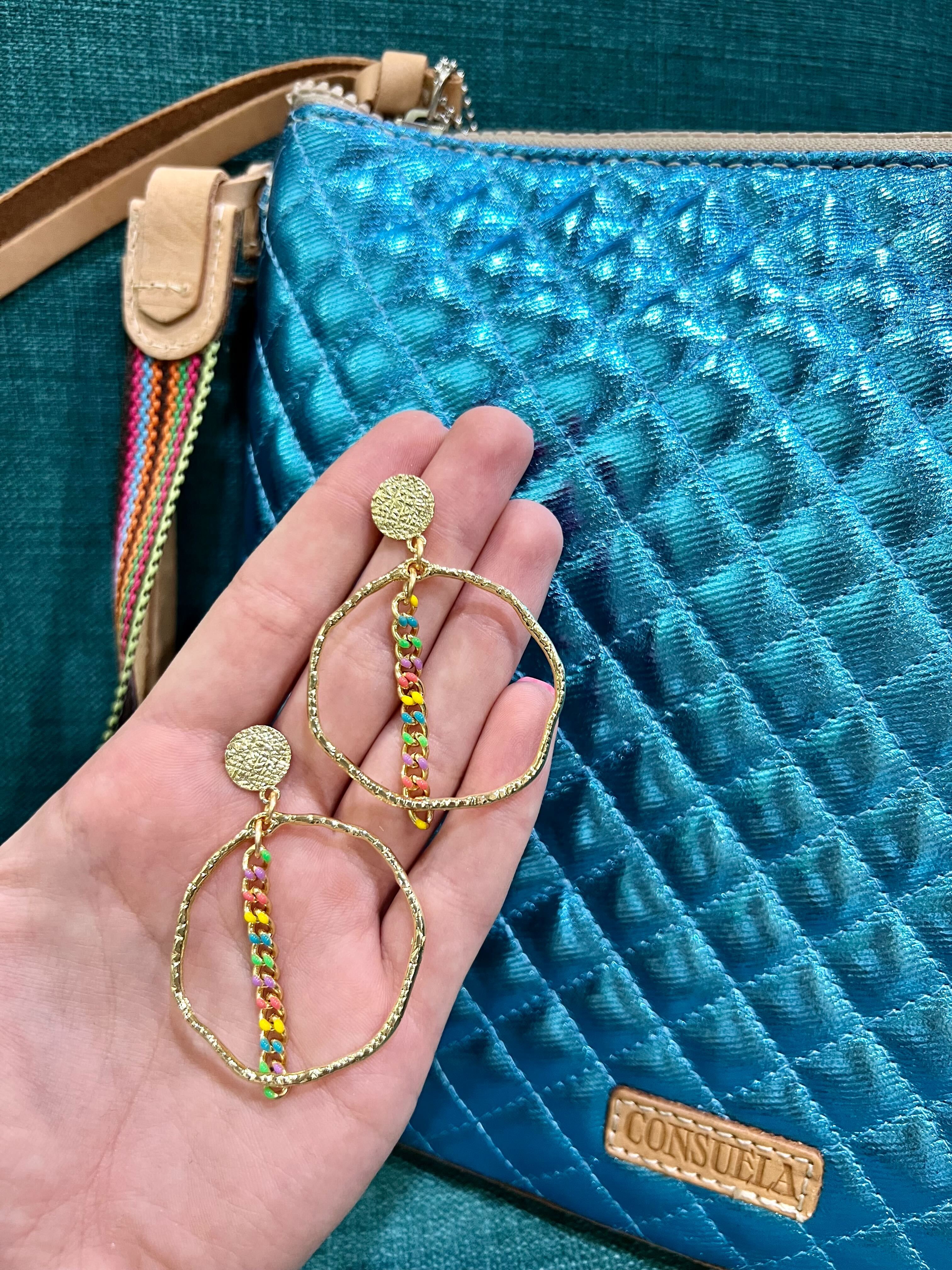 These Evelyn Hoops bring a playful twist to classic gold wire hoops with their unique octagonal shape. A vibrant multi-colored chain dangles from each stamped gold post, ensuring your look sparkles with every turn. Lightweight and eye-catching, they effortlessly add a pop of color and fun to any outfit, making them your go-to accessory for brightening up your style day or night. Perfect for those who love to mix elegant design with a splash of whimsy, these earrings guarantee you'll turn heads and catch the light wherever you go.
