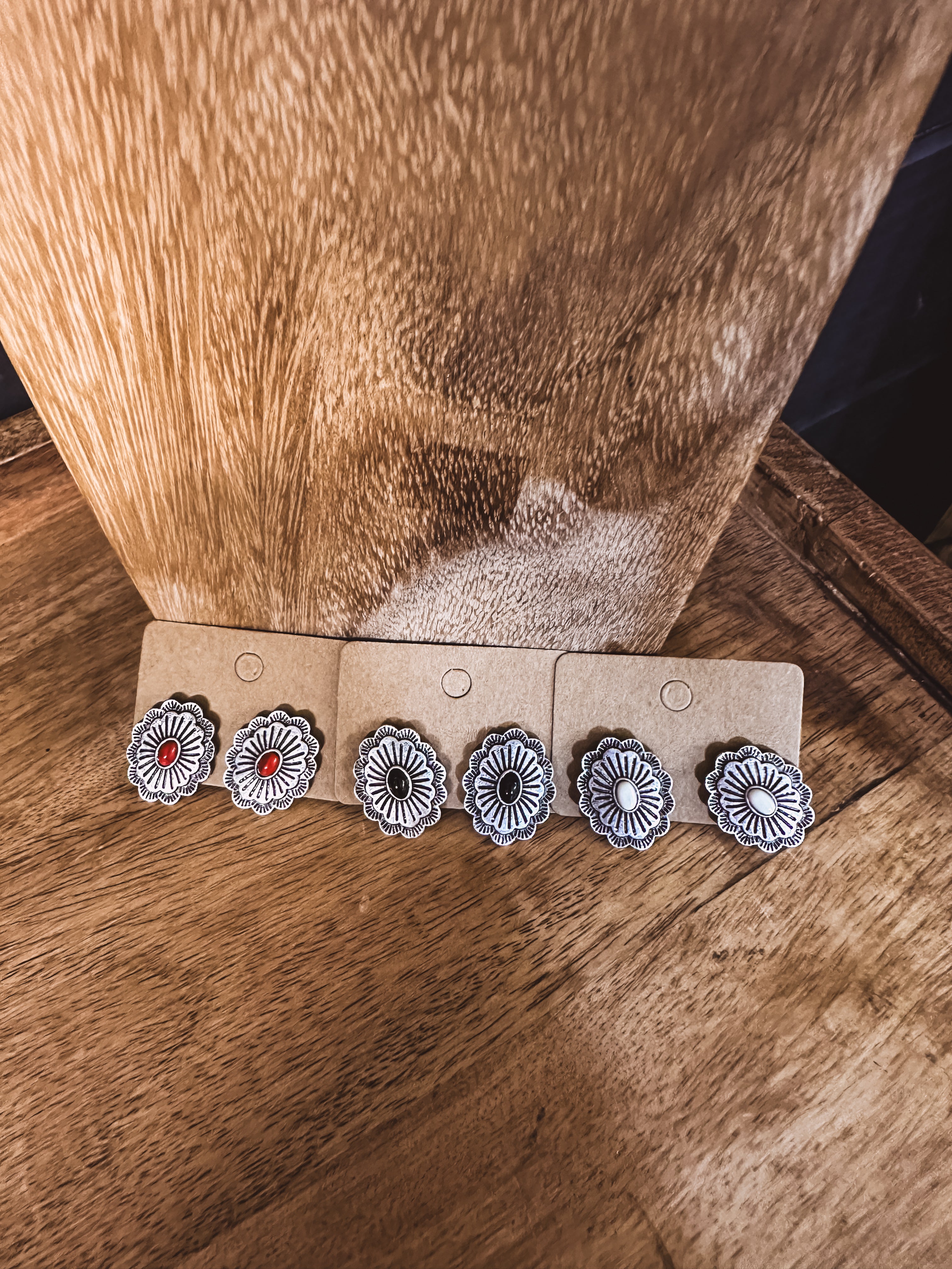 Add a dash of Western charm with these Faux Scallop Concho Post Earrings. Crafted to resemble sterling silver, they feature a scalloped edge and a sparkling center stone available in black, red, or white, bringing bold color to your look. These medium-sized posts strike the perfect balance between statement and subtlety, making them your go-to accessory for everyday fun or a night out. Enjoy the spirit of the West with a playful twist—without paying a cowboy’s ransom!