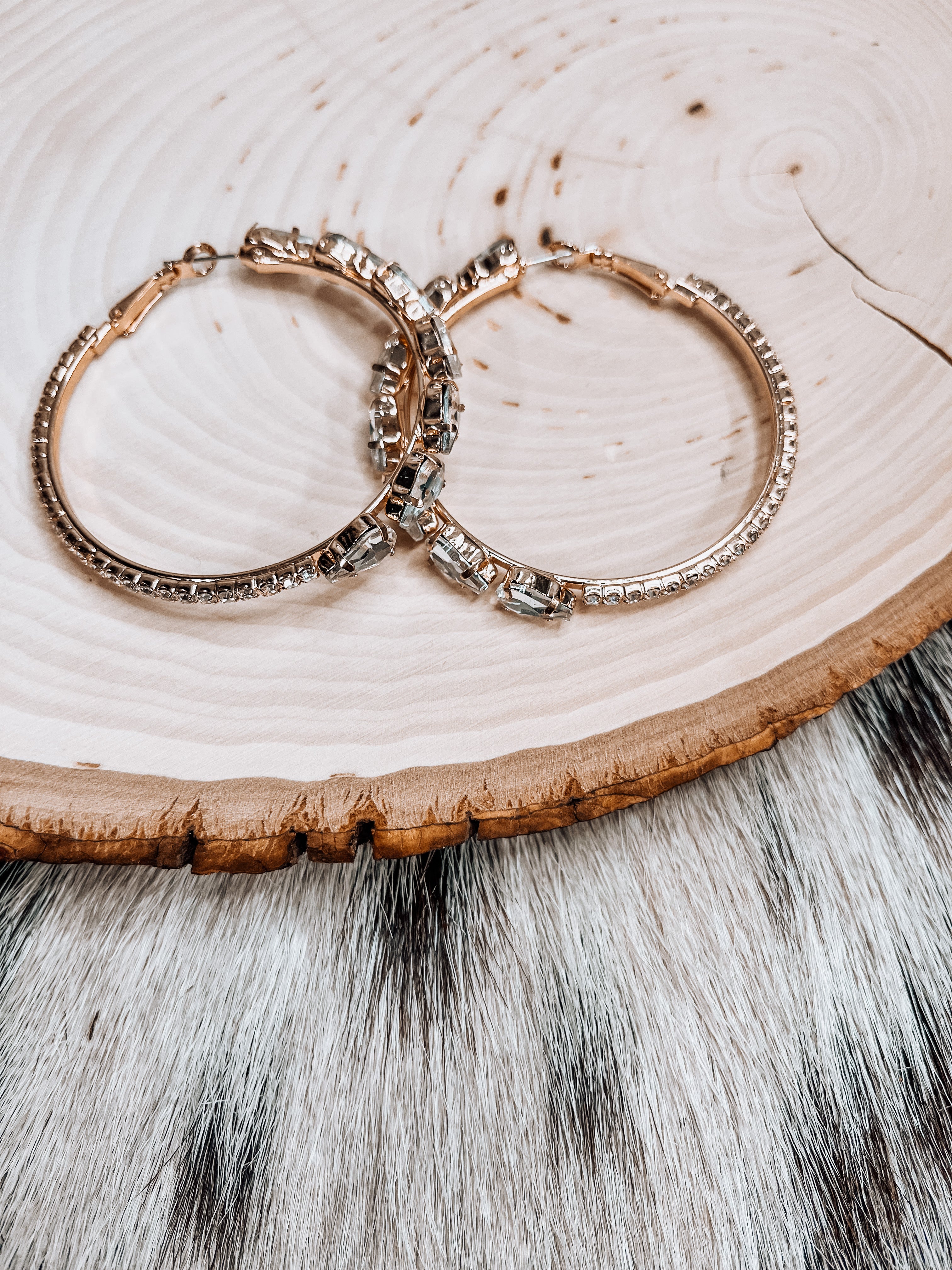 Make a dazzling statement with these Glam Gold Teardrop Rhinestone Hoops! These large faux gold hoops sparkle brilliantly with rhinestones lining every curve, while bigger stones strategically placed on the hinge back add extra sparkle to catch everyone’s attention. Perfect for turning heads at parties or adding a touch of glam to your everyday look, these teardrop earrings blend bold style with easy wearability. Get ready to shine and show off your playful side with this must-have accessory!