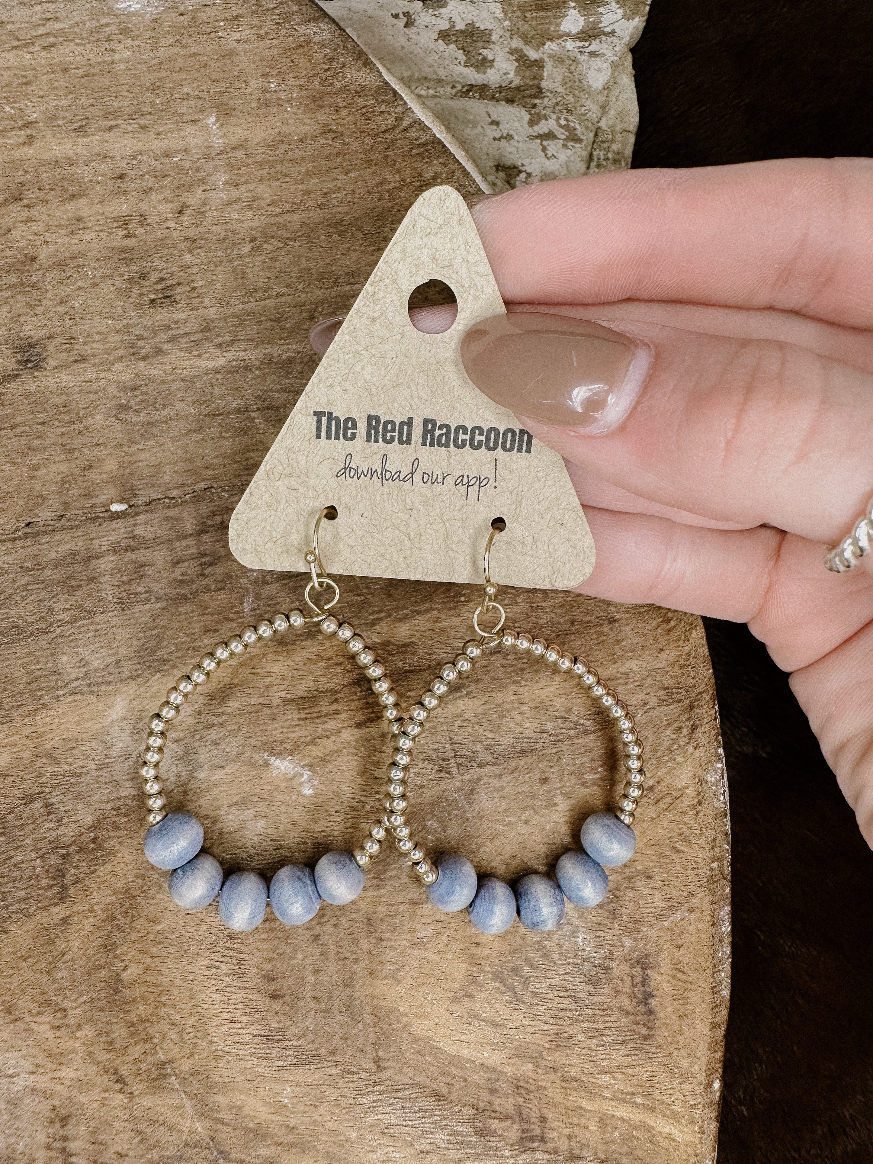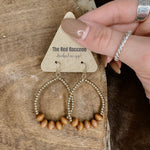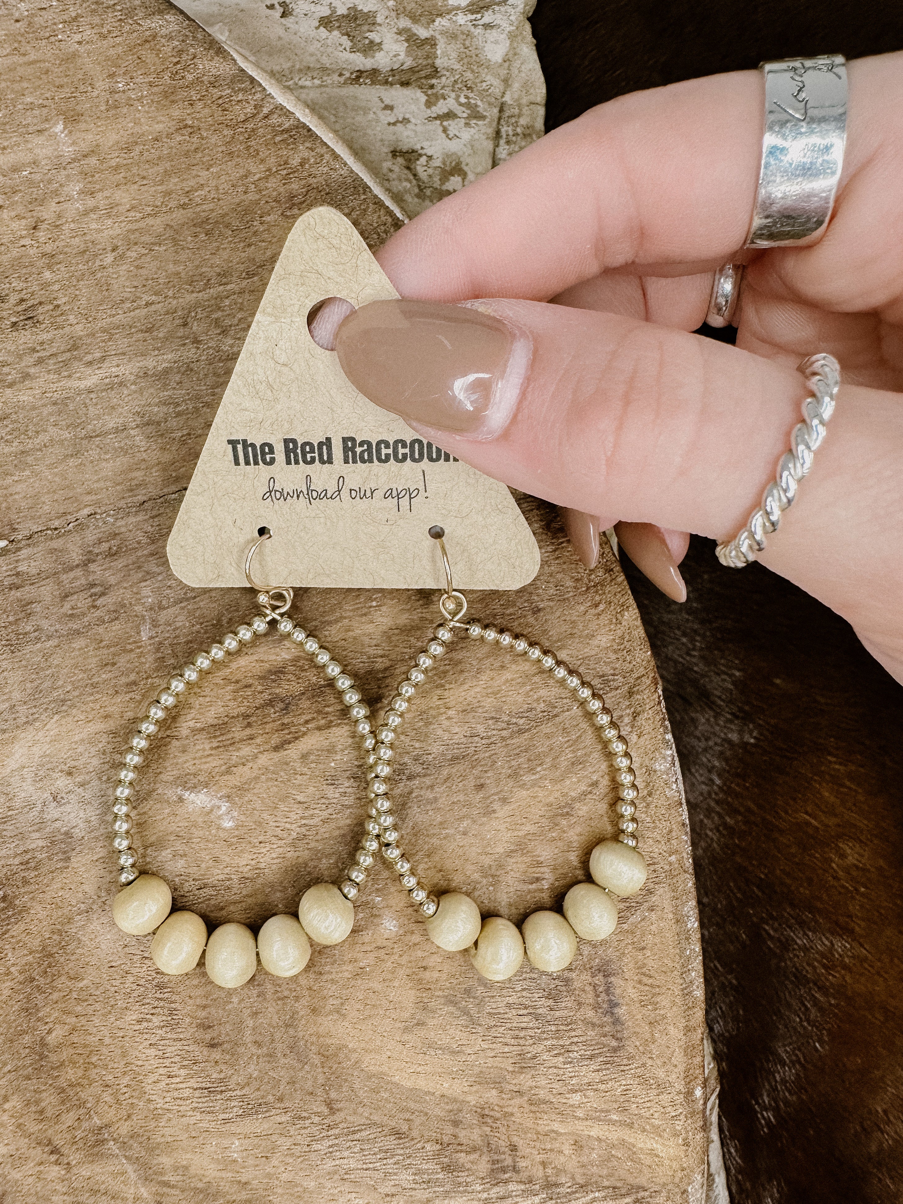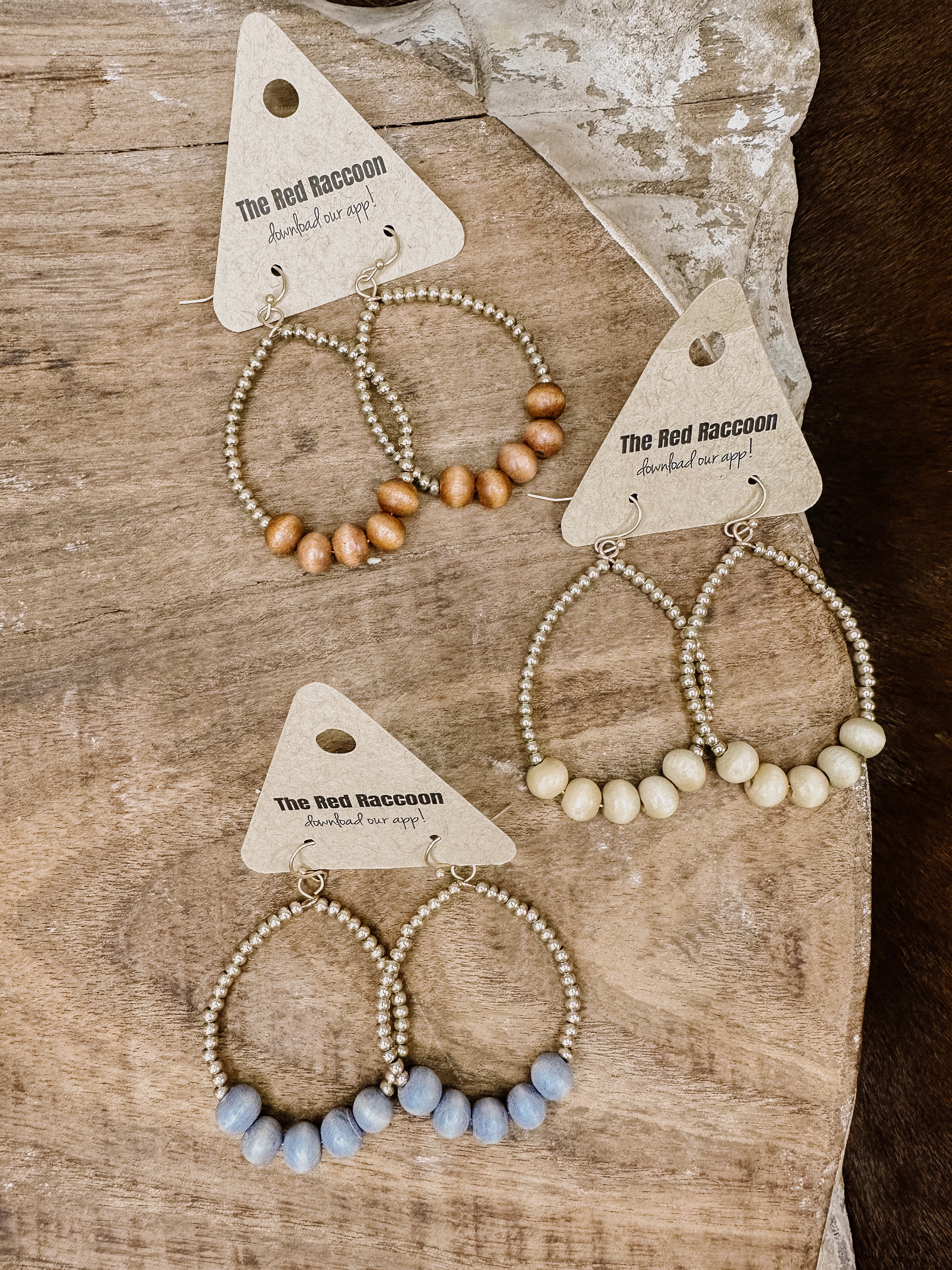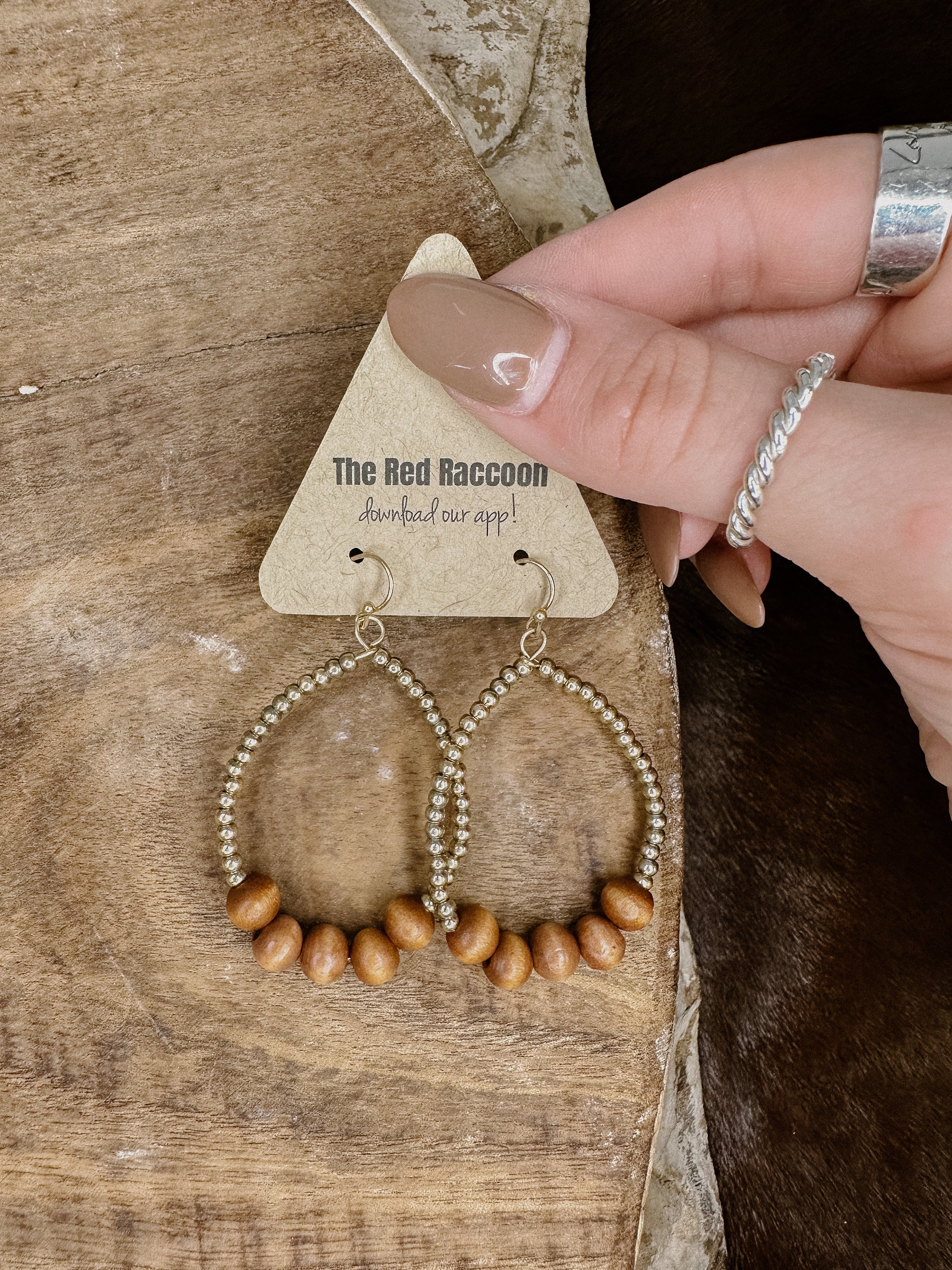 Elevate your style effortlessly with these medium-sized teardrop earrings, crafted from delicate wire and wrapped in soft, muted gold beads. Accented with charming colored wood beads, these earrings bring a natural, earthy vibe that pairs beautifully with any outfit. Lightweight and versatile, they’re perfect for layering or wearing solo for a subtle pop. Choose your favorite from warm cognac, fresh natural, or cool grey shades to match your mood or occasion. Fun, flirty, and easy to wear, these earrings are destined to become your new everyday favorite!