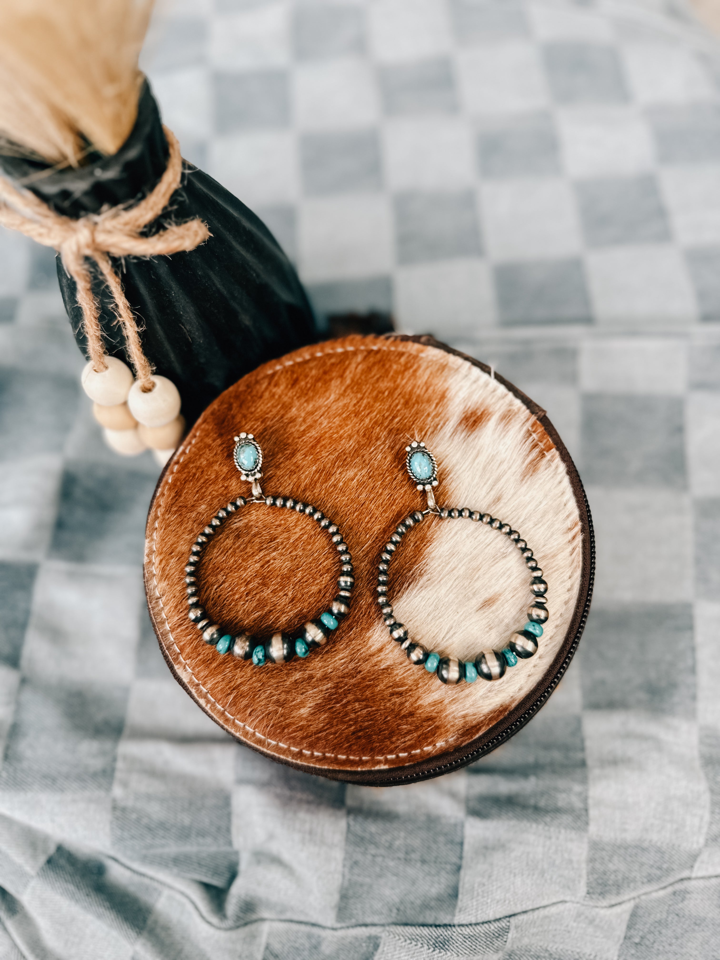Indulge in the luxurious beauty of these exquisite earrings handcrafted with genuine Sterling Silver Navajo Pearls and vibrant Kingman Turquoise stones. The intricate rope pattern Sterling Silver mount and vintage-inspired design add a touch of elegance to your Bougie, Western style. Don't miss out on owning these stunning statement pieces.