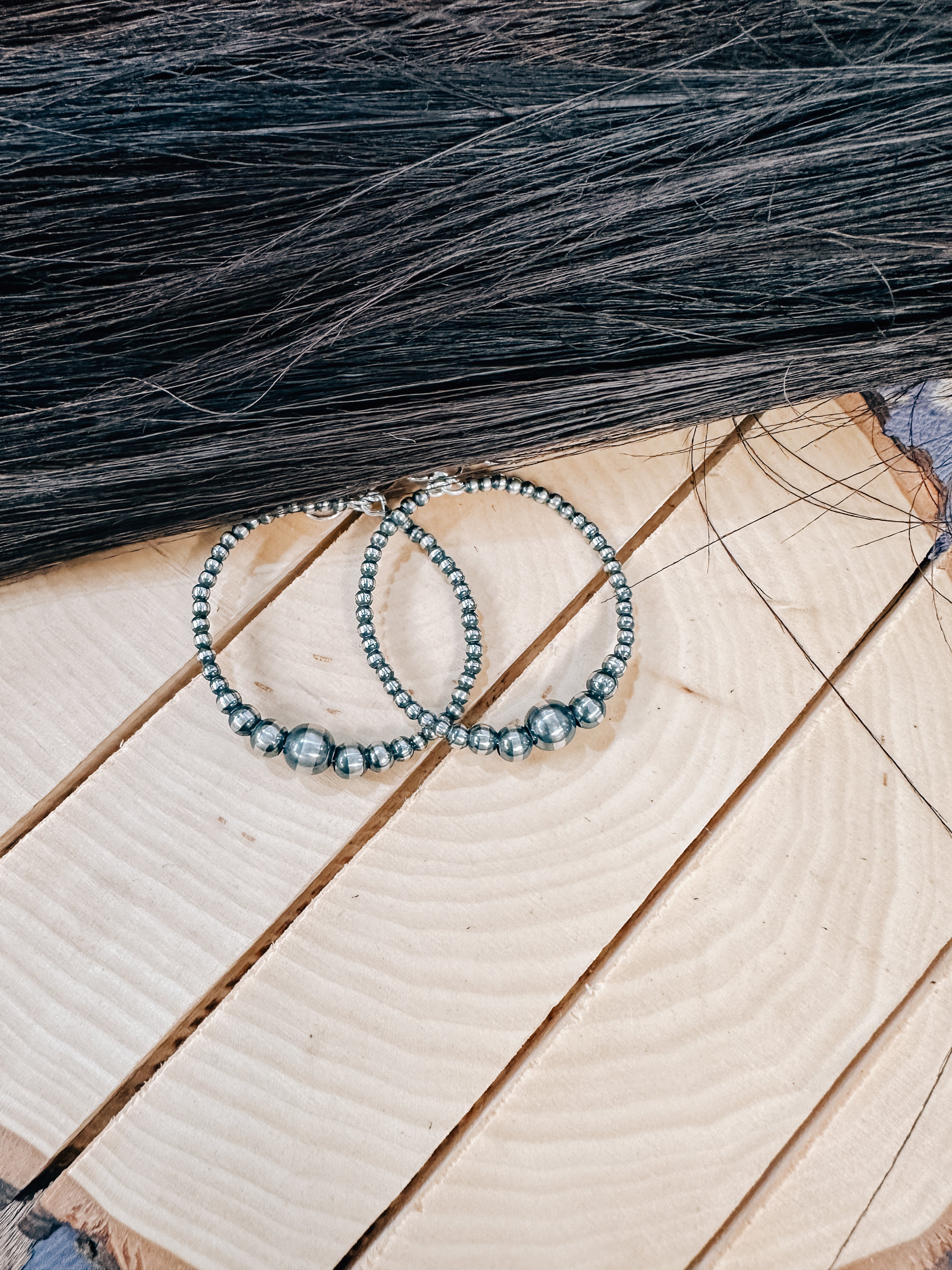 Experience the beauty of Authentic Navajo Pearl Earrings in an iconic ombre style. These sterling silver beads gracefully graduate from small to large to small, elegantly dangling from a shepherd's hook design. Versatile and stylish, these lightweight earrings are the perfect finishing touch for any outfit. Be on trend and feel put together with these stunning beauties!