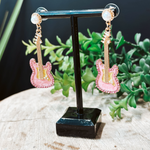 Girls just wanna have fun in these Pink Guitars Post Earrings, designed to bring a playful pop of color and sparkle to any outfit. Each earring showcases a pink pearlescent resin guitar outlined with shimmering pink crystals, accented by a dazzling gold neck and delicate pearl tuning pegs. Dangling from a large, classic pearl post, these extra-large earrings are sure to catch eyes and elevate your style wherever you go. Perfect for music lovers and fashion enthusiasts alike, they add a bold, fun statement that’s impossible to ignore. Get ready to rock your look with charm and sparkle!