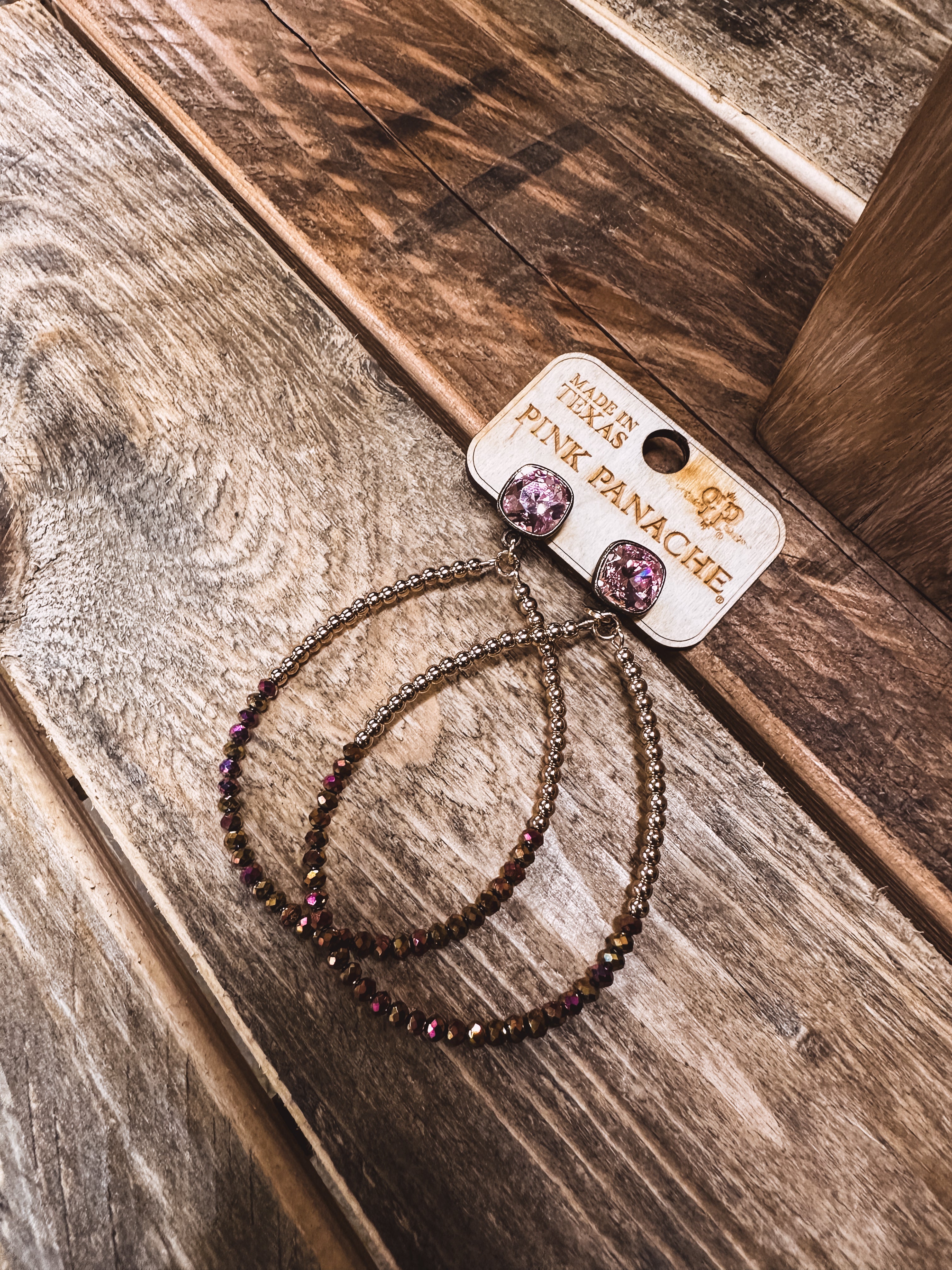 Add a burst of color and shimmer to your ensemble with these playful Purple Bronze Gold Hoops. Featuring a dazzling blend of purple and bronze stones, accented by antique bronze stones on the upper half, these hoops dangle gracefully from a sparkling square purple stone set on a post back. Their unique design is meant to turn heads and sprinkle a touch of sparkle on any outfit, making them the perfect accessory to brighten your day and lift your style with just the right amount of flair.