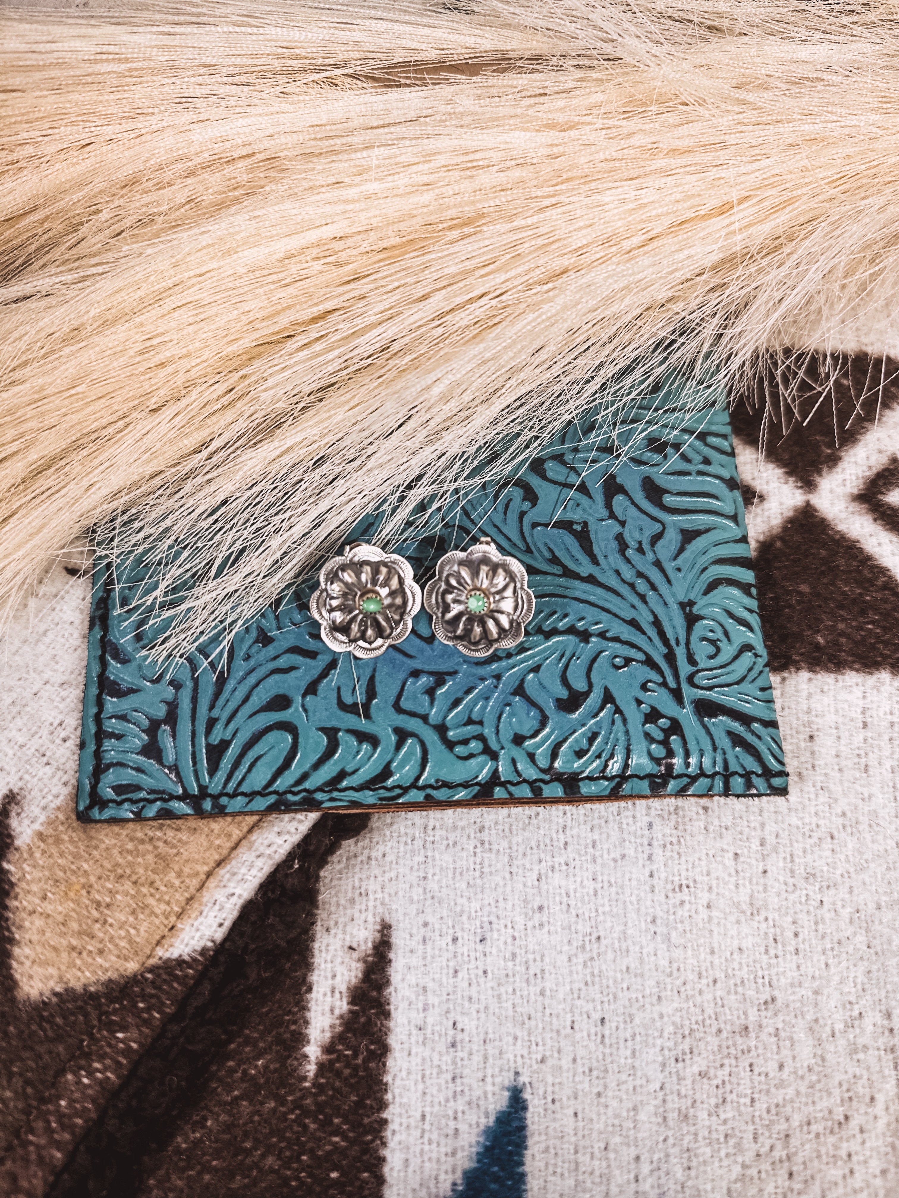 These Retro Concho Stud + Turq Stone Earrings offer a perfect balance of simplicity and vintage charm. The concho design setting adds a touch of Western elegance while the genuine Kingman Turquoise center stone brings a pop of color. Perfectly lightweight yet large enough to make a statement. Embrace the timeless appeal of these earrings and elevate any outfit.
