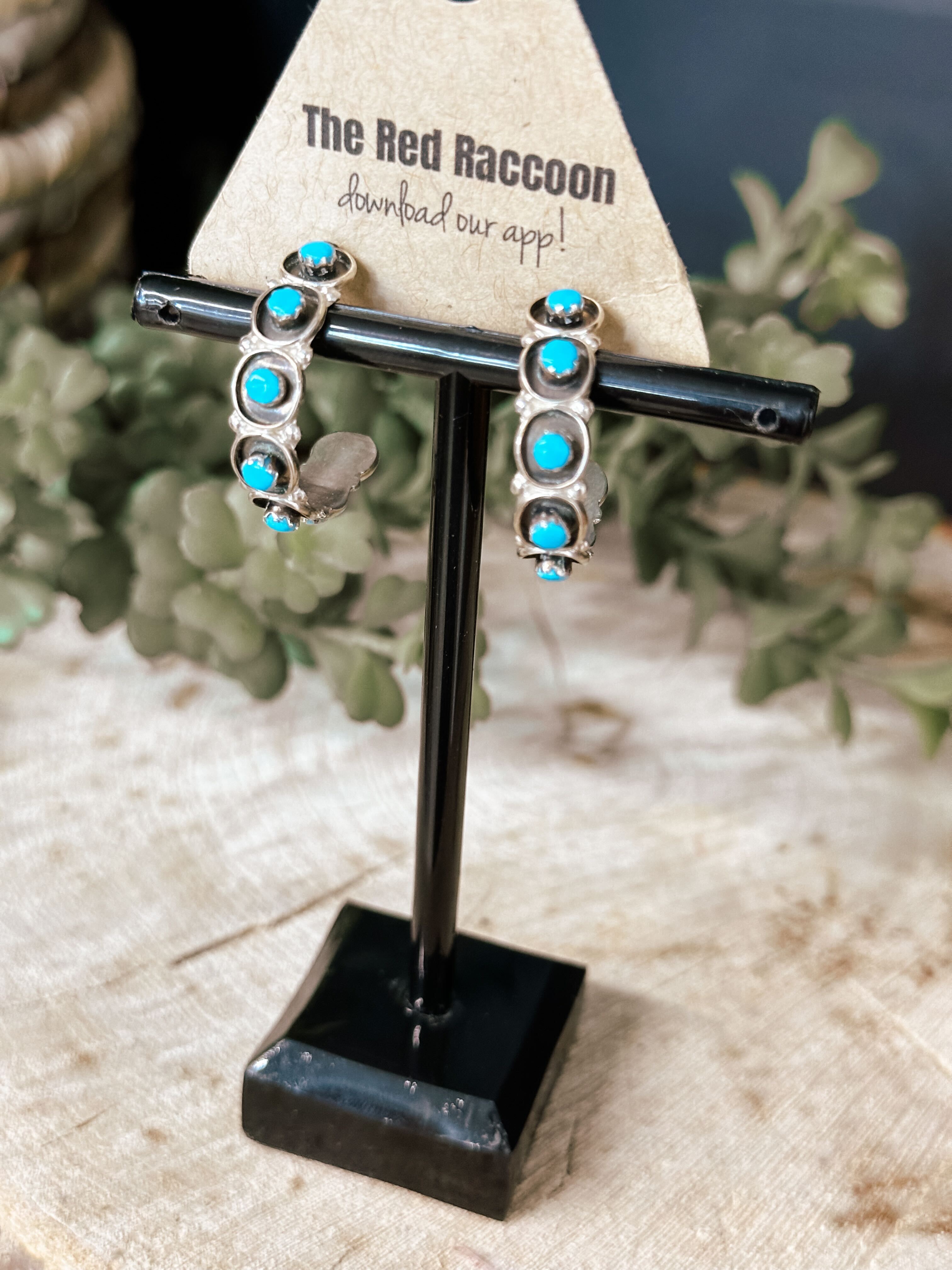 Experience the stunning beauty of Authentic Kingman Turquoise stones set in oxidized, genuine Sterling Silver. The intricate design highlights the vibrant color of the Turquoise, making it a must-have addition to any collection. These lightweight half hoop earrings are ideal for those who desire a more subtle look, but still crave the luxurious vibe. Upgrade your style today with these exquisite earrings!