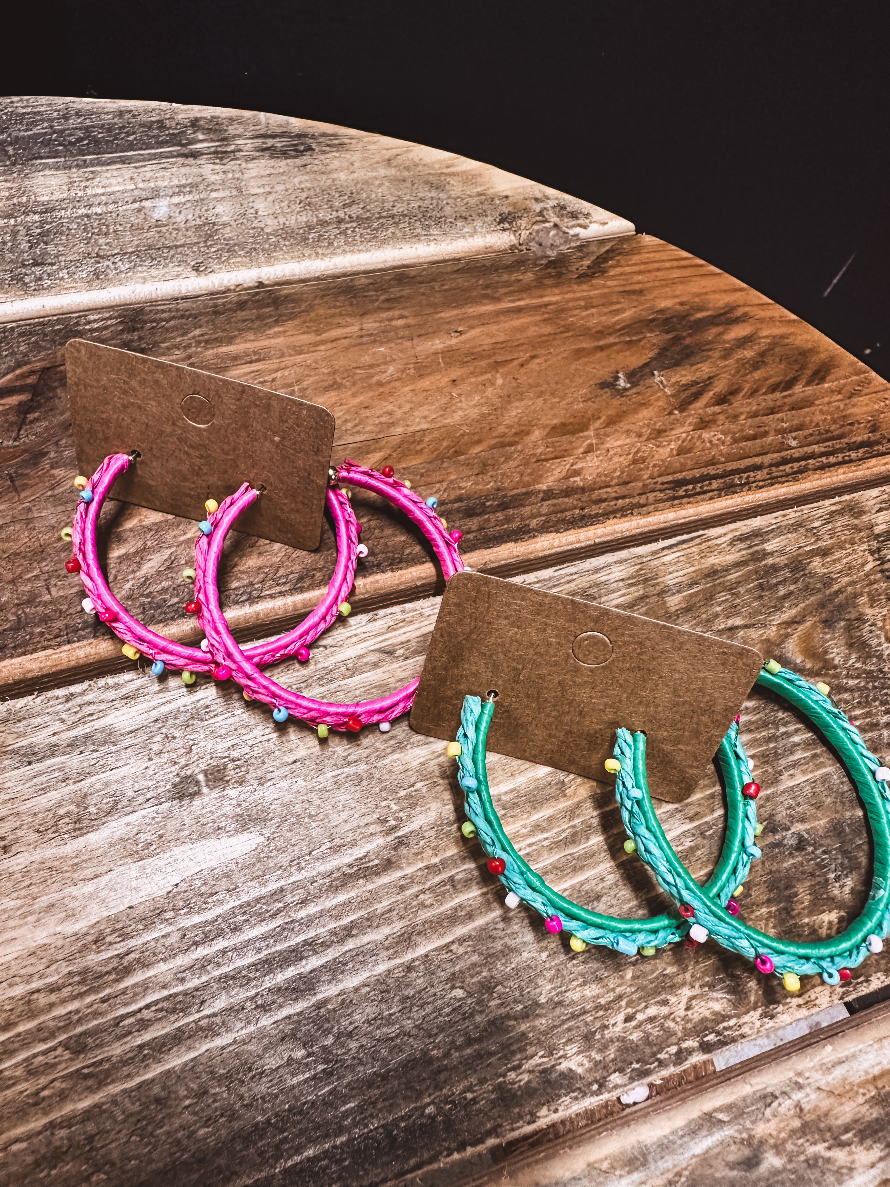 Add a splash of fun to your outfit with the Spring Fling Beaded Hoop earrings. These bold, medium-sized hoops are decorated with vibrant multi-colored beads wrapped around a secure post back, making them both eye-catching and comfortable to wear. Perfect for brightening up any look, they bring playful energy and a splash of color whether you choose the lively pink or the refreshing teal option. These hoops are ideal for those who love to stand out and add a cheerful twist to their style every day.