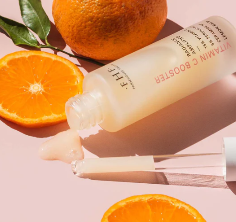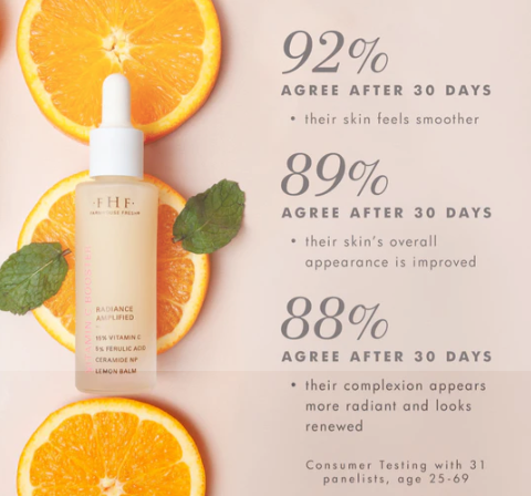 • Enhance your complexion with our Vitamin C and Ferulic Acid-infused radiance booster, designed to revitalize dull, uneven skin.