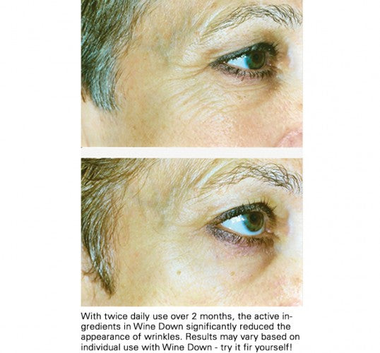 - At night, the powerful ingredients in Wine Down® work while you sleep, reducing the appearance of fine lines and shrinking pores with a natural blend of veggies and unripened fruit.