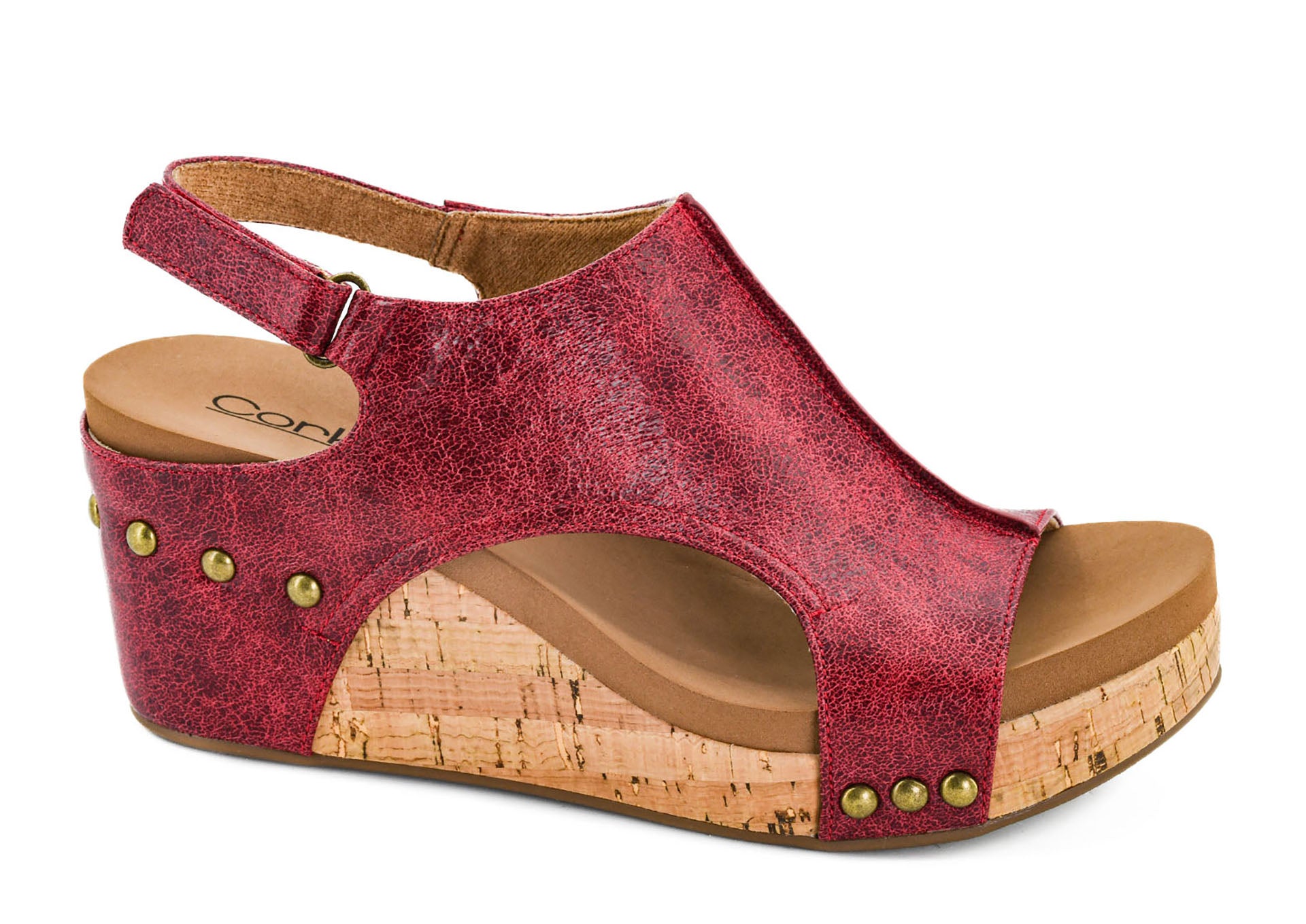 The beloved Carley wedge returns with even more flair! Featuring a deep red crackle-textured vegan leather and bold stud details, this sandal combines edgy style with ultimate comfort. Its cushy footbed, lightweight cork platform, and adjustable velcro strap make it perfect for all-day adventures. Whether paired with jeans or dresses, these wedges add the perfect pop of height and personality to any look.