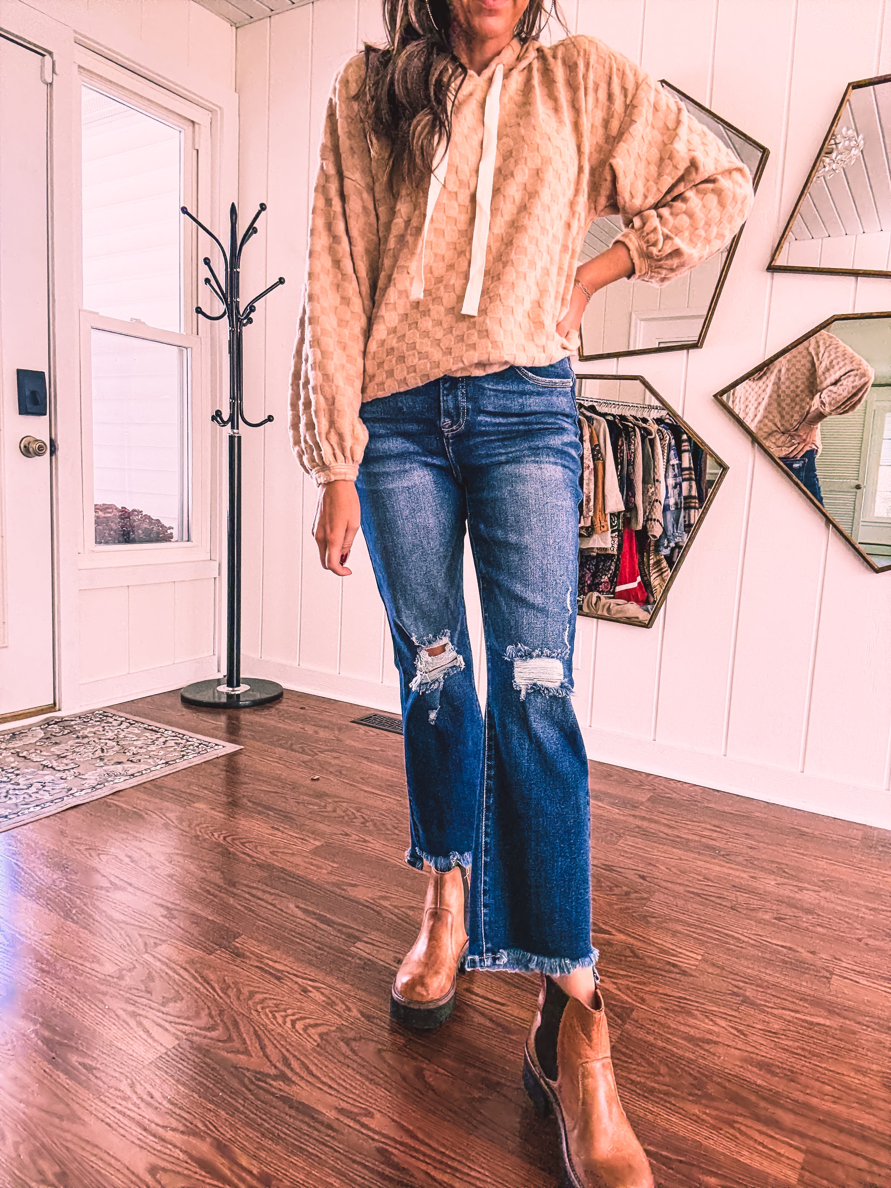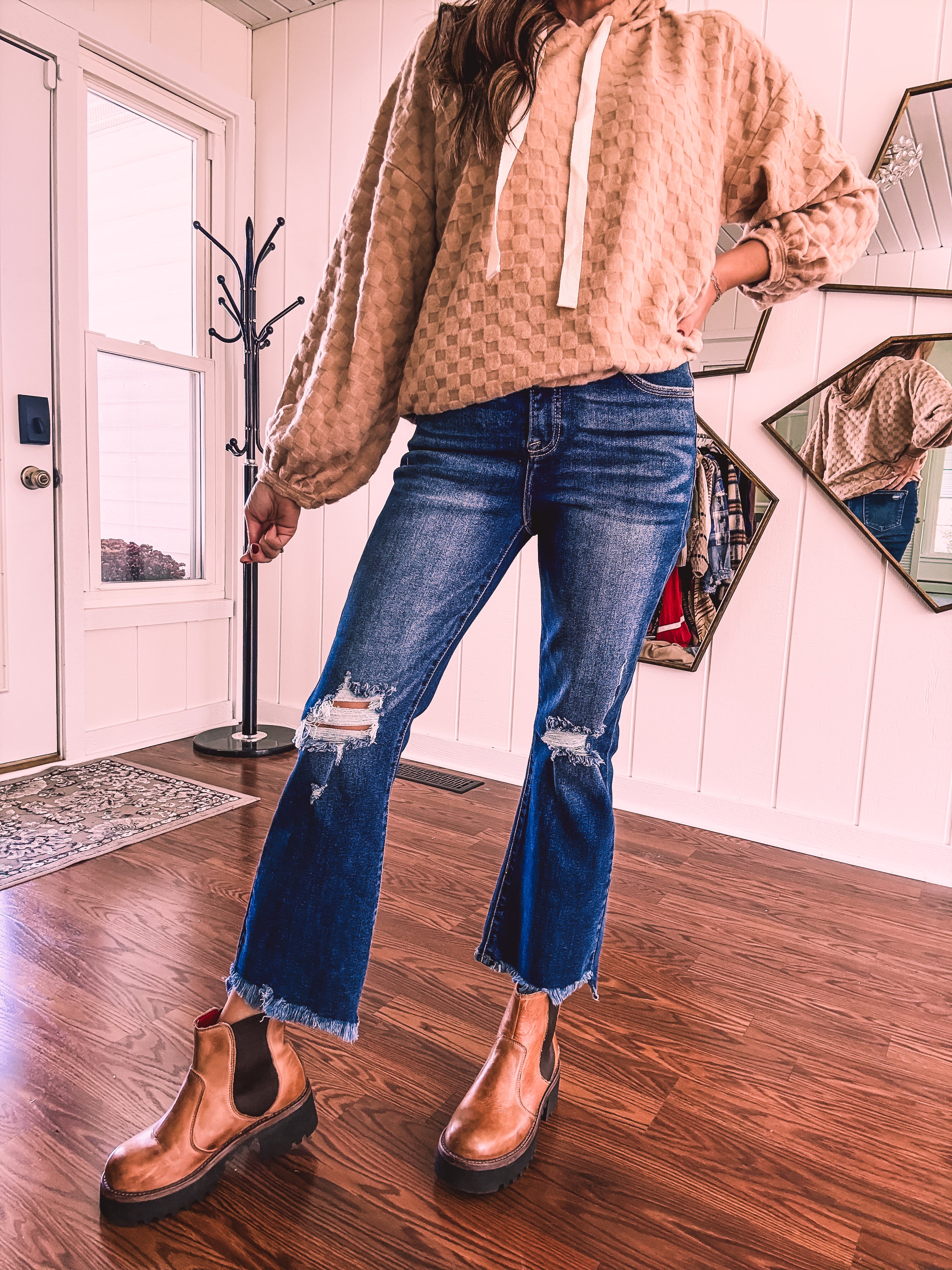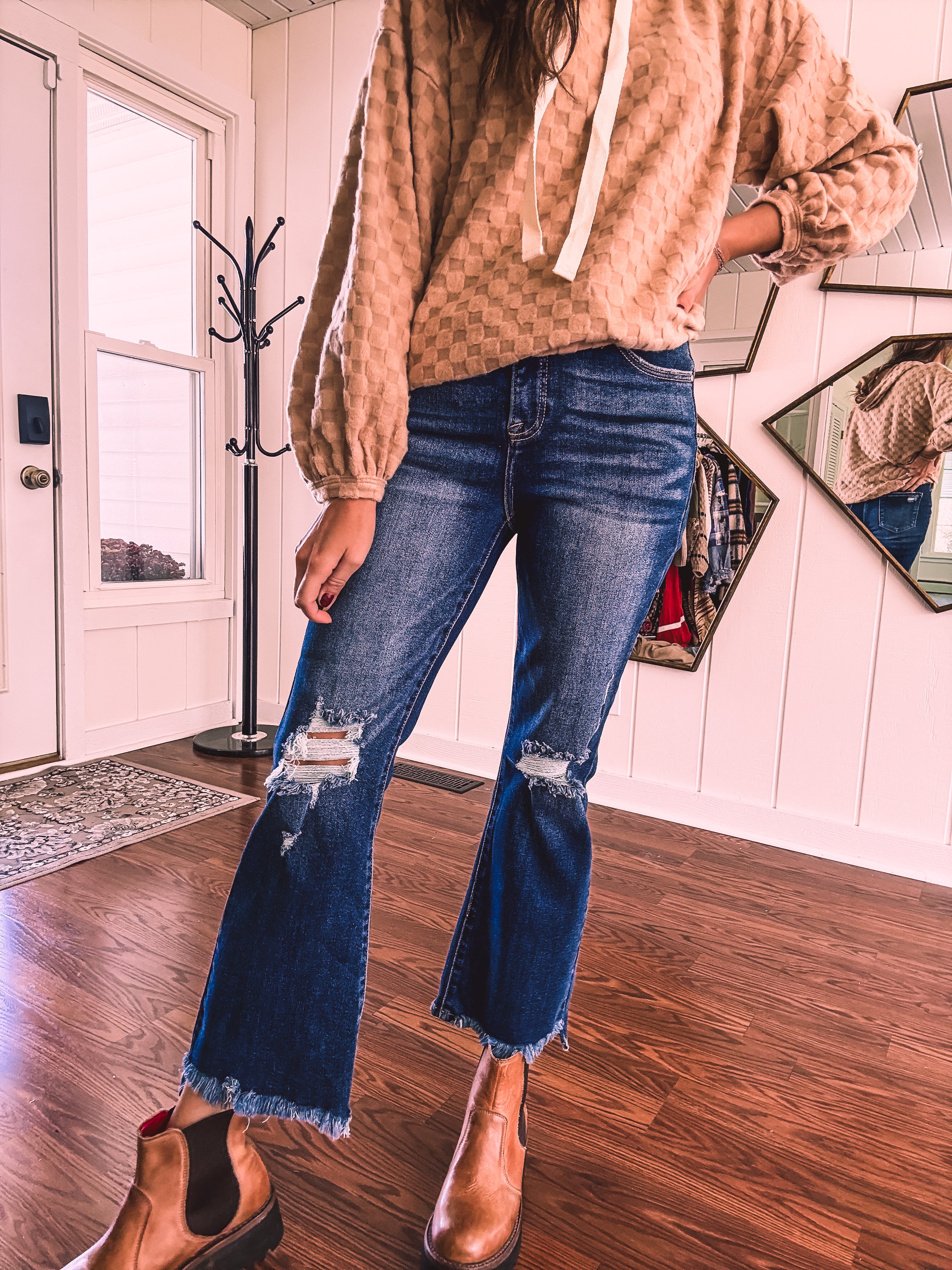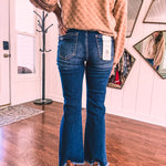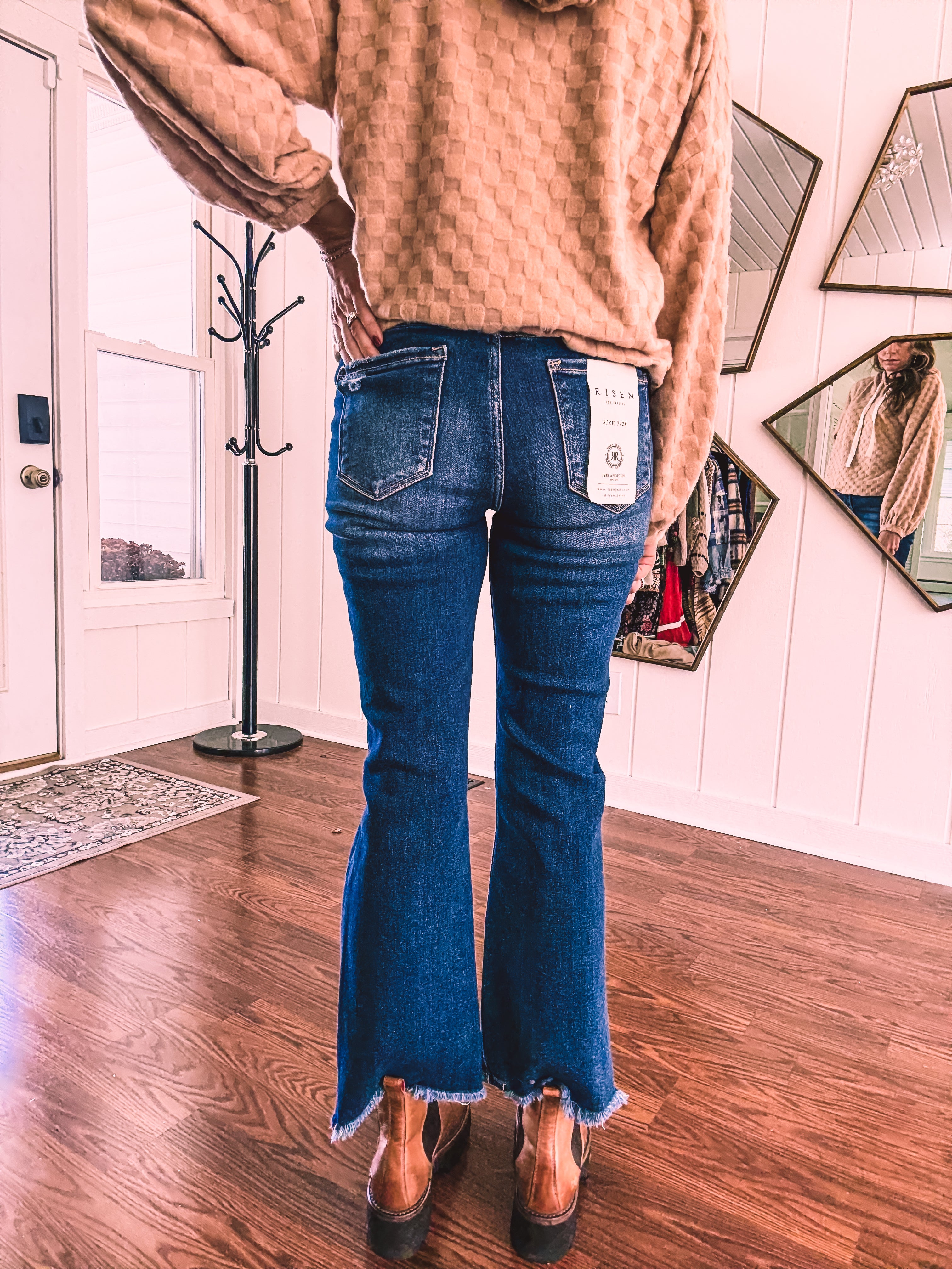 Rock a look that's equal parts edgy and effortless with these high-rise Risen jeans. The dark wash pairs perfectly with strategic knee distressing and a cropped flare hem that flatters your figure while keeping things fresh. Whether you're heading out for a night on the town, catching up with friends, or just living your best life, these jeans deliver that perfect blend of comfort and style that makes you feel unstoppable.